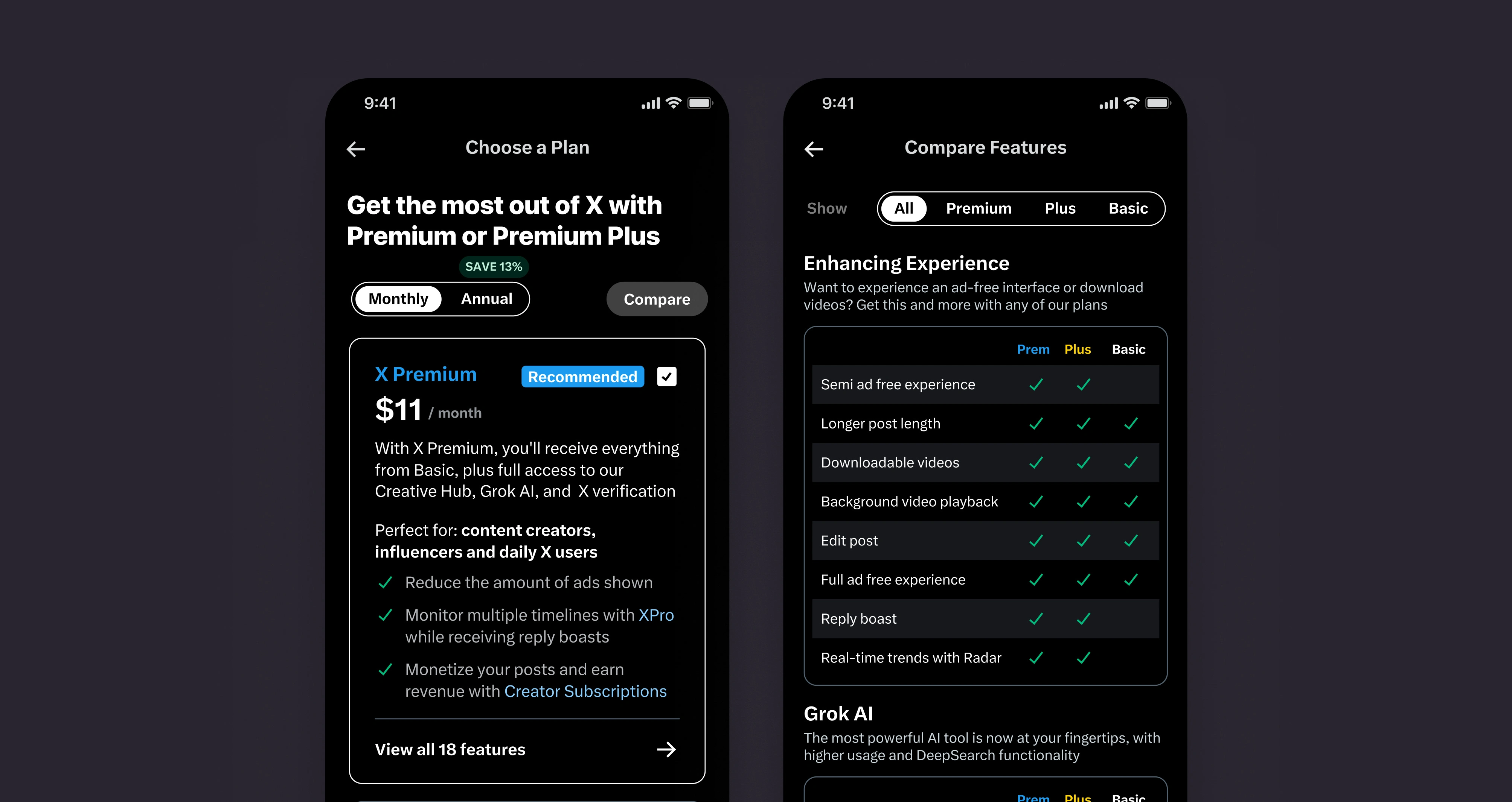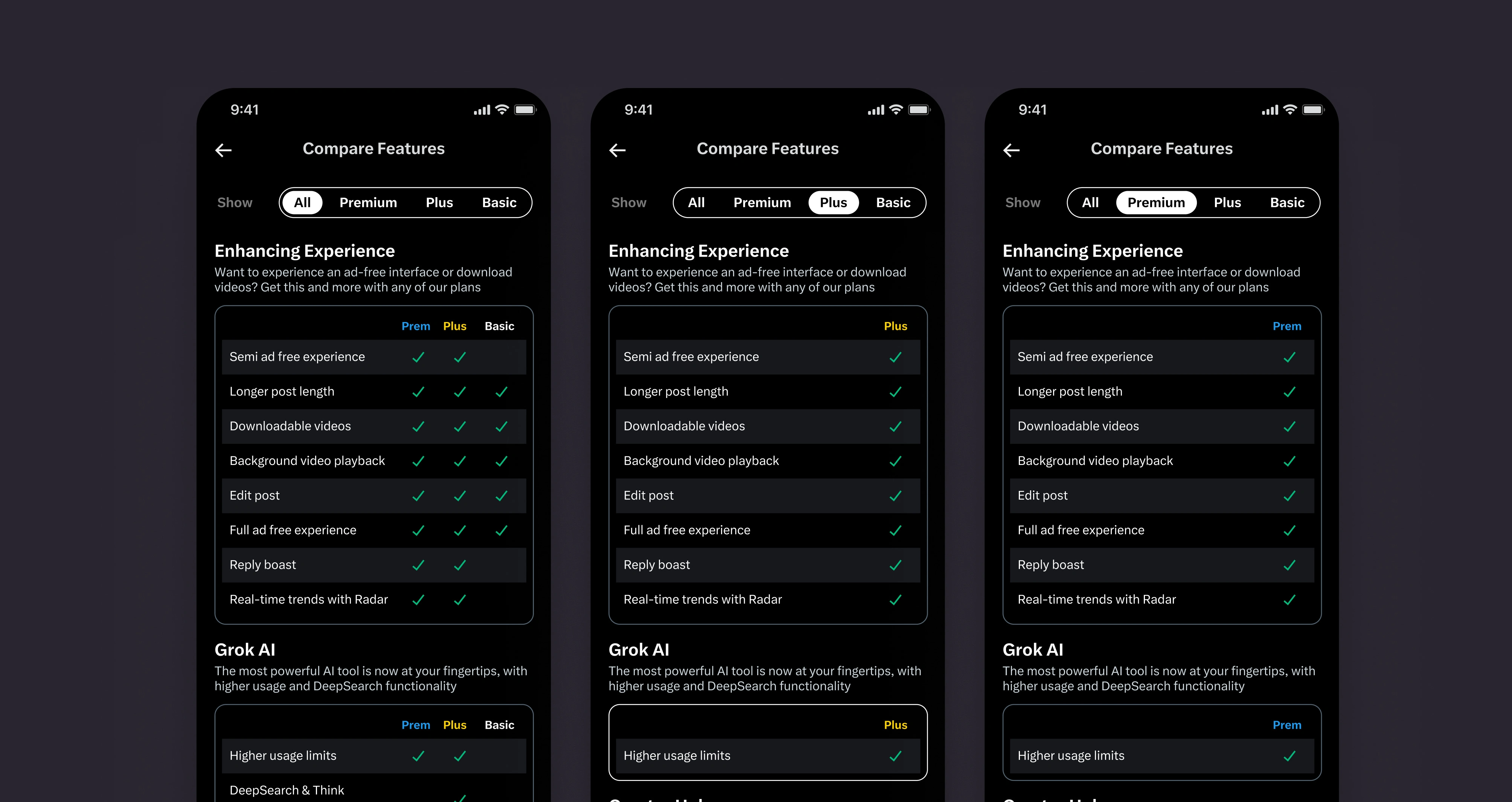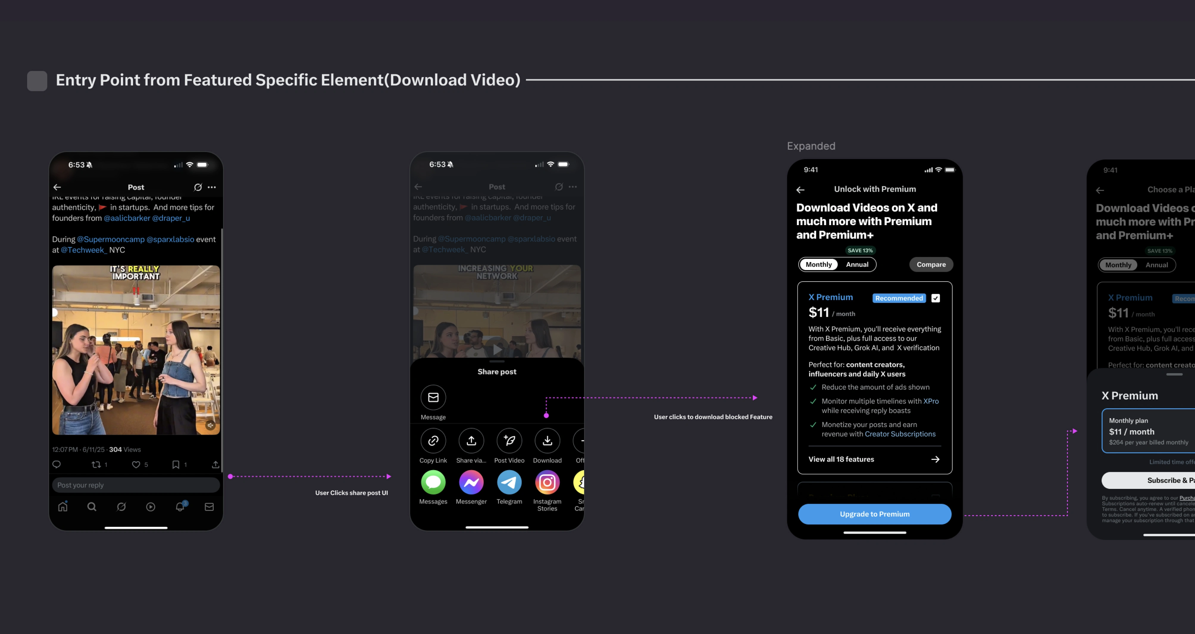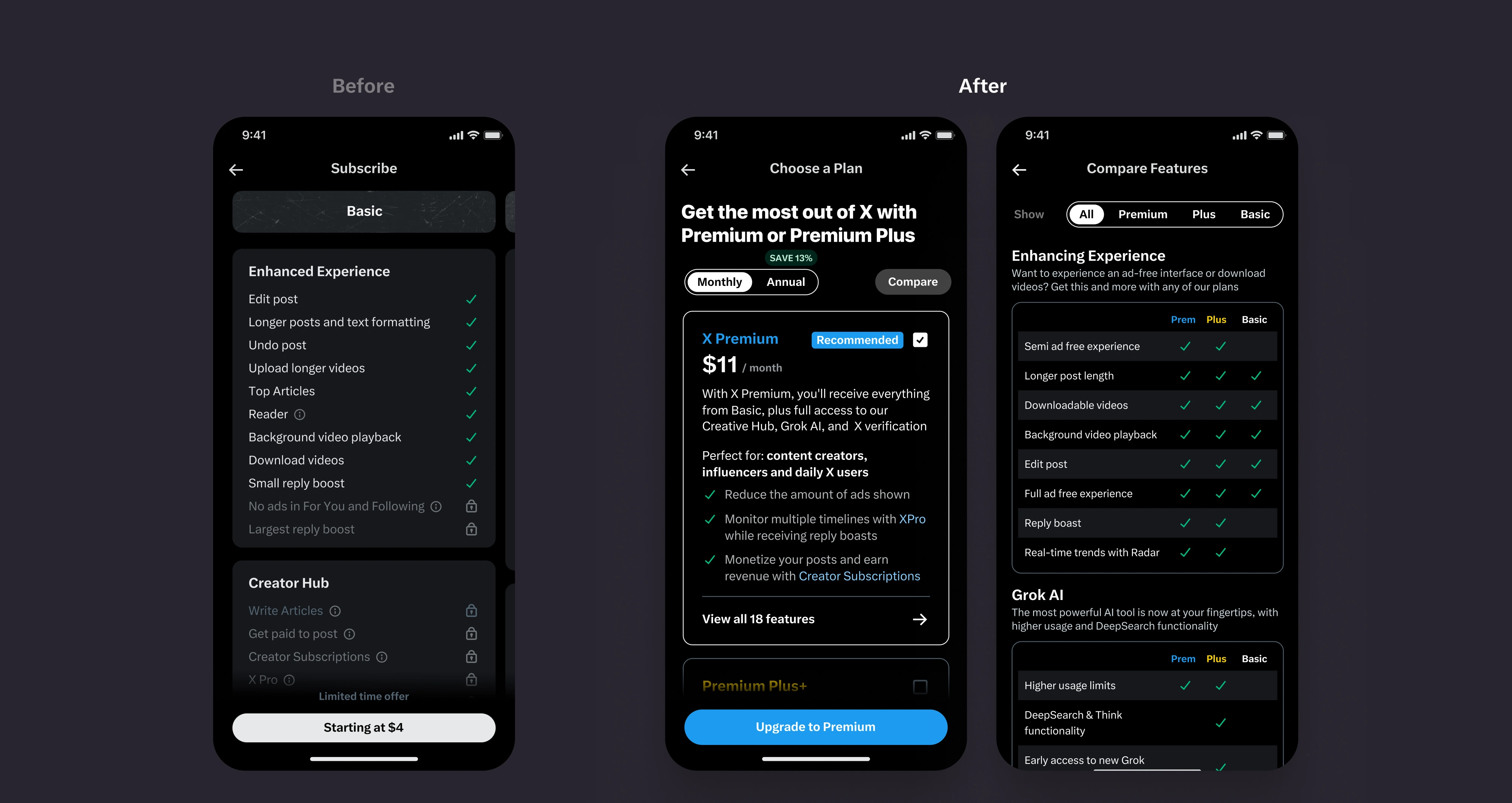 X.com with Premium Plus features. After taking a full UX audit of the current twitter workflows across responsive web and native mobile experiences, I also researched various high traffic paywall experiences, both directly and indirect competitors prior to conceptualizing a design.