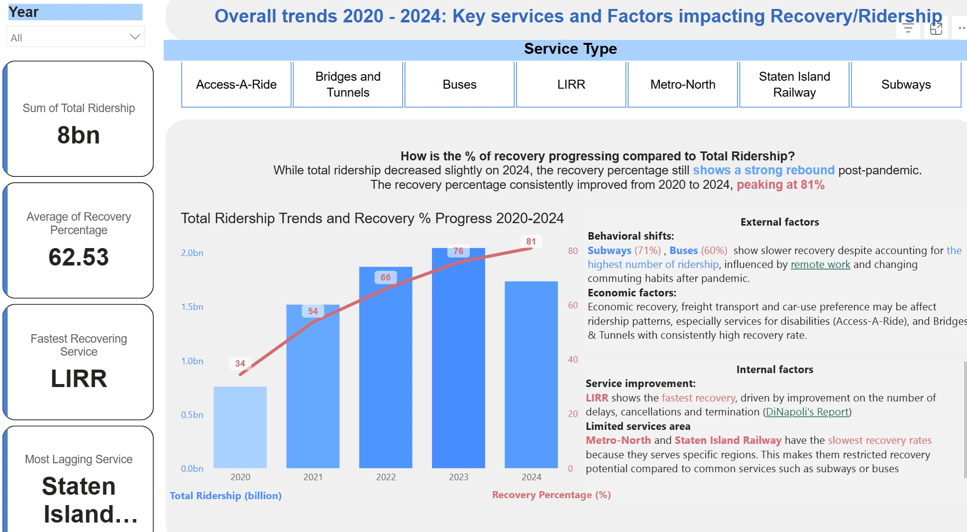 This analysis provides an overview of the current operational status of MTA services after pandemic, with a focus on number of ridership/trips and recovery metrics. Overall, the recovery percentage consistently improved by 62.53% on average from 2020 to 2024, peaking at 81%. While total ridership decreased slightly on 2024, the recovery percentage still shows a strong rebound post-pandemic. Across MTA service types, LIRR shows the fastest recovery, while Staten Island Railway has the slowest recovery