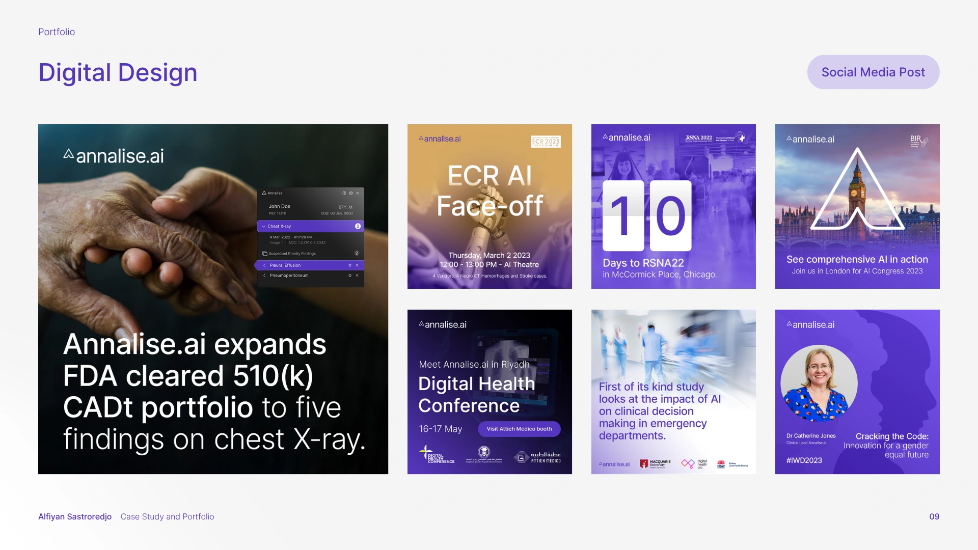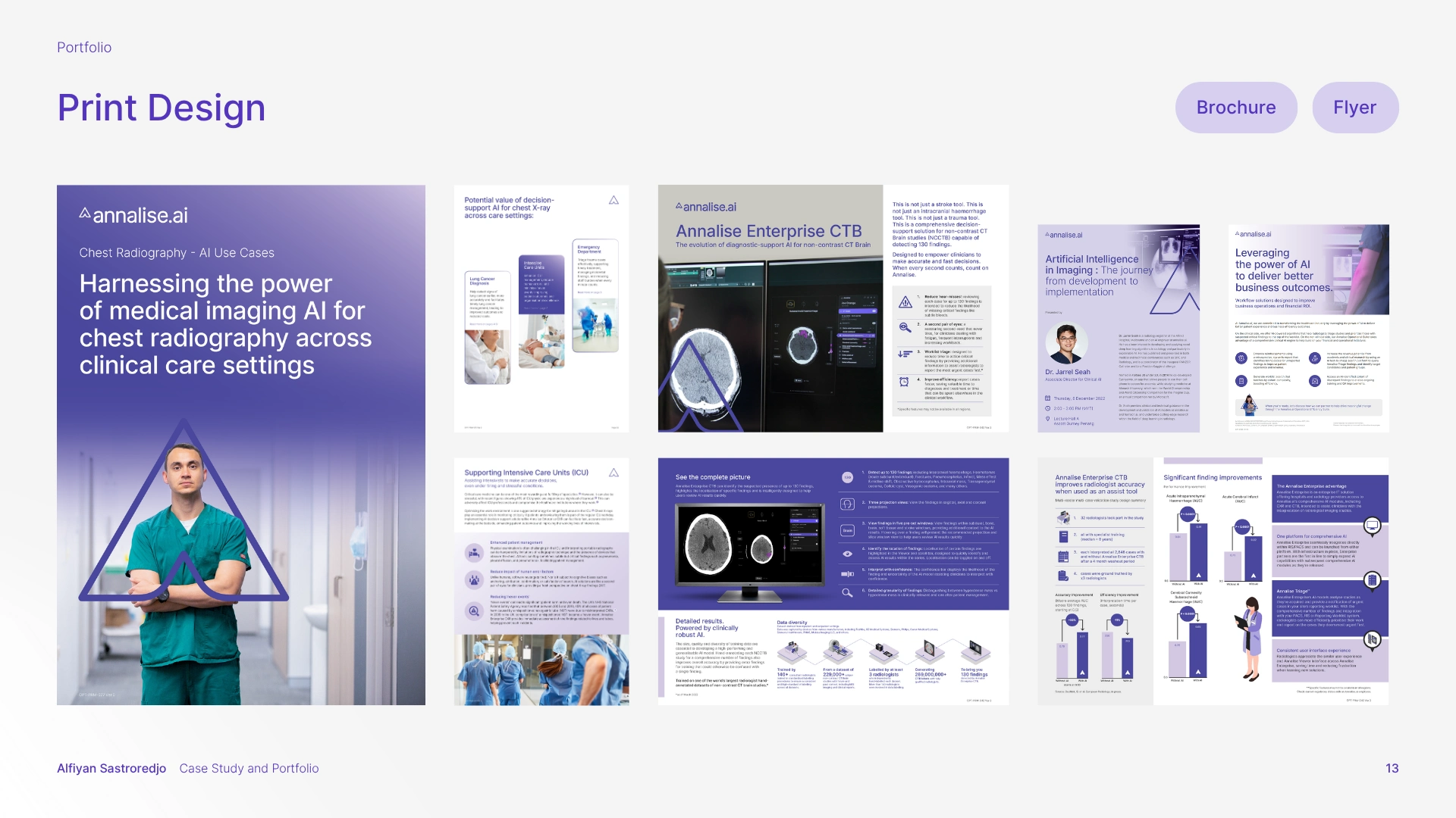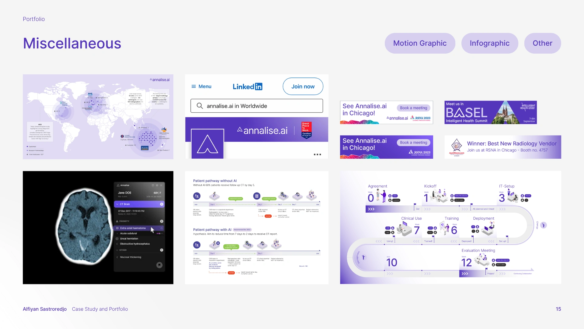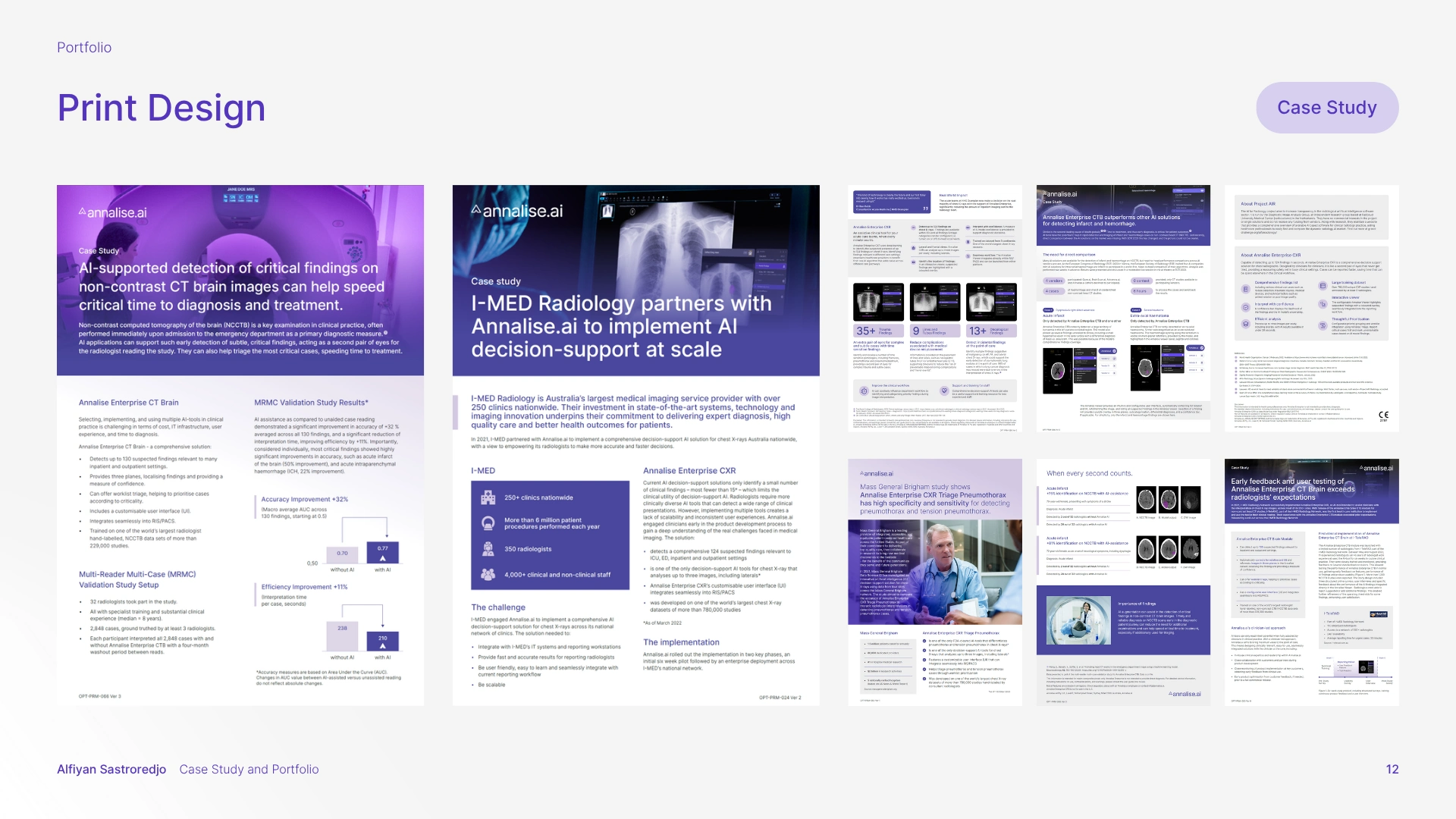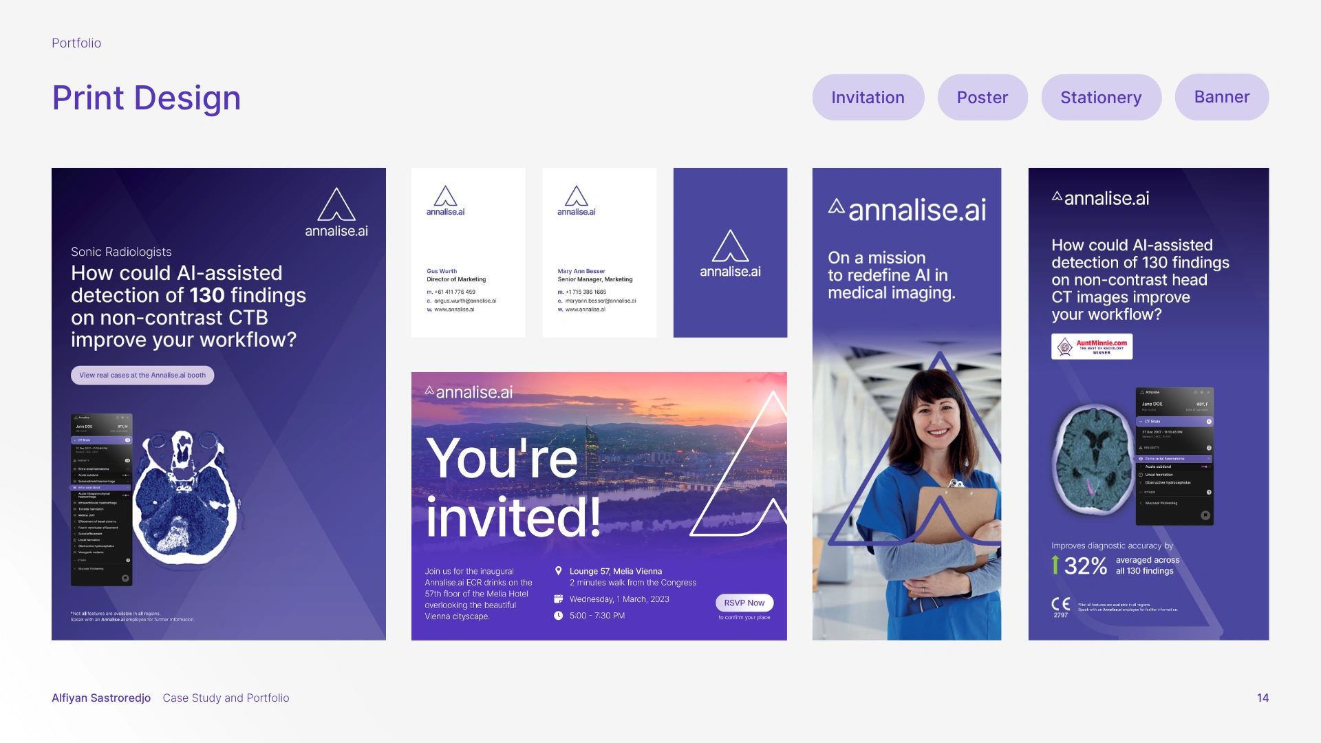 The solution was a comprehensive branding strategy that aligned with Harrison.ai's existing guidelines while carving out a unique, memorable identity for Annalise.ai. This meant refining and expanding the brand guidelines, enhancing the visual elements, and creating a full suite of design assets, spanning UI, sales decks, email newsletters, social media, YouTube thumbnails, print collateral (brochures, flyers, posters, stationery, banners), and motion graphics.