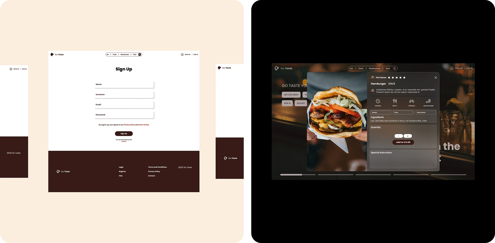 Go Taste is a curated portal of local restaurant menus, streamlining the ordering experience for consumers. I’ve worked for the redesign of the website with another freelancer designer.