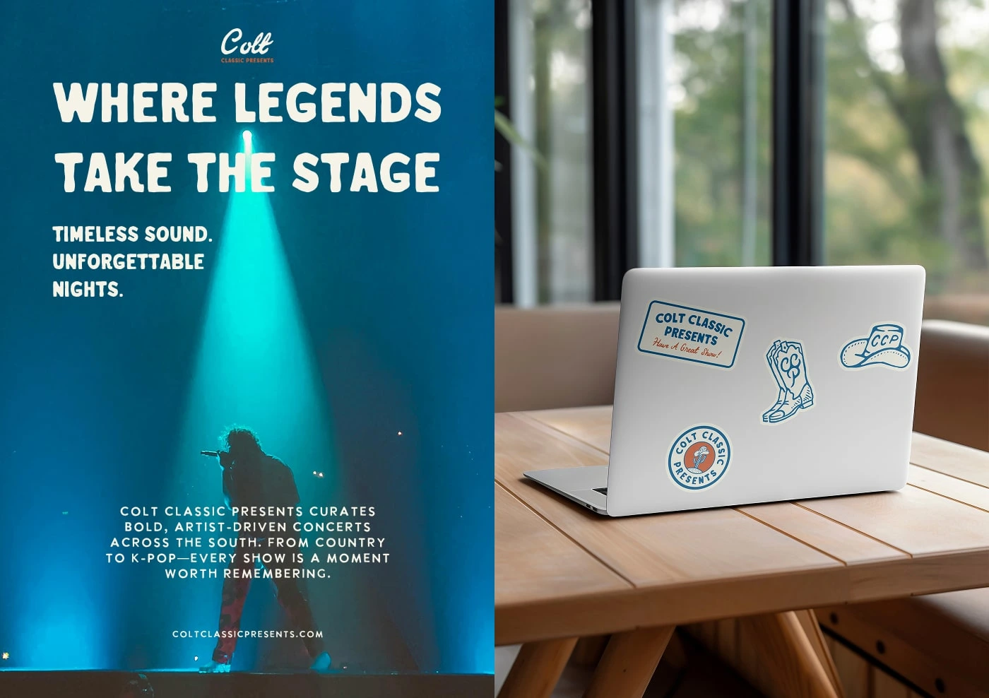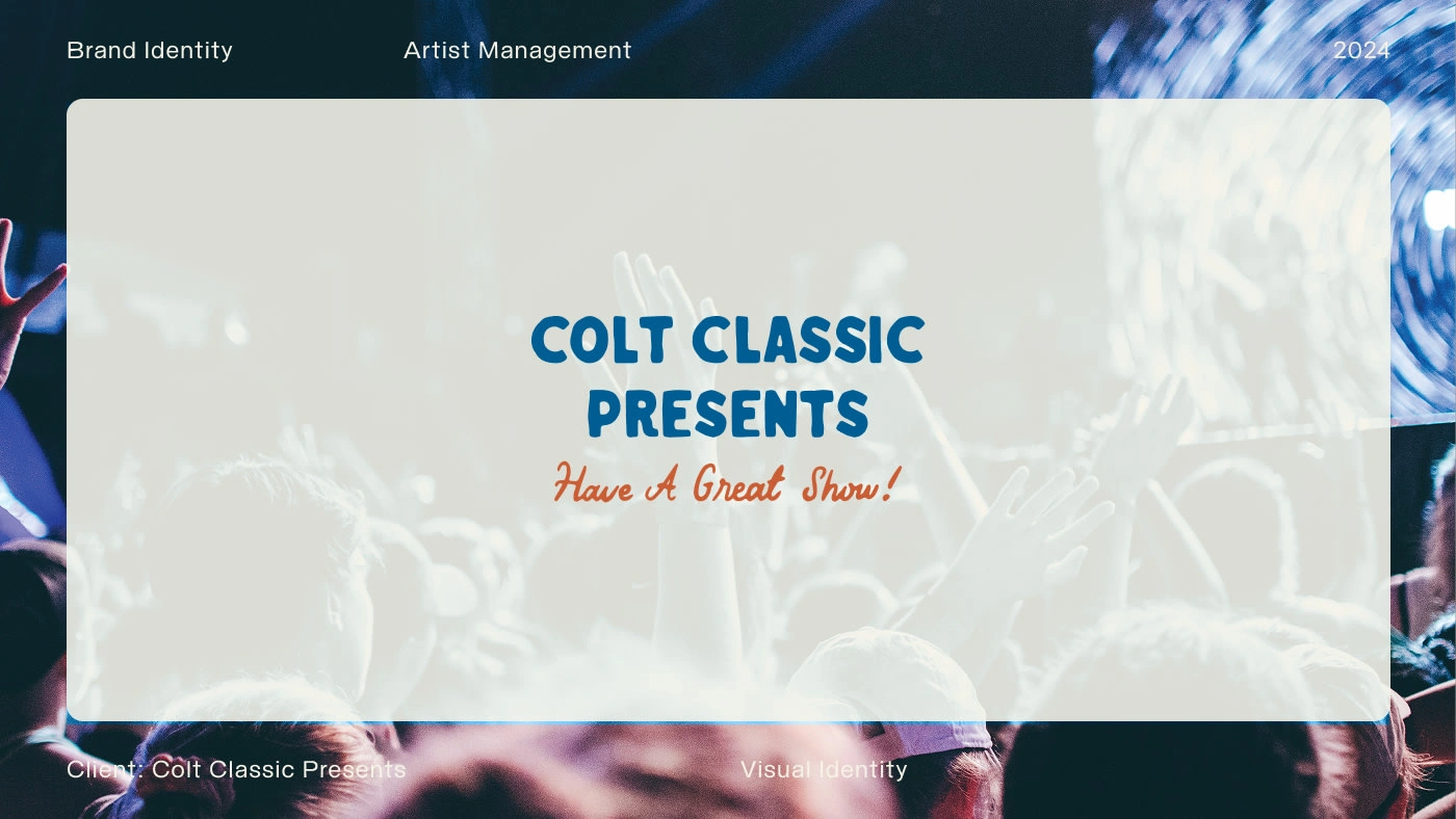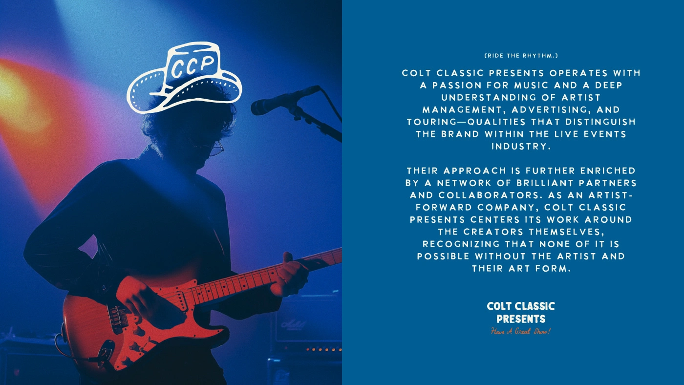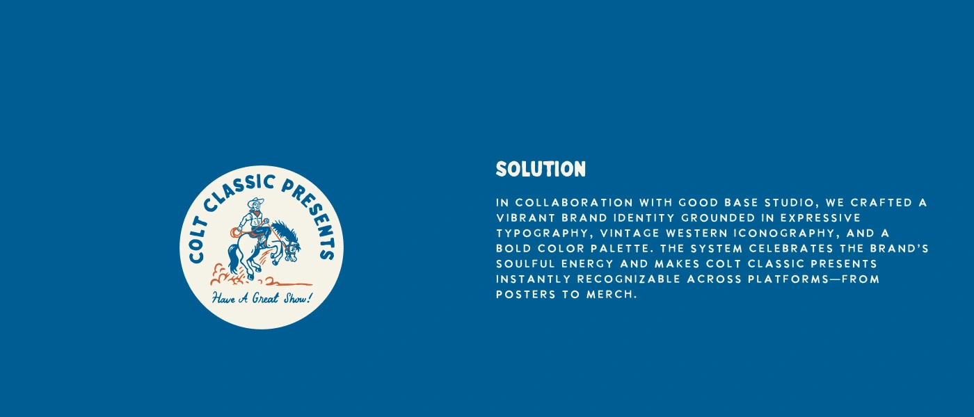 Colt Classic Presents is a boutique concerts and events brand rooted in Southern charm and musical diversity. Developed in collaboration with Good Base Studio, the identity captures their artist-first ethos through bold typography, nostalgic cowboy visuals, and a playful tone. From Americana to K-pop, the brand blends vintage flair with modern energy, celebrating unforgettable live experiences across the Southeast.