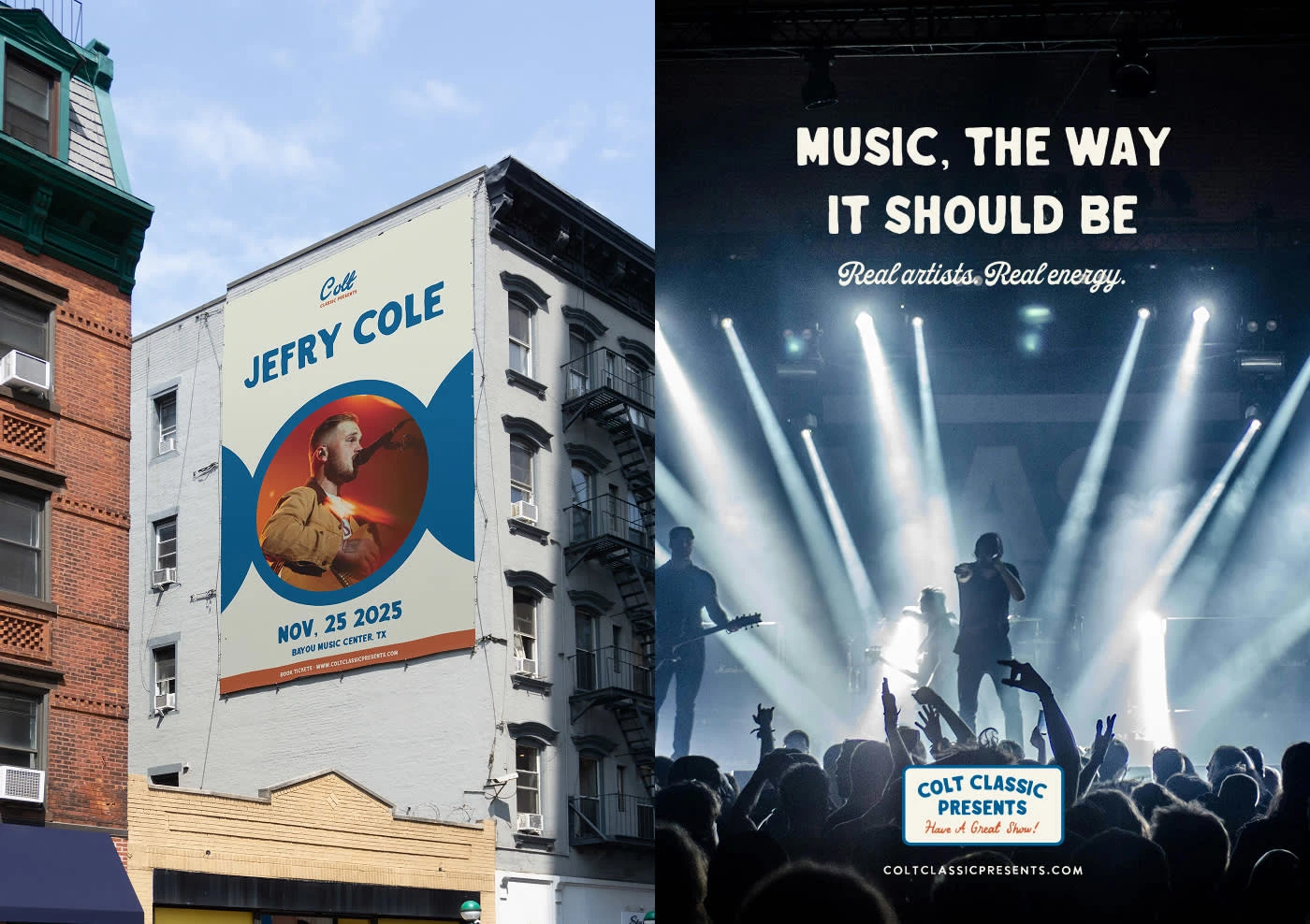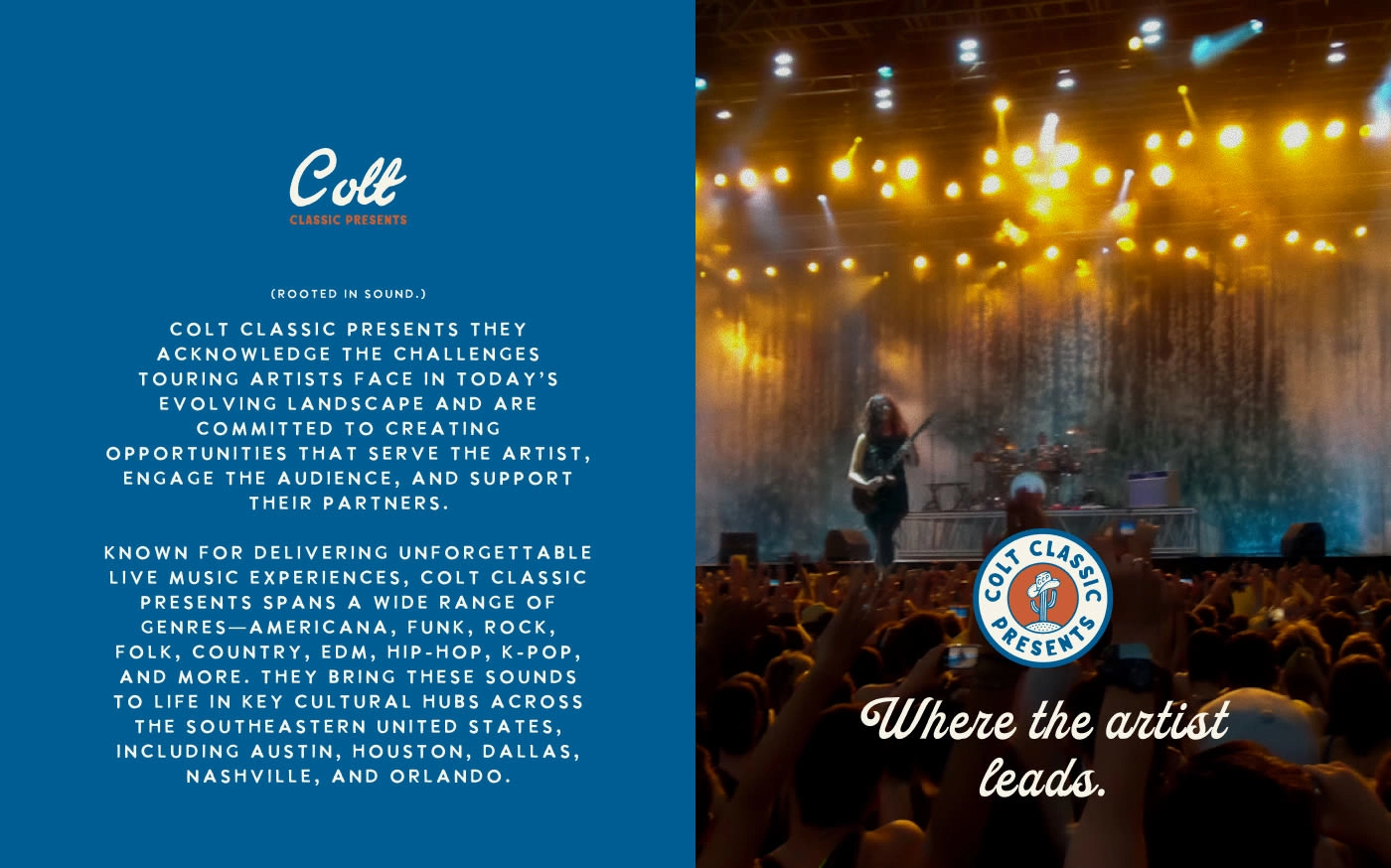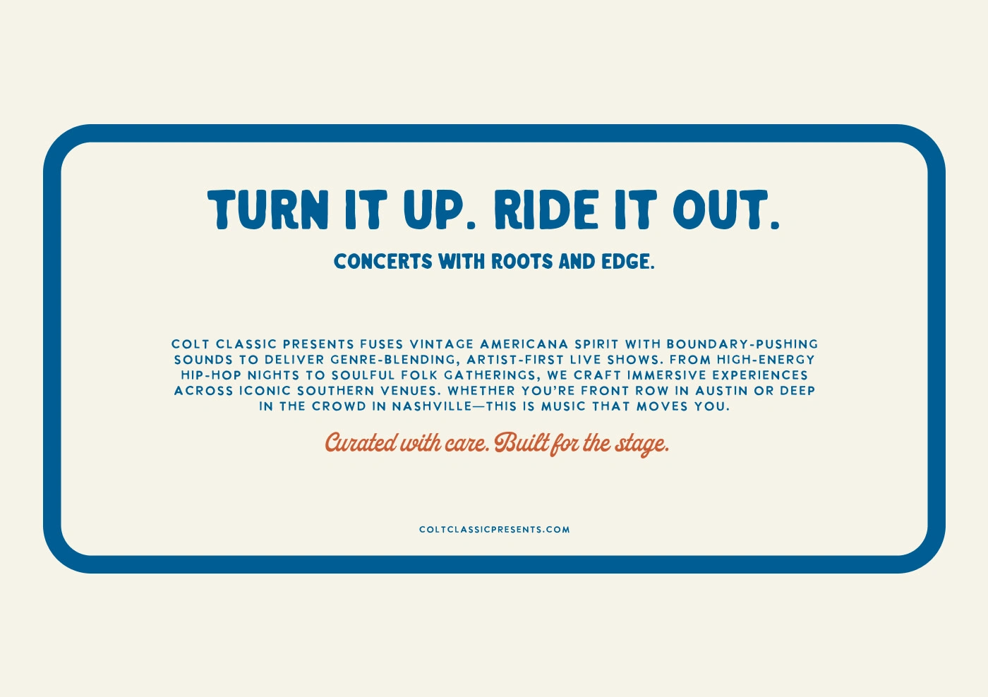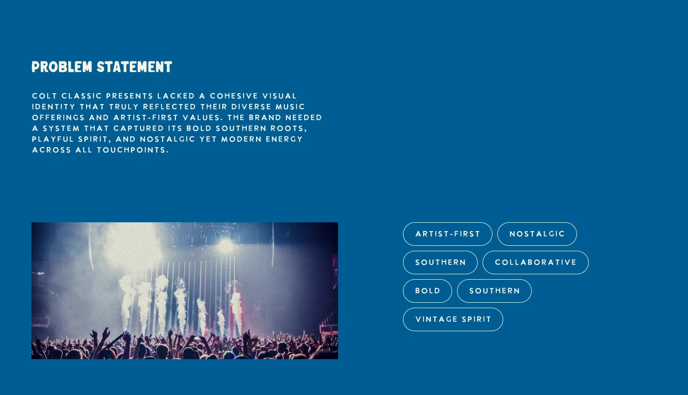 Colt Classic Presents is a boutique concerts and events brand rooted in Southern charm and musical diversity. Developed in collaboration with Good Base Studio, the identity captures their artist-first ethos through bold typography, nostalgic cowboy visuals, and a playful tone. From Americana to K-pop, the brand blends vintage flair with modern energy, celebrating unforgettable live experiences across the Southeast.