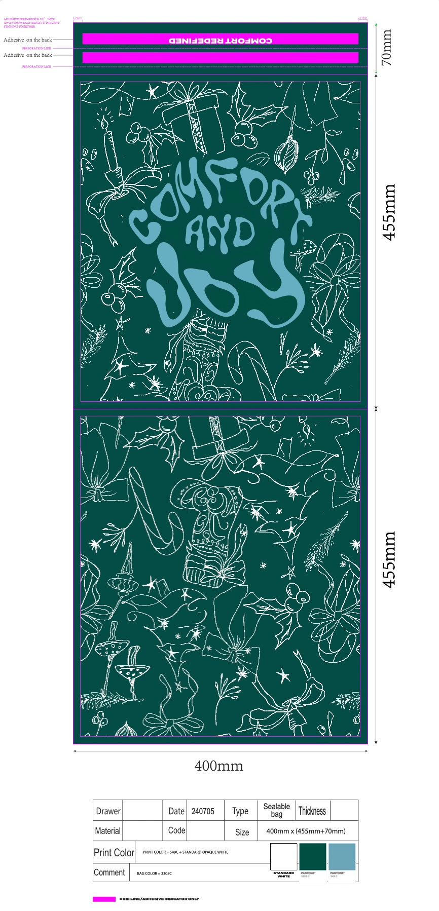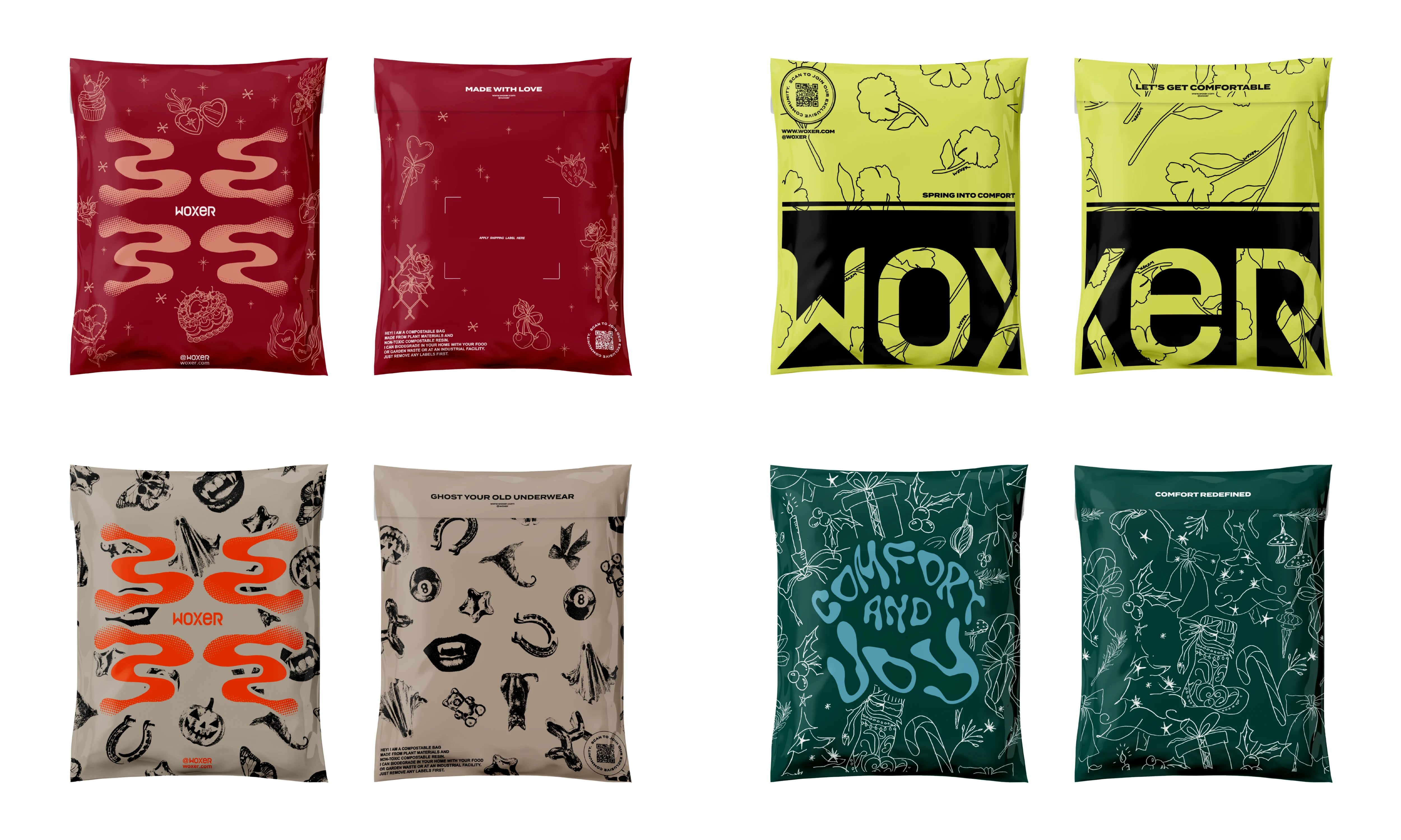 Developed custom compostable shipping mailers for Woxer that balanced sustainability with on-brand design impact. The project came with notable production constraints: only the base bag color and 1-2 ink colors could be used, and each color change required a minimum 5mm spacing to prevent ink overlap during printing. These limitations transformed what initially appeared to be a straightforward design project into a complex exercise in precision and creativity—requiring strategic use of negative space, scale, and contrast to achieve visual interest while maintaining print and material integrity. The final result delivered a cohesive, elevated packaging system that reinforced Woxer’s limited edition collection design and brand values through both unique custom packaging and environmental intent.