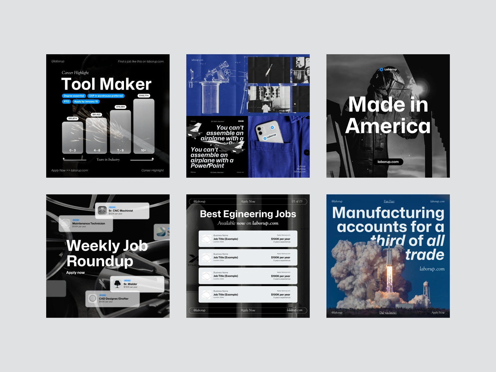 Laborup are all about high-paying industry jobs. The natural design route to take could be very minimalist and (for lack of a better word) 'boring' in style, but we went a very different direction. Taking modern and vintage imagery, blueprints, paper textures and glossy, metallic accents, we created content that stands out on a feed and shows who Laborup are: modern innovators.