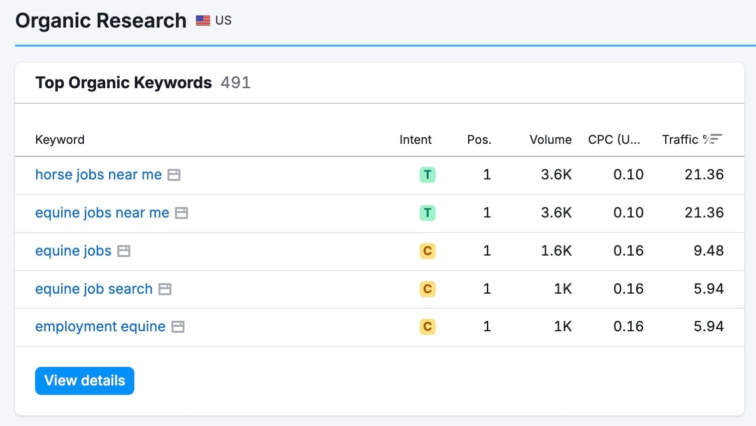 • Keyword optimization, securing top positions for competitive terms like Equine Jobs.