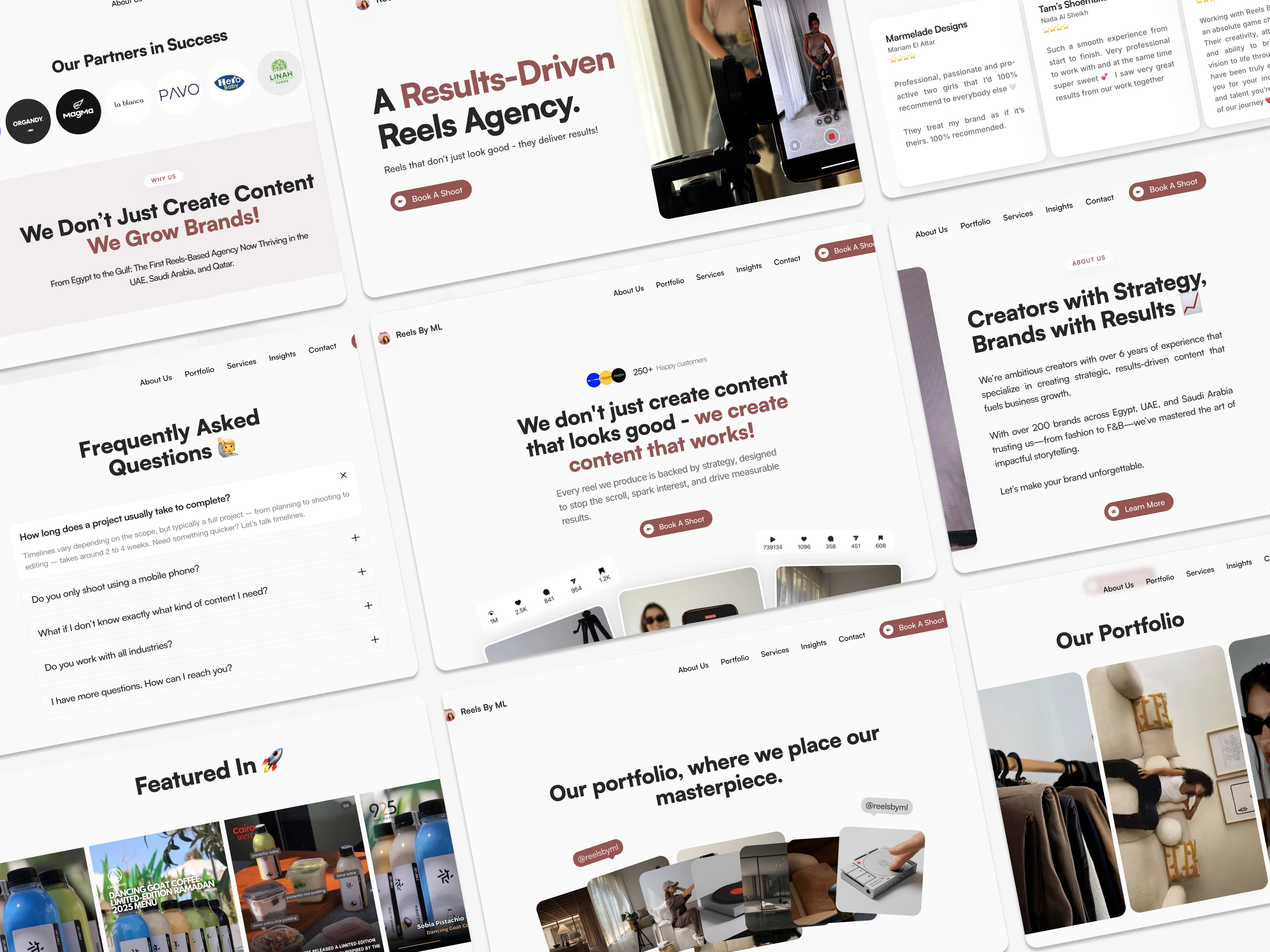 Transformed a Framer template into a unique multi-page website for Reels by ML. Fully customized homepage, portfolio, about, contact, and 404 pages.