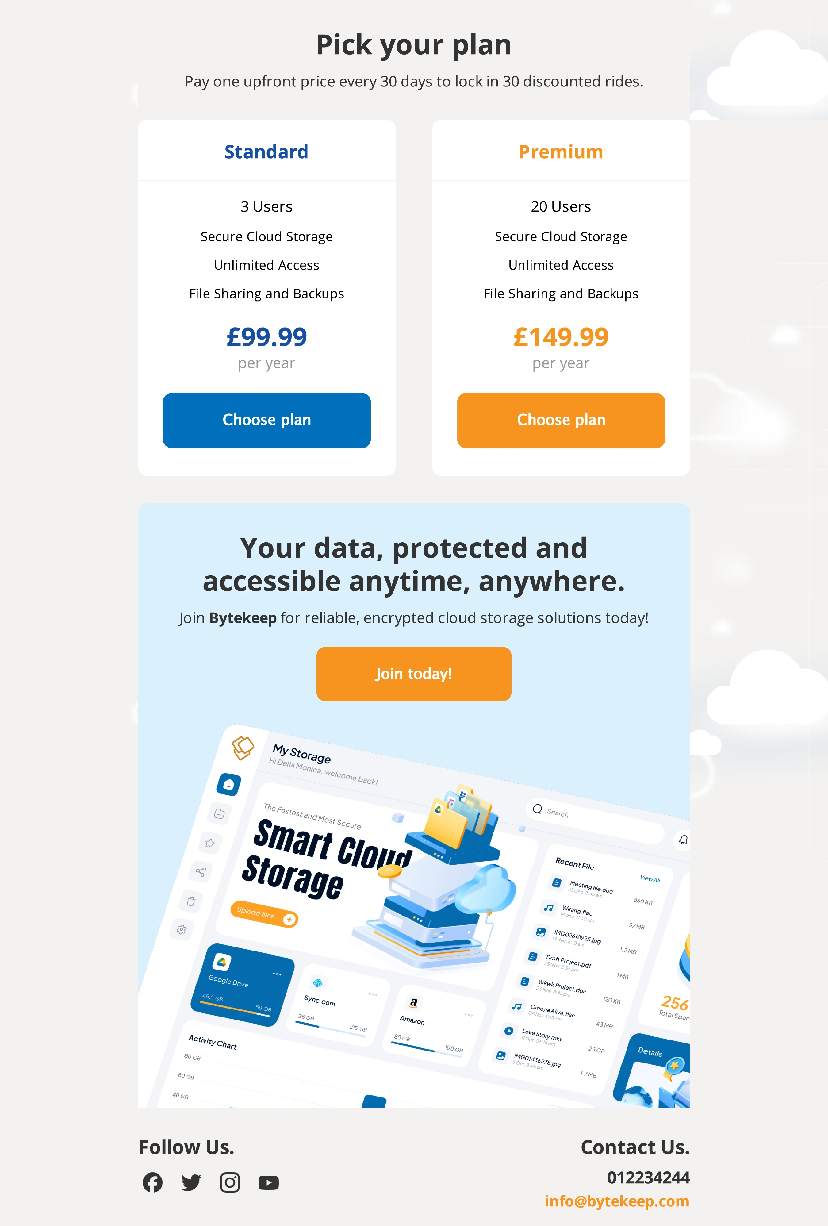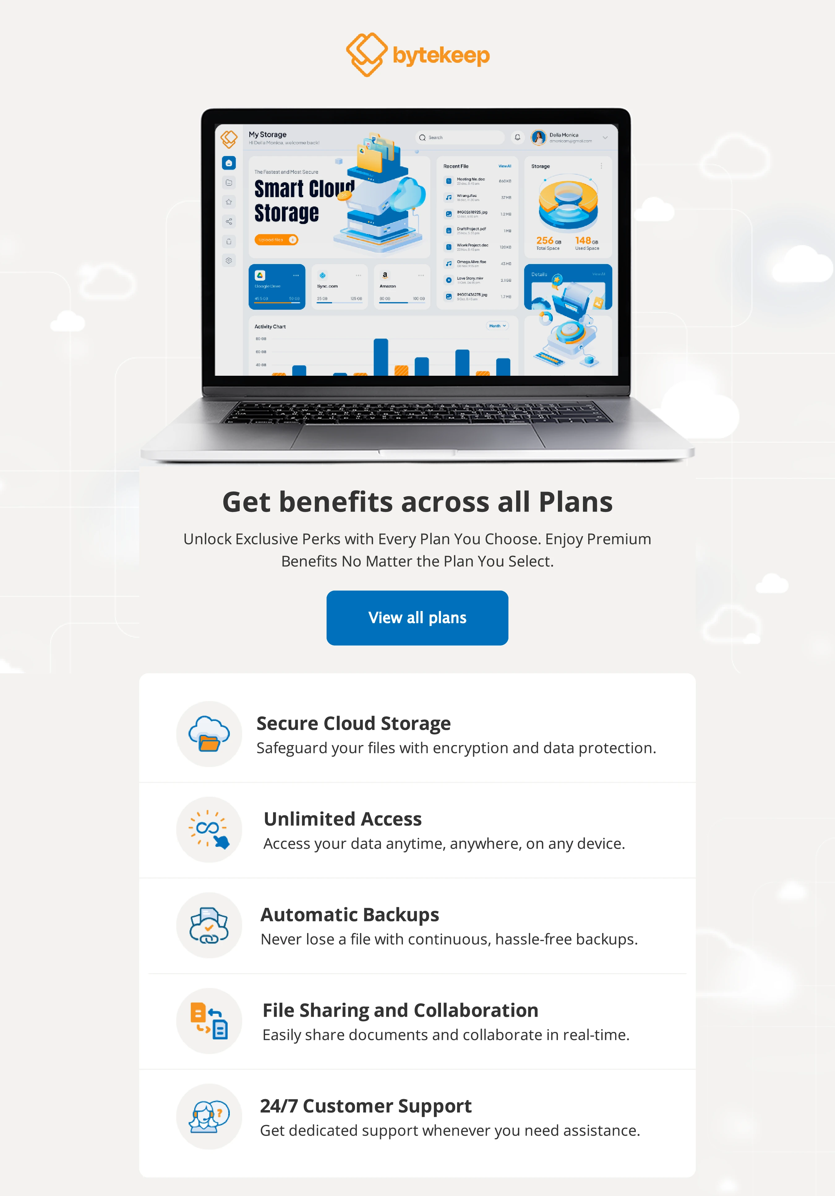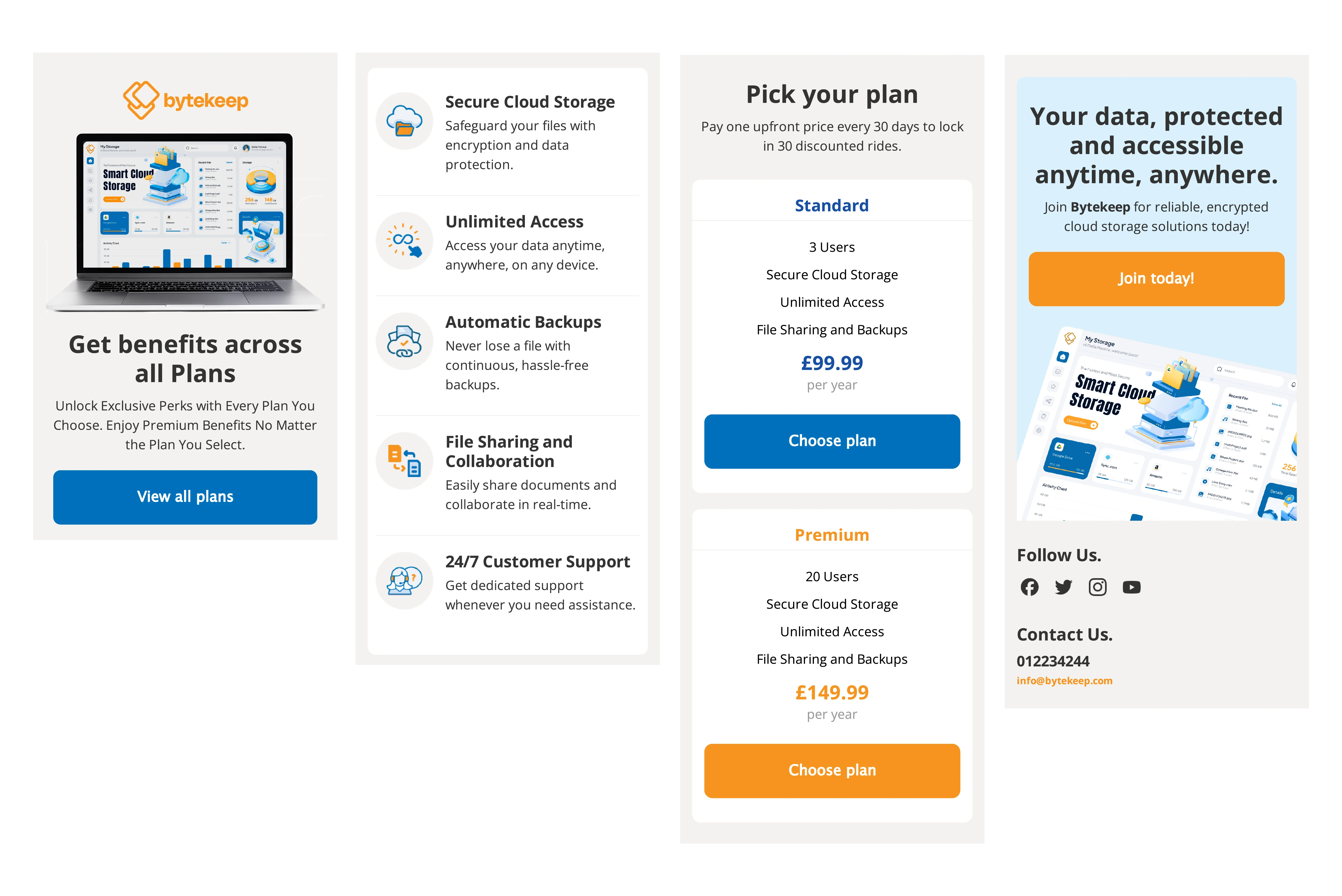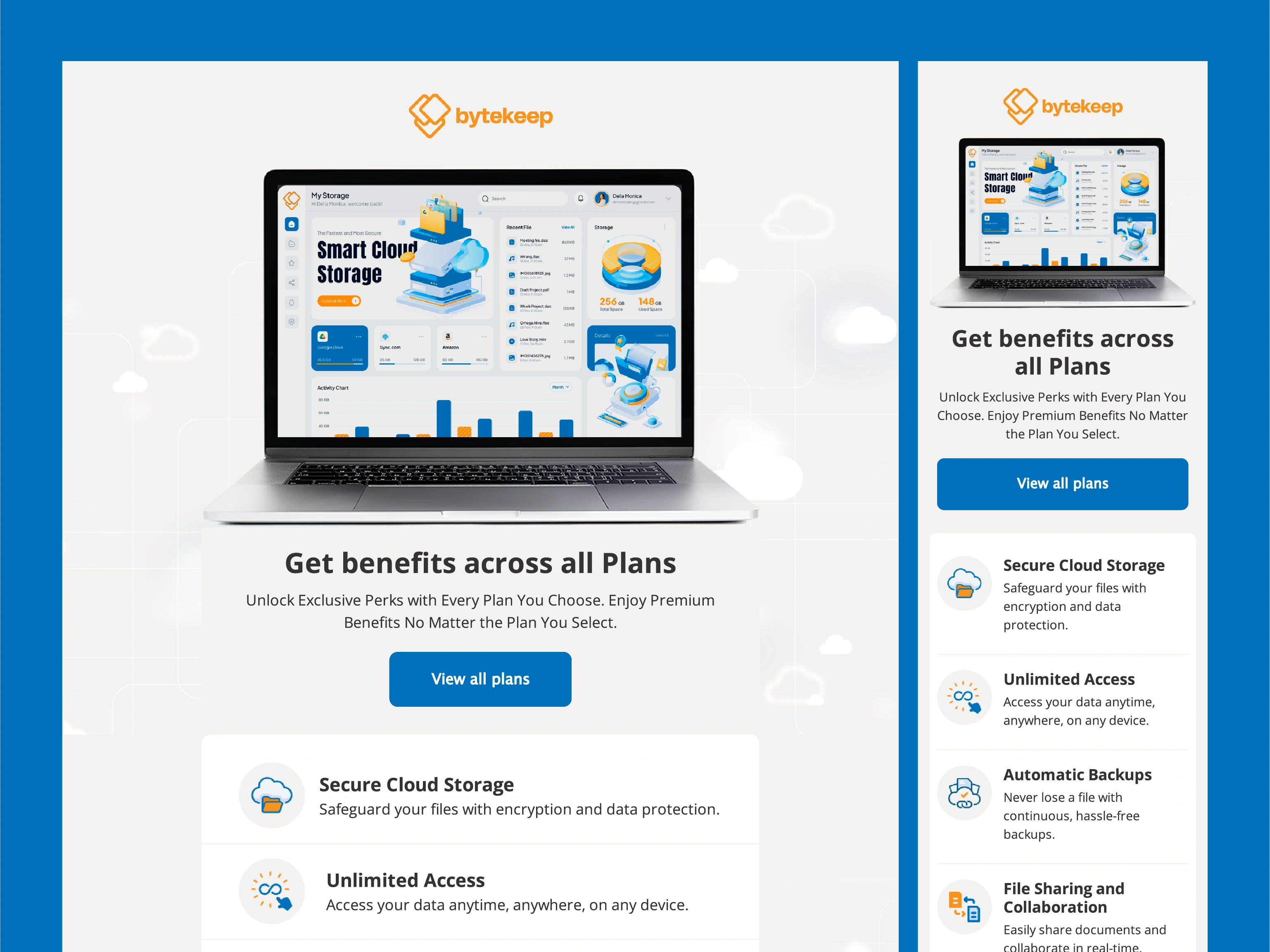 The ByteKeep subscription email uses a vibrant orange and blue colour scheme from the brand guidelines to highlight key details. Orange and blue enhance call-to-action buttons, while blue adds trust. Icons simplify feature scanning, and a subscription dashboard mockup gives users a preview, creating a balanced, engaging design.