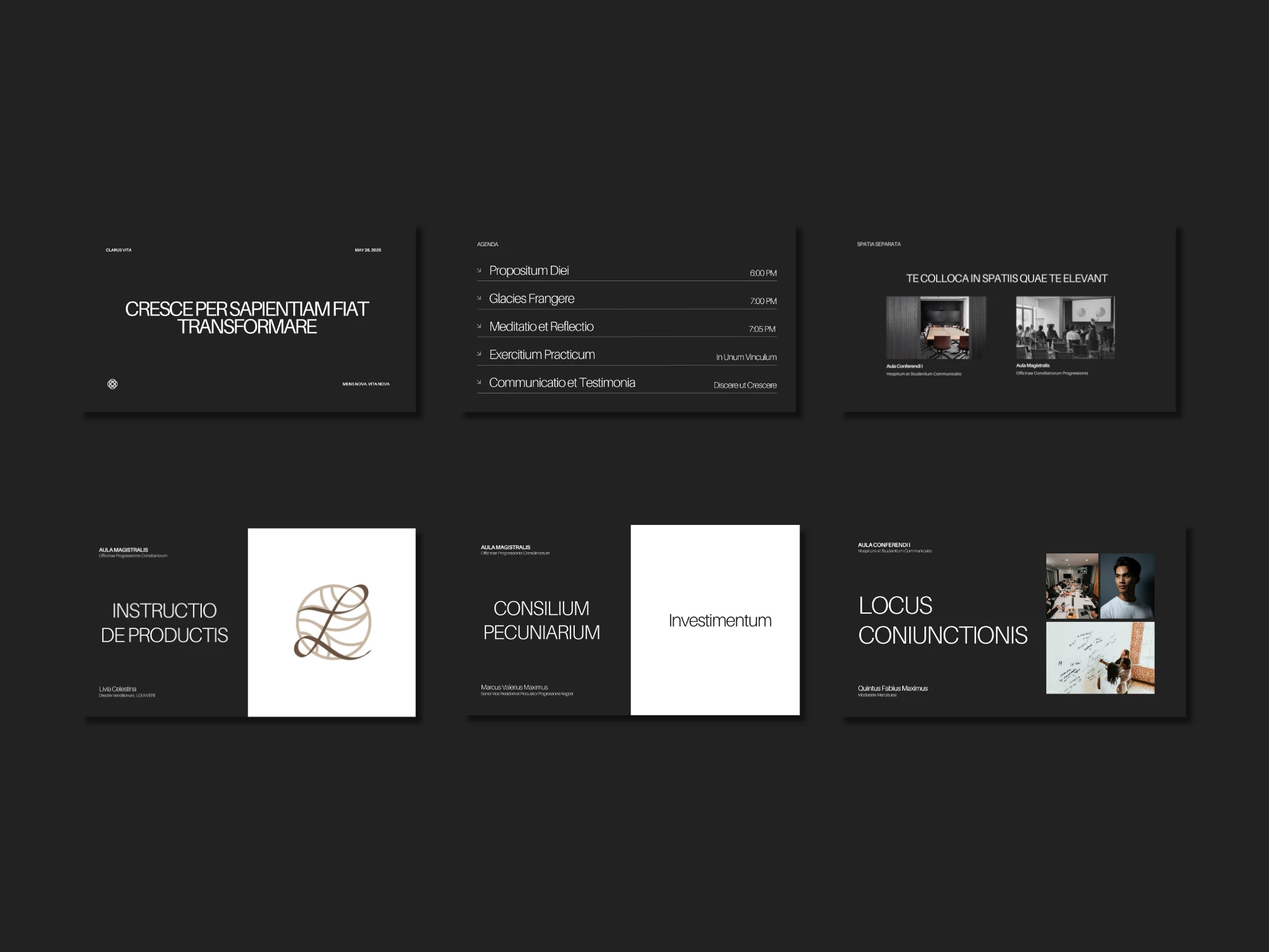 This pitch deck aims to showcase updates and speakers, as well as upcoming technical trainings, all presented in a seamless, minimal, and luxurious design.