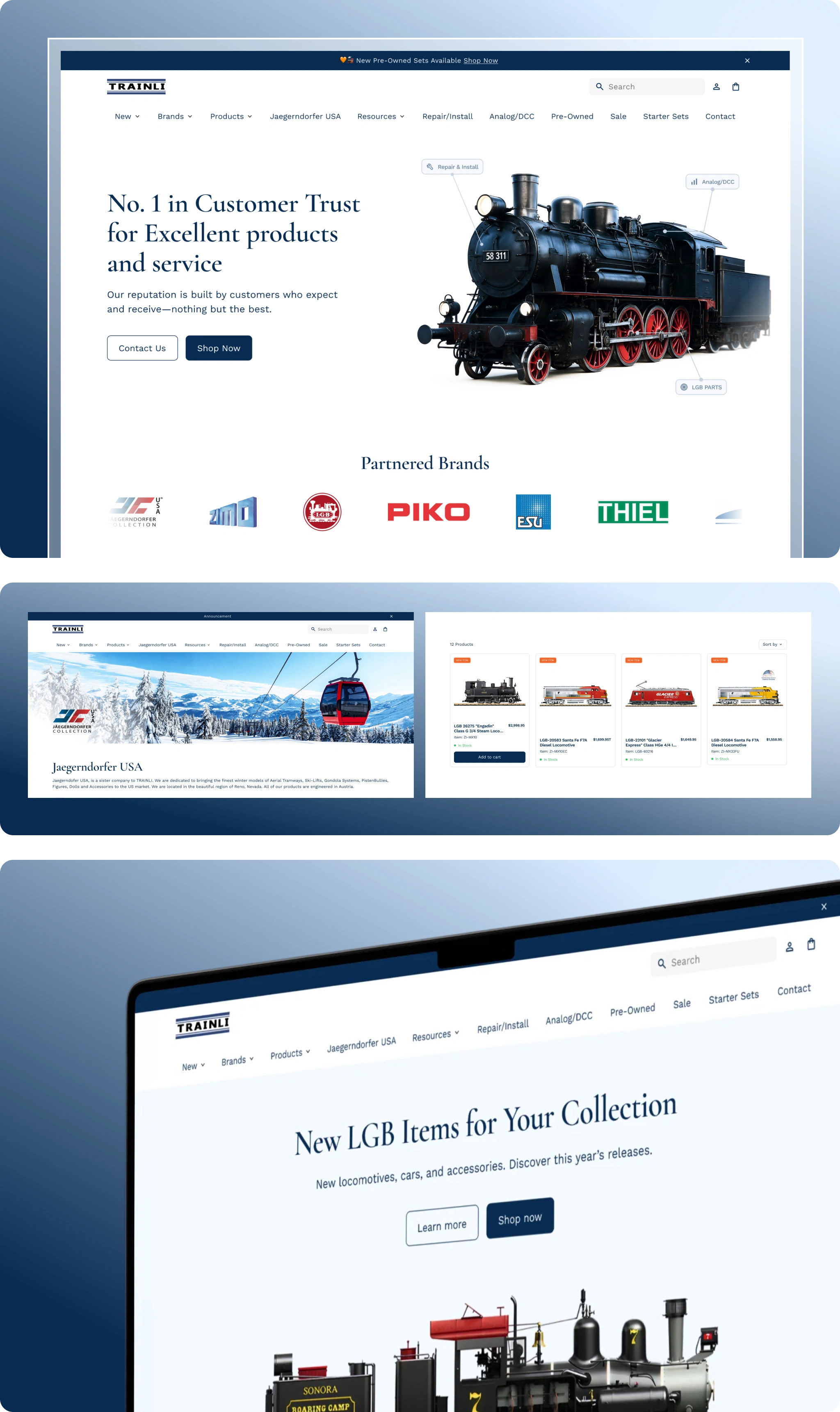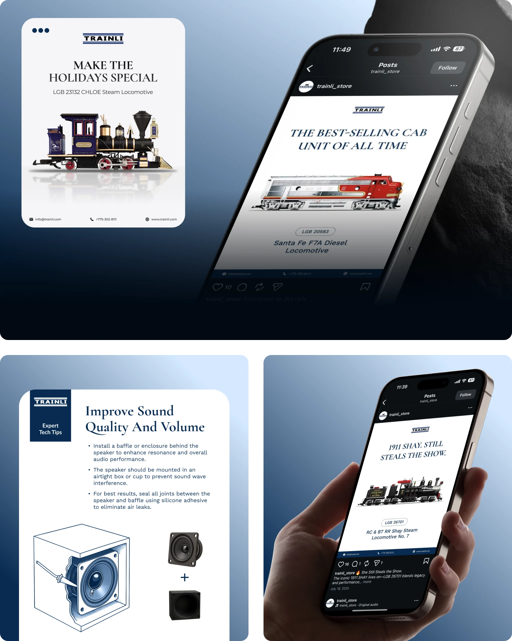 Our agency partnered with Trainli to deliver a comprehensive digital transformation that elevated their online presence and streamlined their e-commerce operations. We provided full-service website design and development, creating a modern, user-friendly platform optimized for both desktop and mobile experiences. Our team crafted a cohesive social media strategy with custom graphics and content designed to engage the model train community across Instagram, Facebook, and YouTube. Additionally, we implemented advanced e-commerce features including inventory management integration, secure payment processing, and personalized product recommendations. The project also included SEO optimization, email marketing automation, and ongoing
