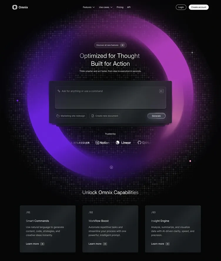 Designed a modern dark-mode landing page for an AI productivity platform optimized for fast ideation and execution.