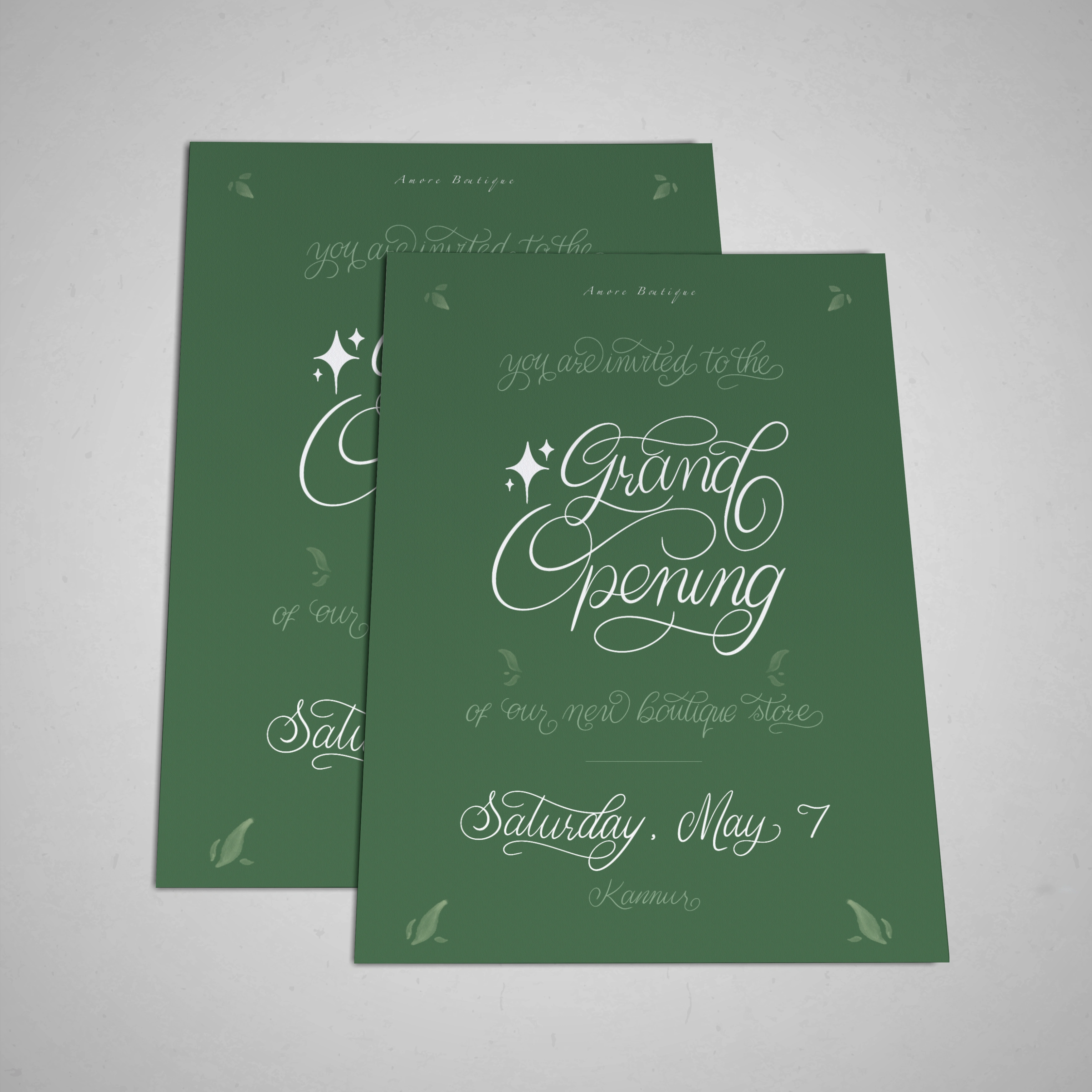 A collection of elegant wedding and event invitation designs that showcase minimal calligraphy style, catering to both English and Malayalam-speaking clients.