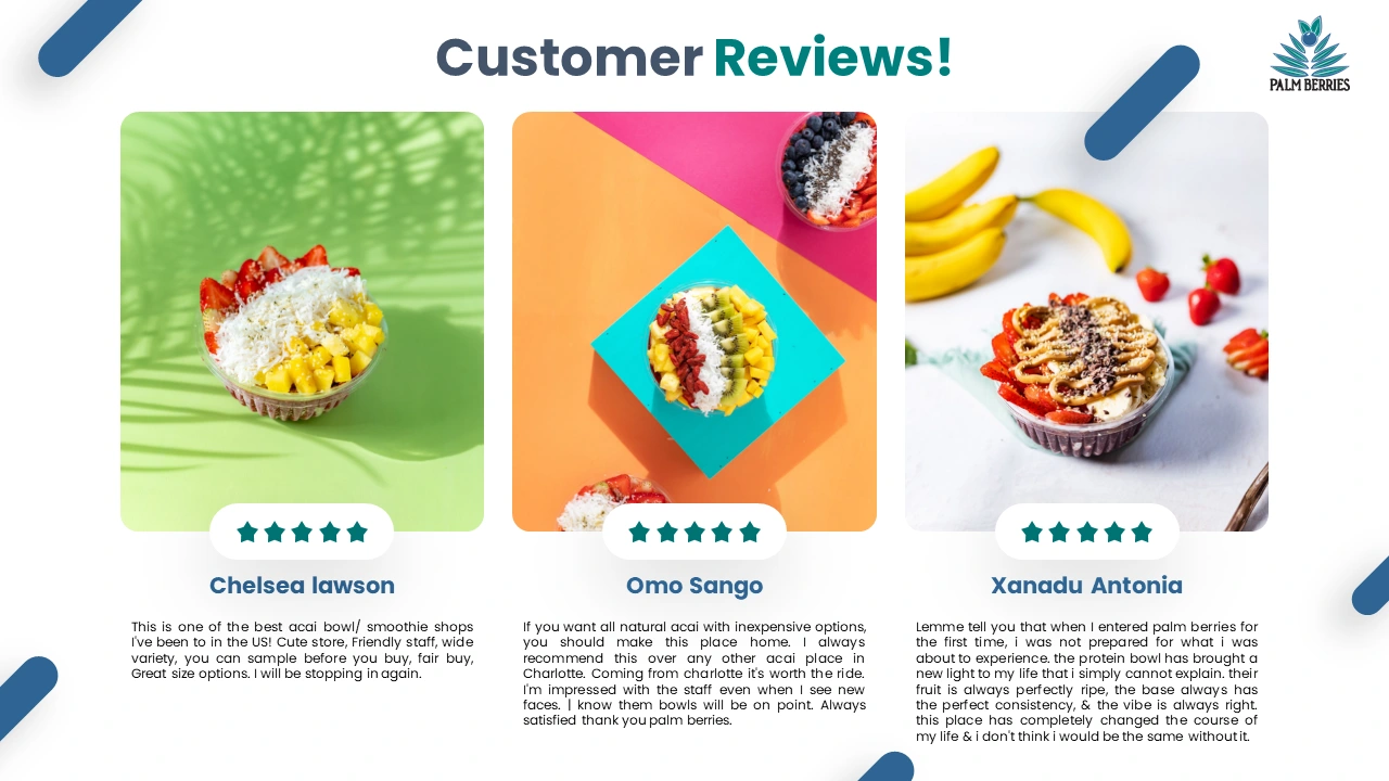 I designed a vibrant, engaging pitch deck for Palm Berries, showcasing their inspiring journey from a small 6x6 food truck to a fast-growing acai bowl franchise. The presentation deck highlighted their mission to bring healthy, flavorful acai bowls to communities nationwide.