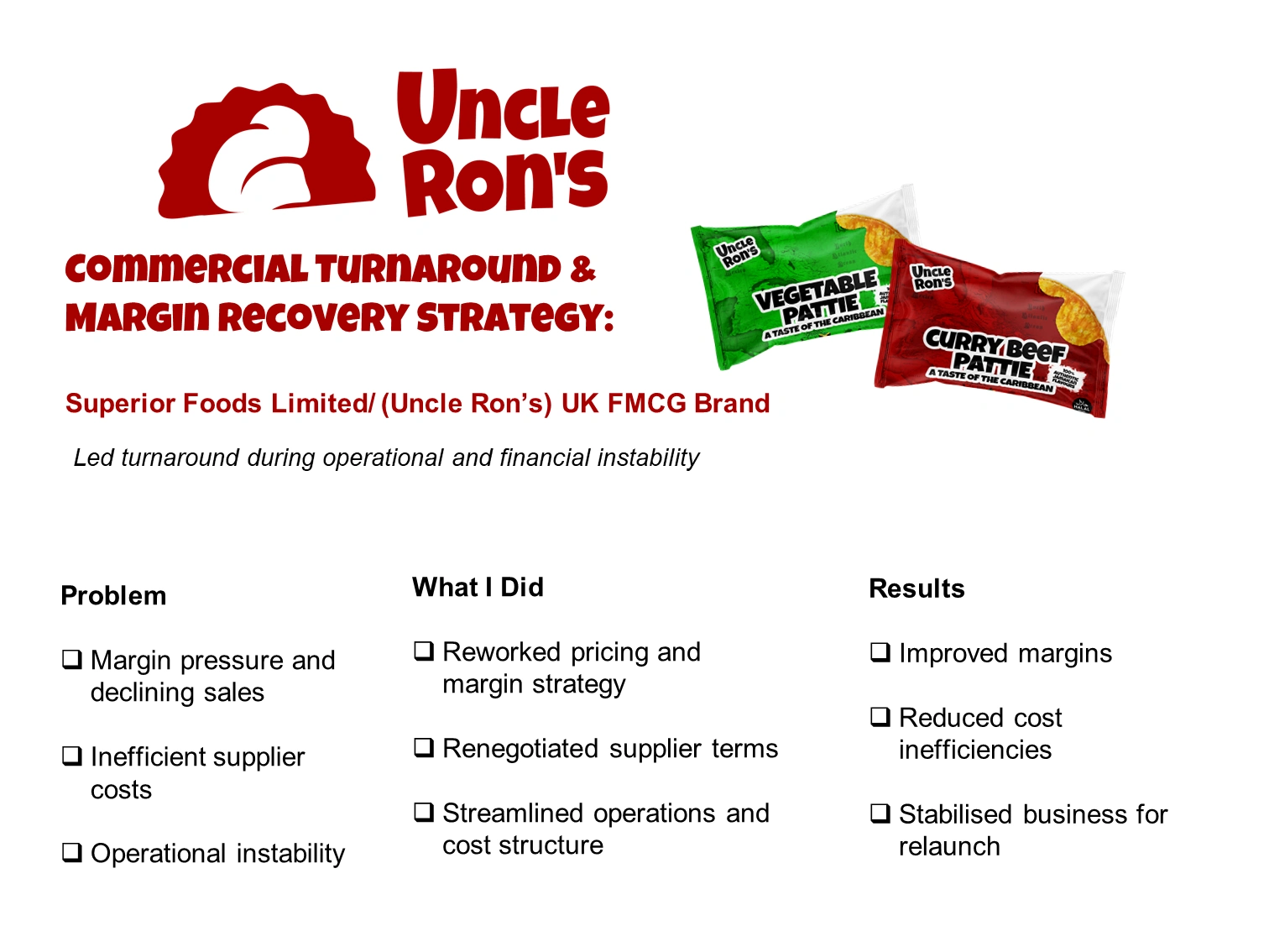 Led turnaround of UK food manufacturer by fixing pricing, supplier costs, and operations. Improved margins, reduced leakage, and stabilised for relaunch.