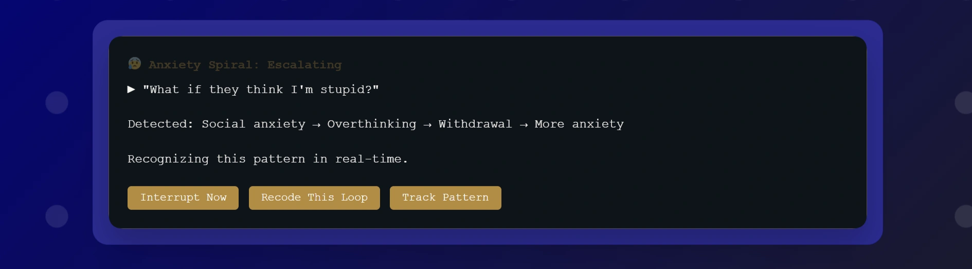 This custom-coded section demonstrates how overthinking patterns form and sustain themselves. Using CSS-driven UI components, the interface simulates: