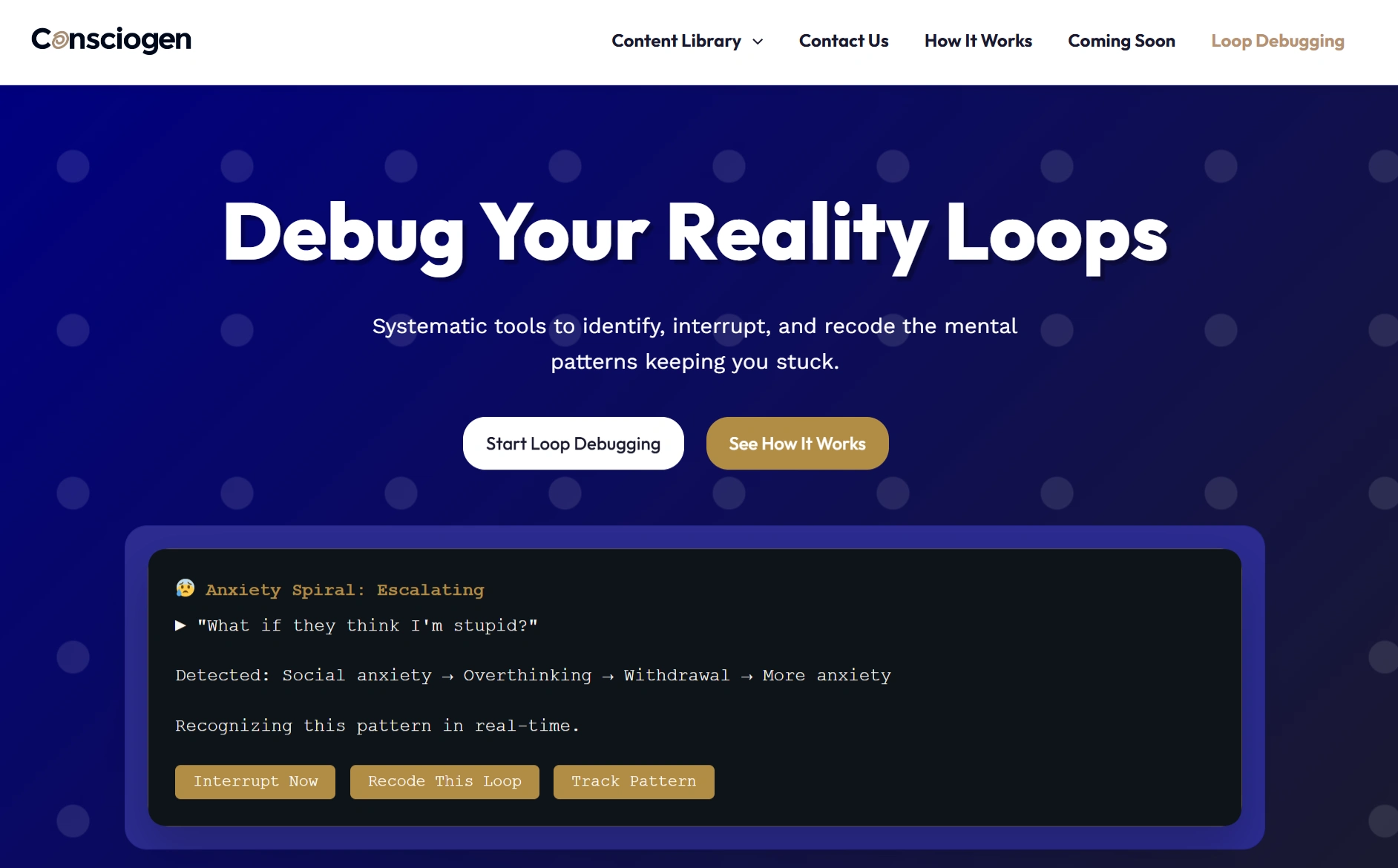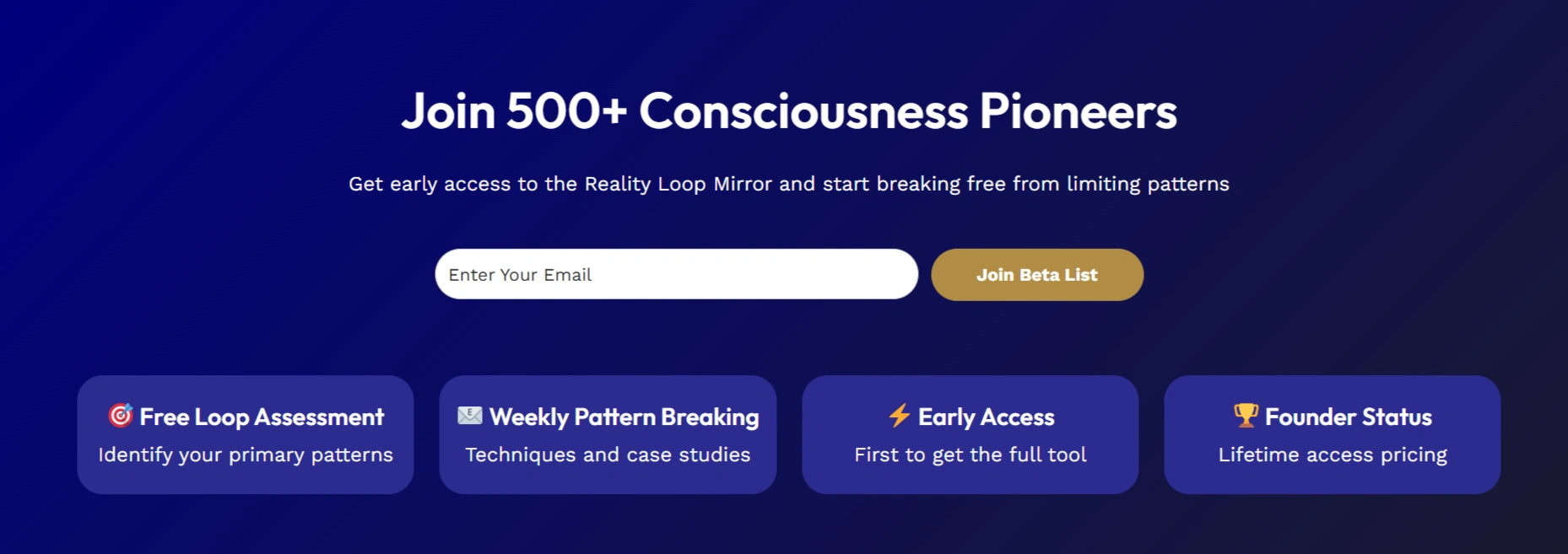 The landing page successfully turns abstract consciousness theory into a tangible experience helping users recognize recurring mental loops and engage with personal change through clarity, structure, and interaction.