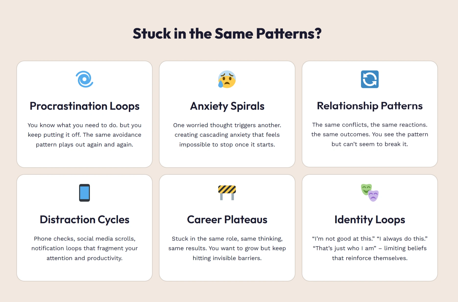 Pattern Recognition Sections: Visualized common loops such as procrastination, anxiety spirals, identity beliefs, and distraction cycles