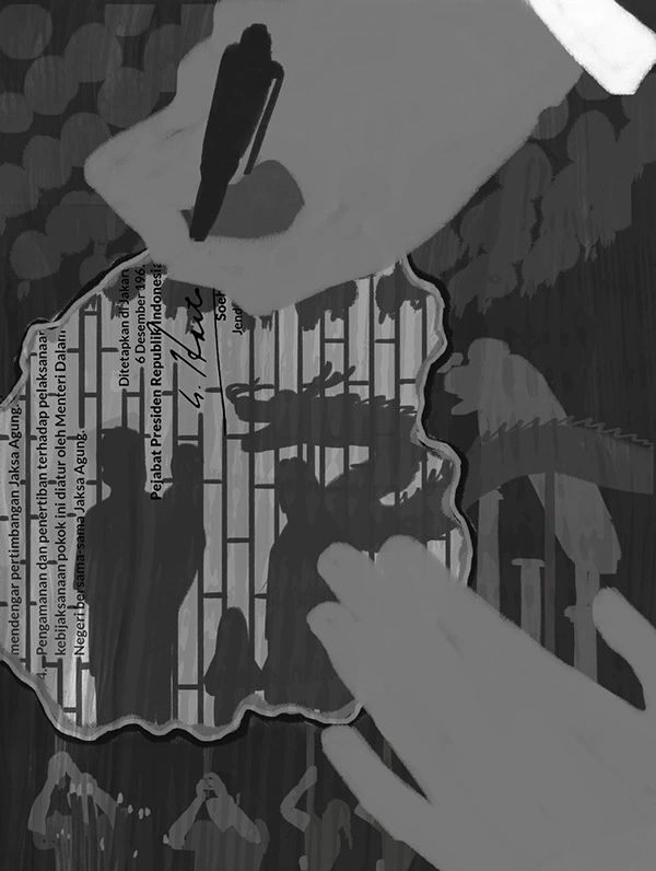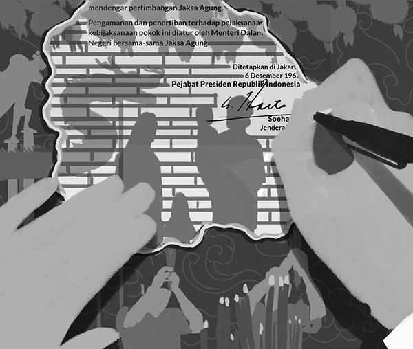 Ilustrasi editorial digital bertema sejarah & identitas untuk Project Multatuli, memvisualisasikan isu sosial dengan simbolisme dan nuansa puitis, dan dramatis.