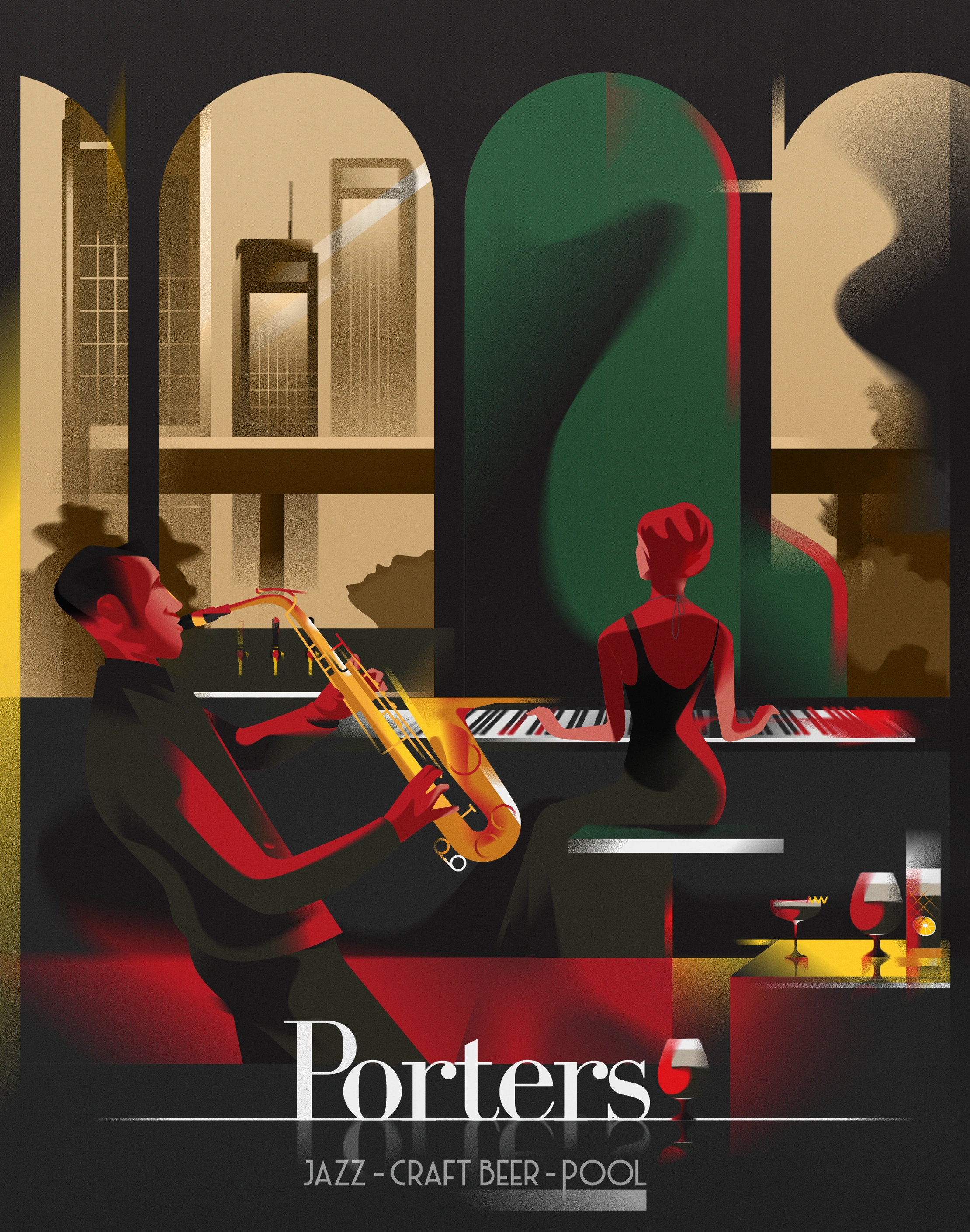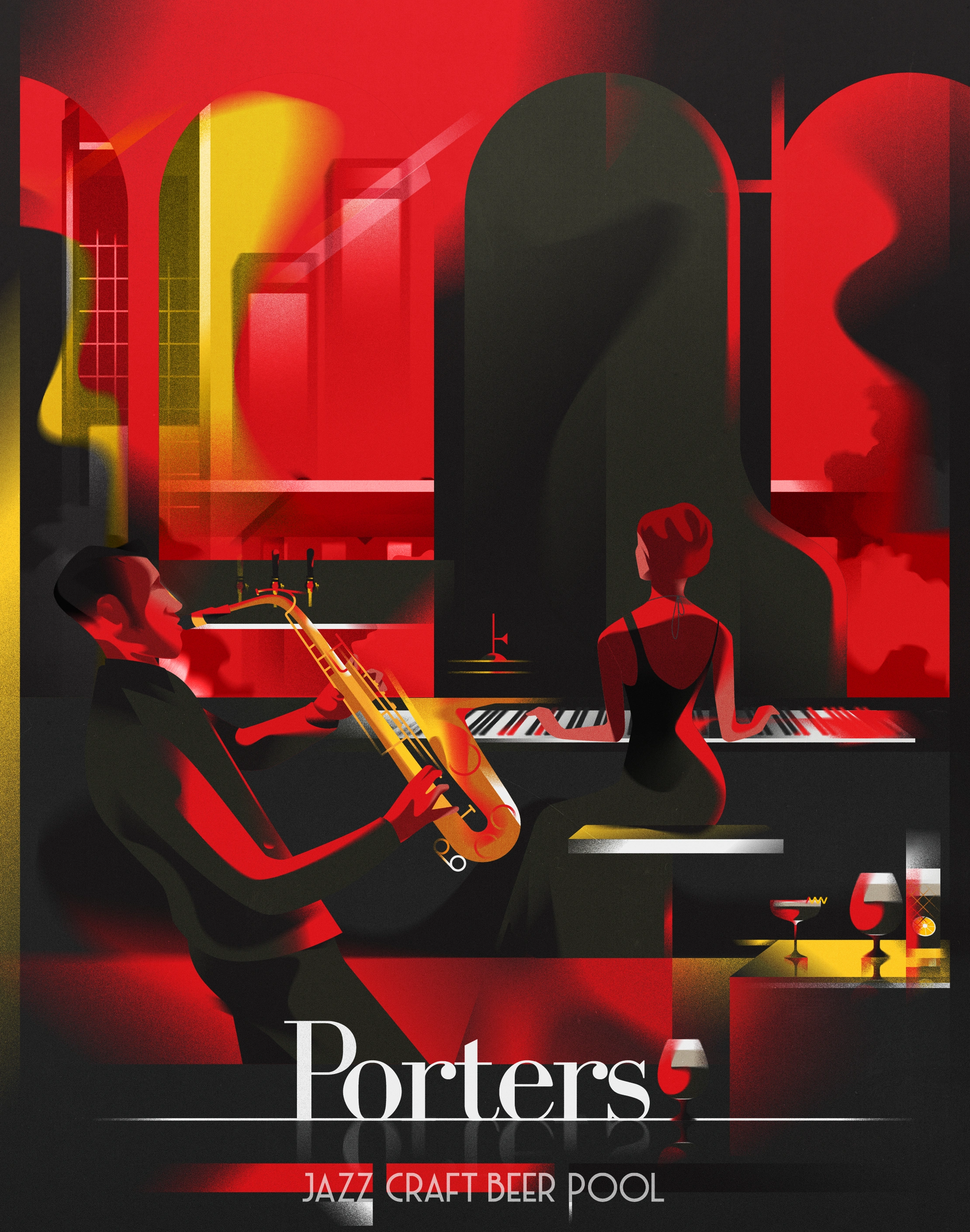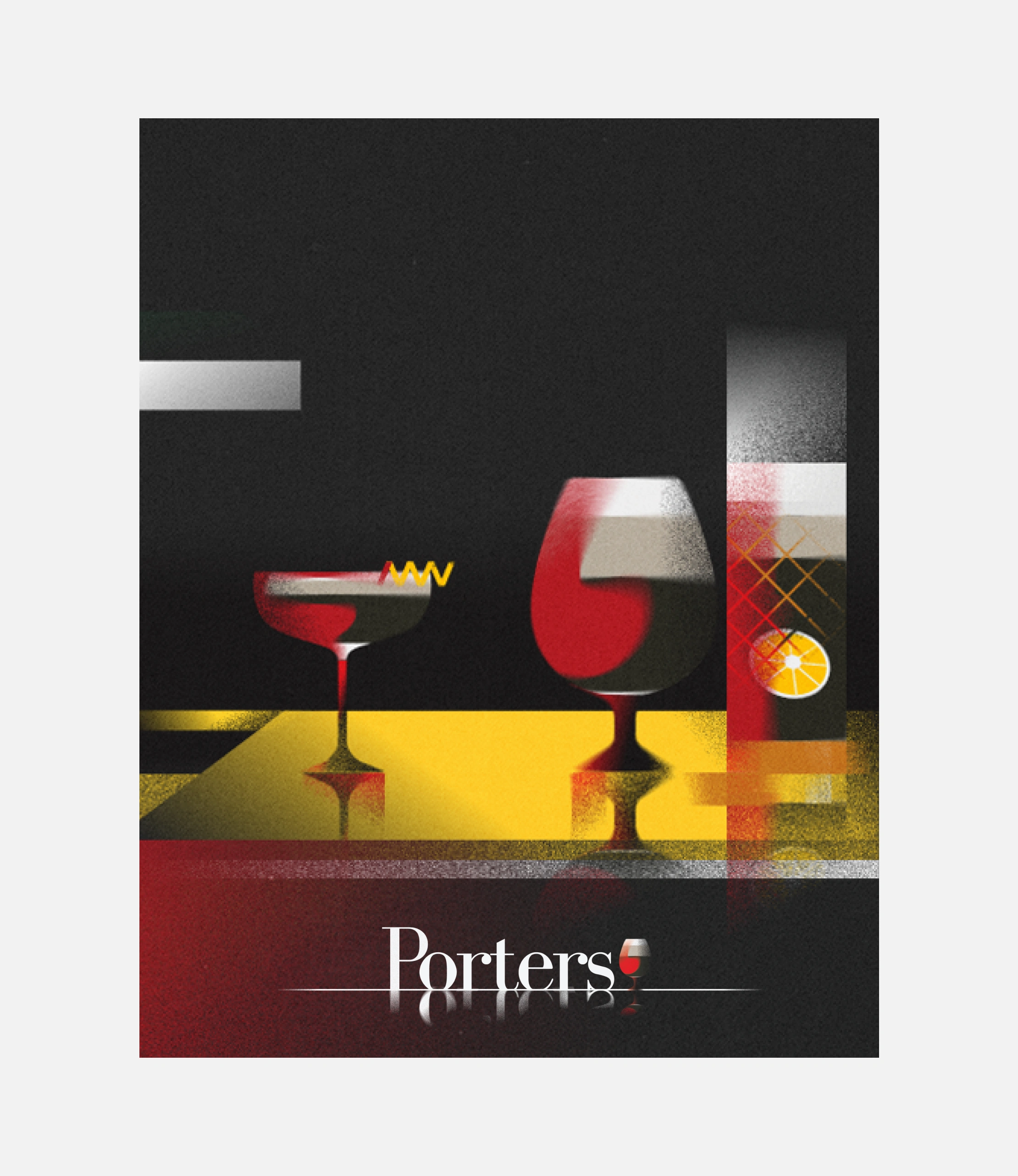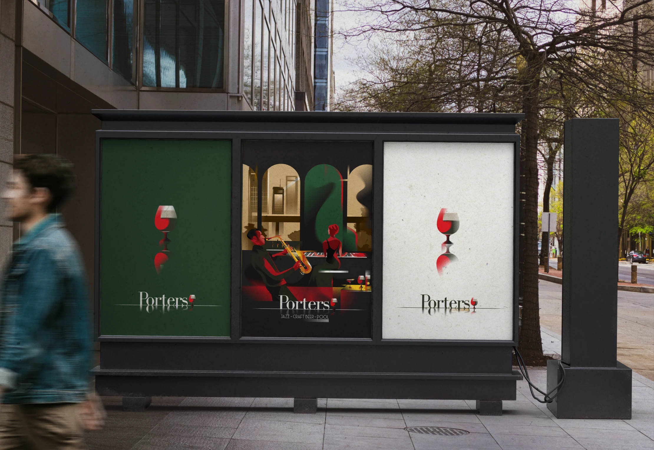 Porters is a Jazz Bar located in Germany where patrons can enjoy freshly brewed porter beer accompanied by Jazz music in a cozy ambiance illuminated by dim red lighting. The Art Deco posters serves as extension of their logo and their brand identity just like Dubonnet.