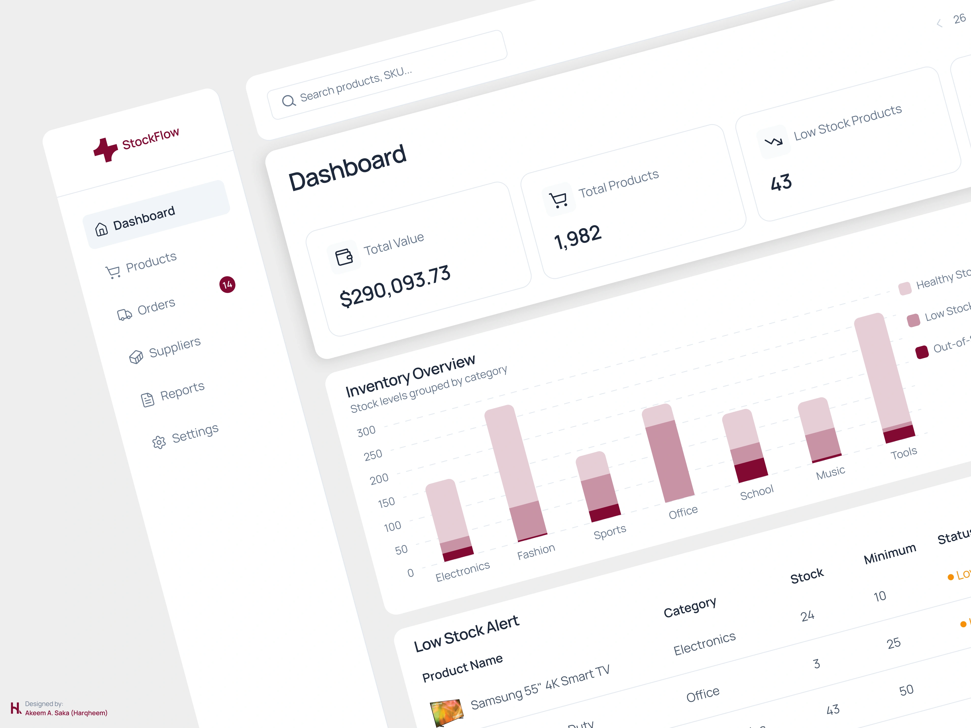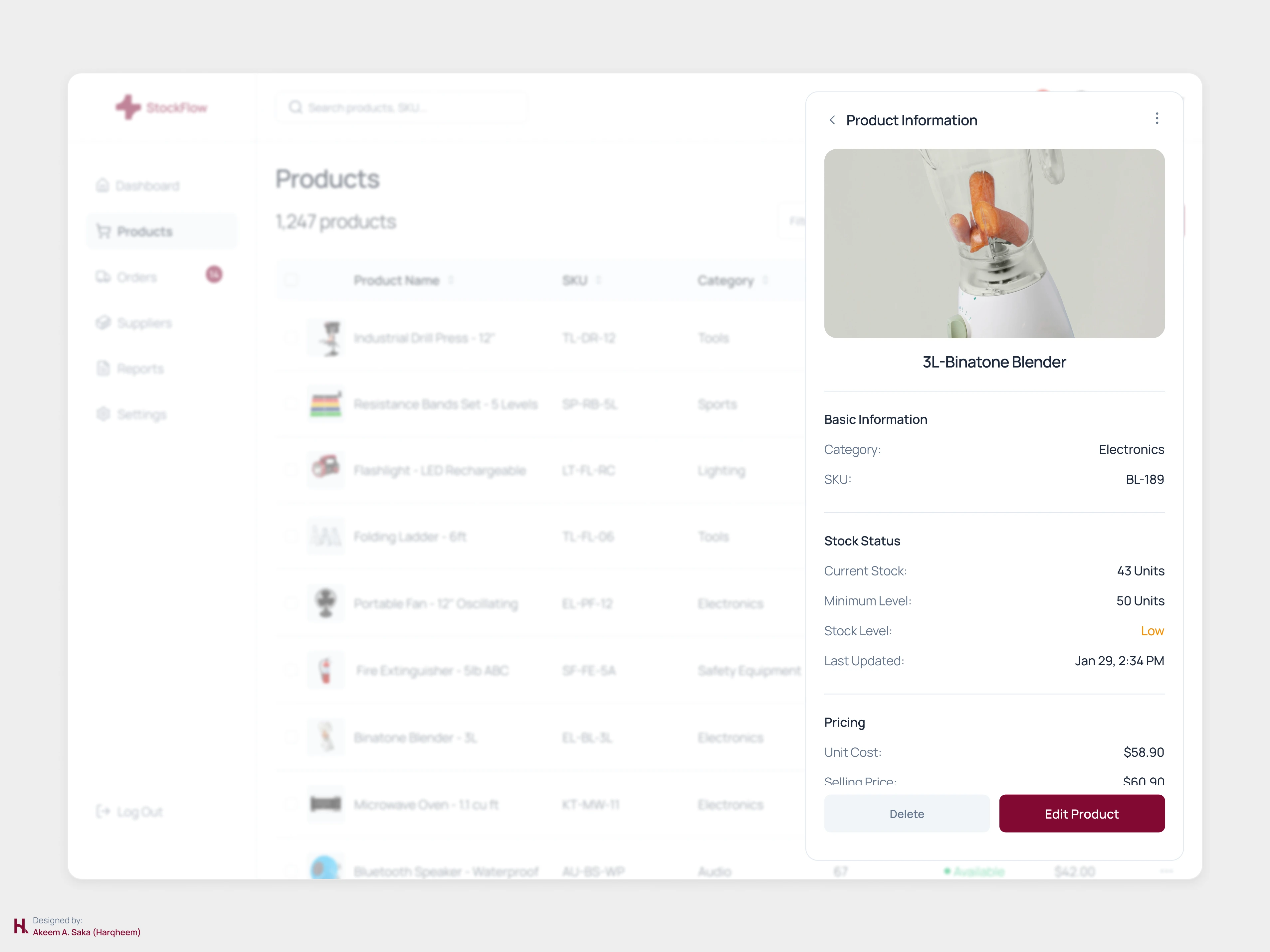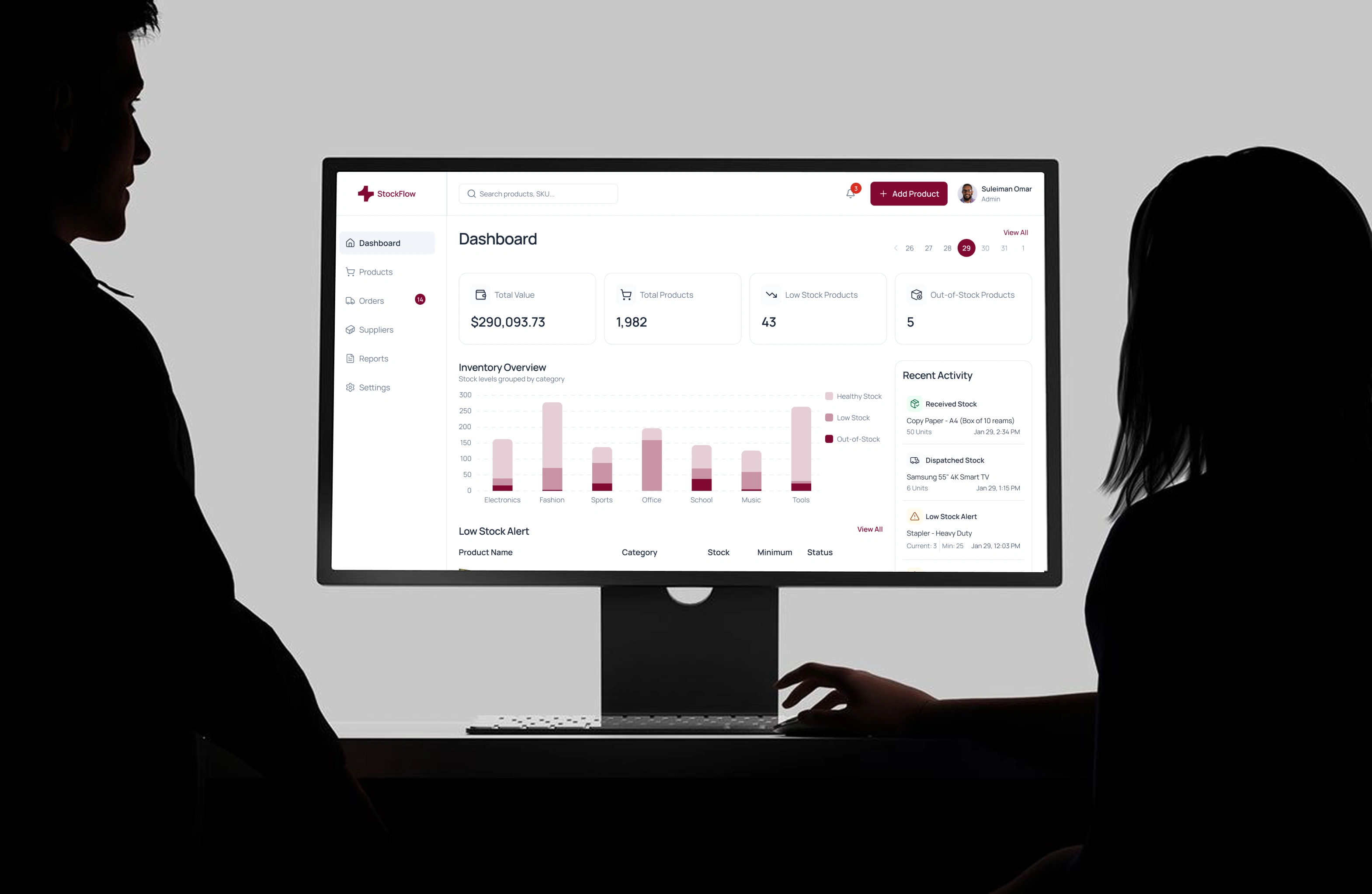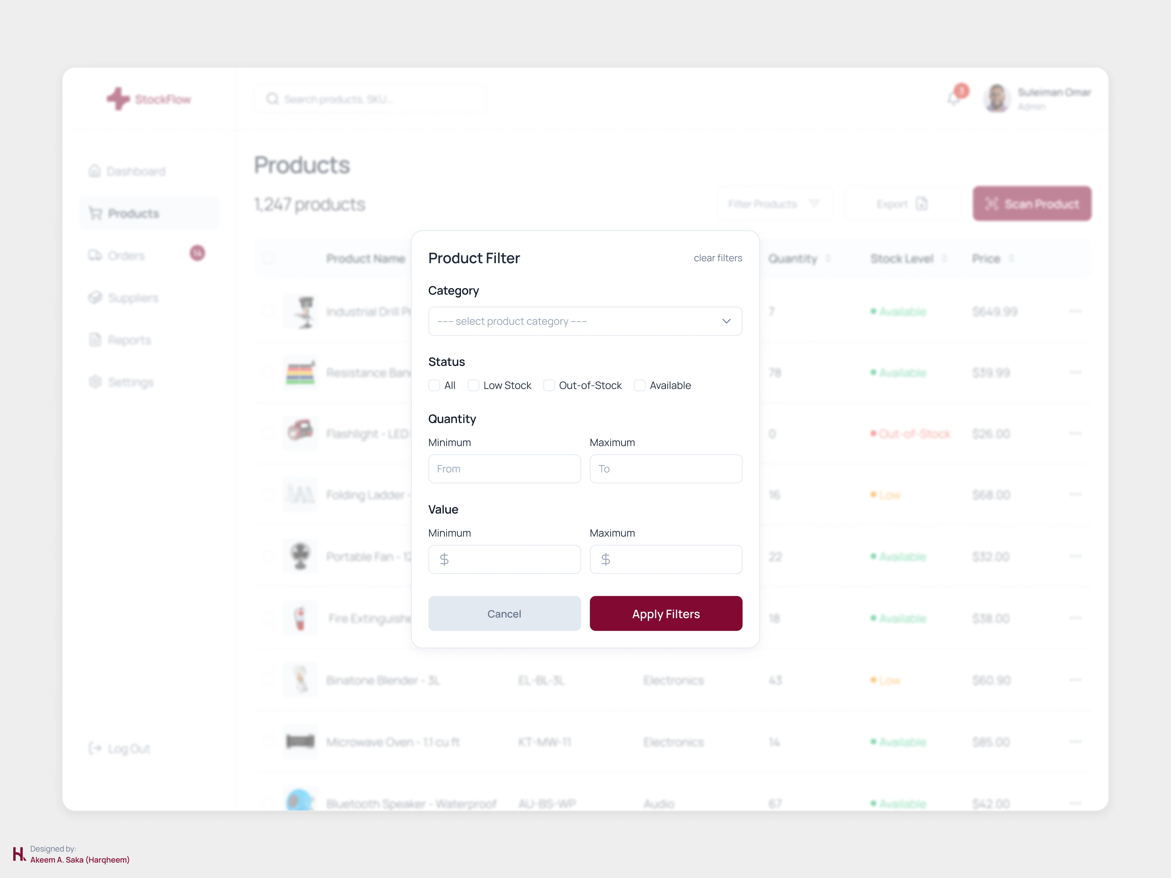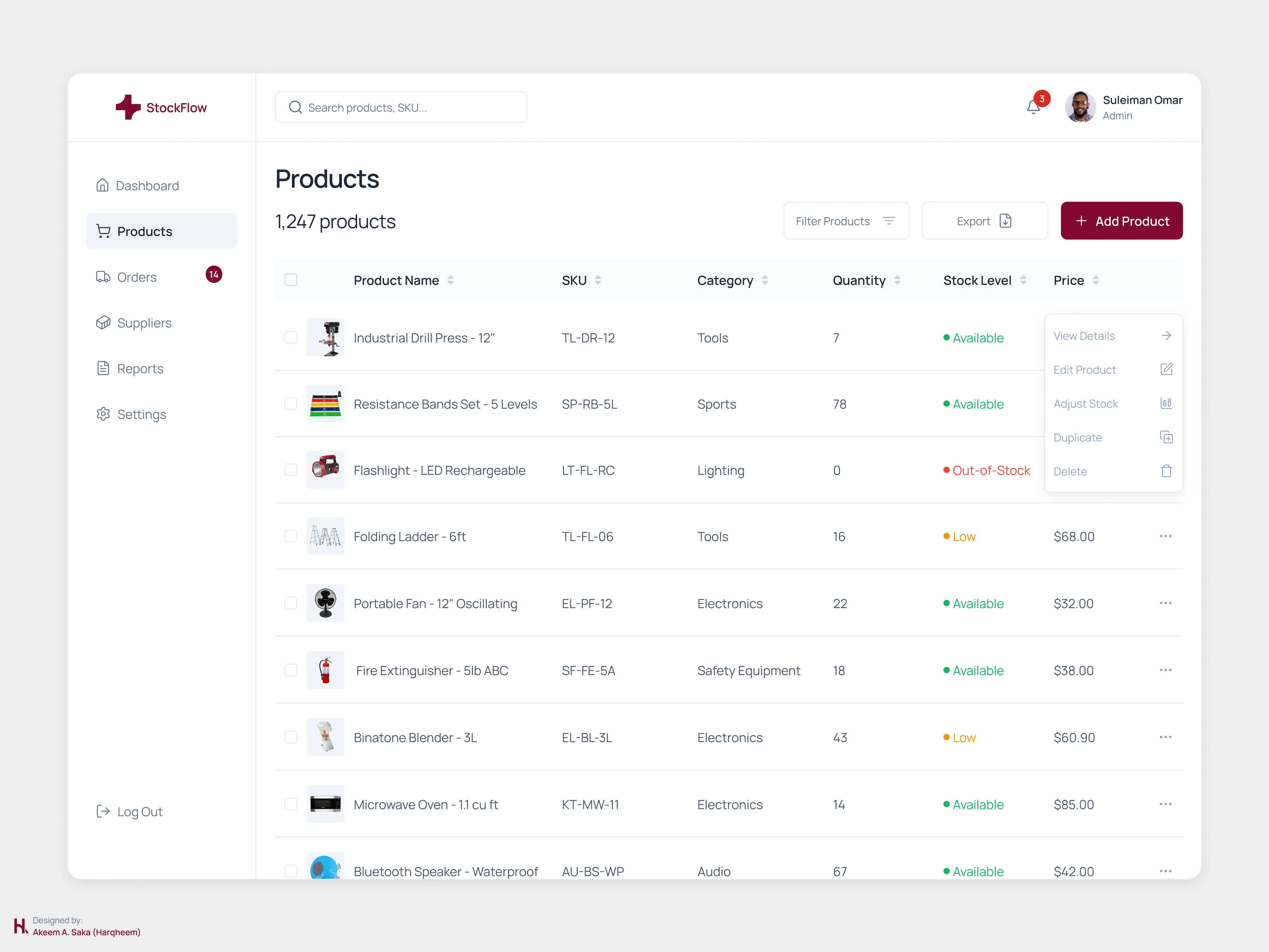 The products table is designed for speed: sort controls on every column, a three-dot action menu per row that expands to contextual options (View, Edit, Adjust Stock, Duplicate, Delete), and a side panel that opens product details without leaving the page. The filter modal lets users slice by category, stock status, and quantity or value range — keeping the main table clean while giving power users full control.