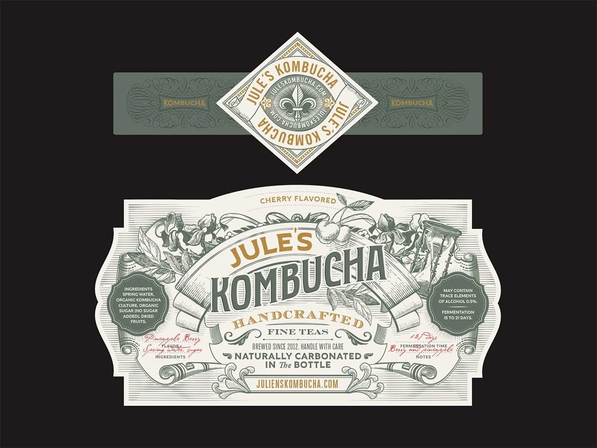 Vintage-style kombucha label with elegant typography, detailed illustrations, and handcrafted design elements for an artisanal beverage brand.