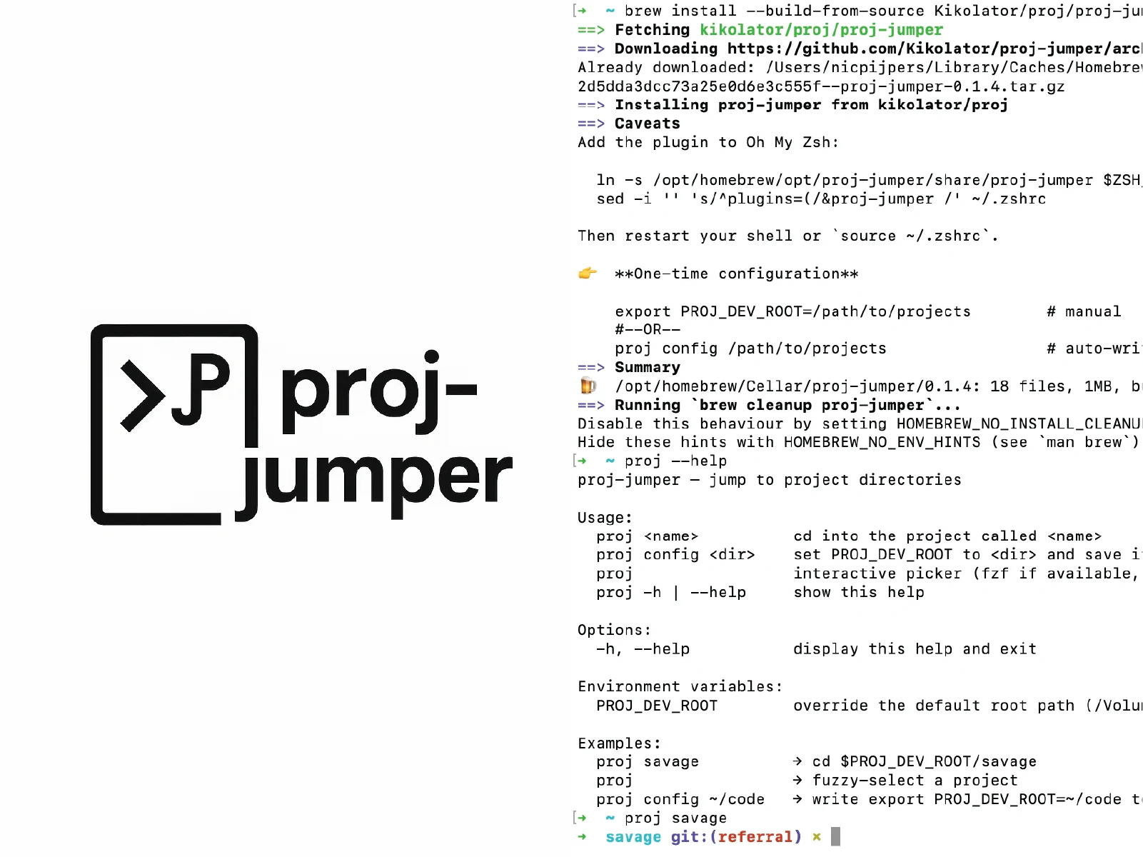 Project Jumper is a tiny, installable Zsh package that lets me jump to my dev projects using a single terminal command: