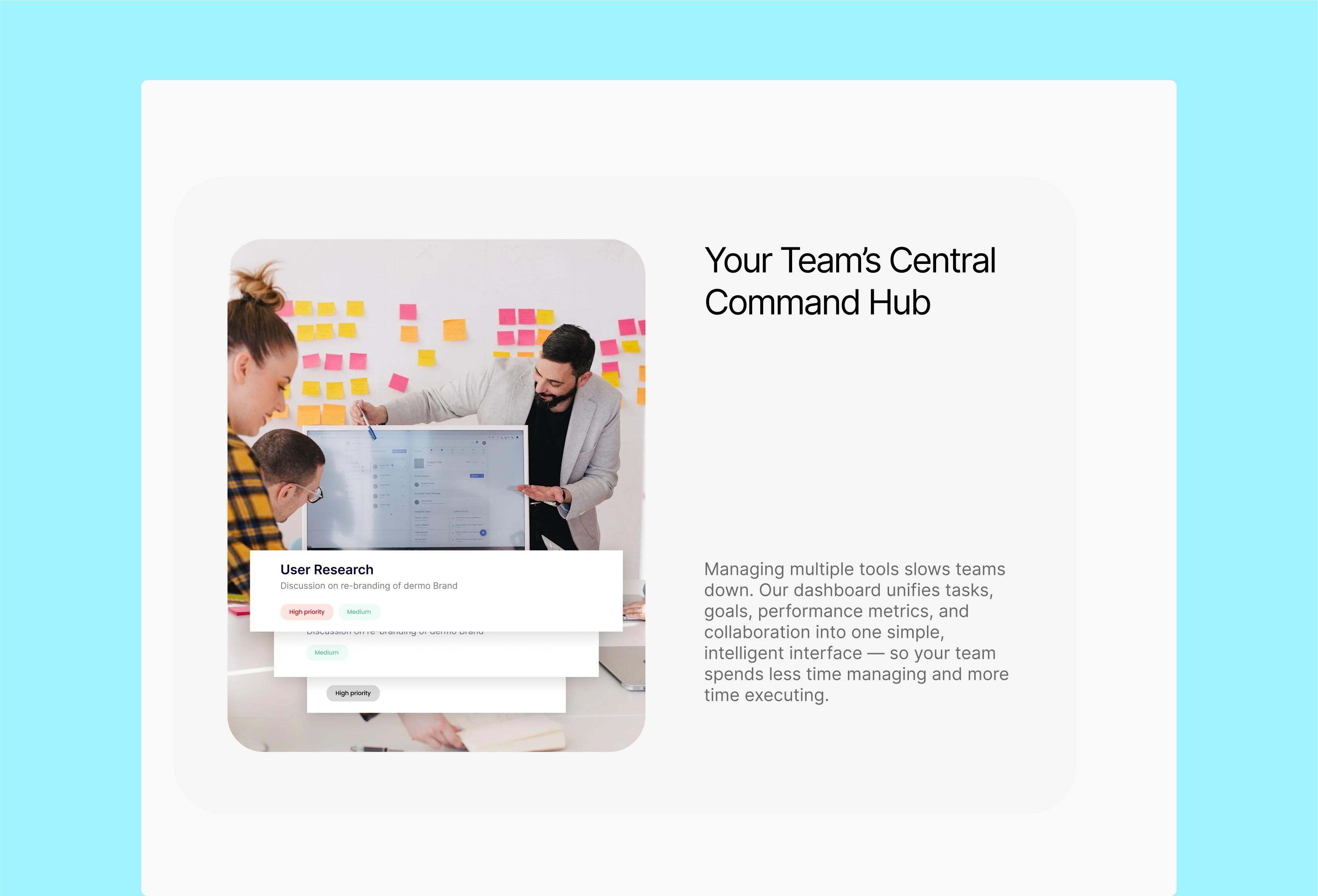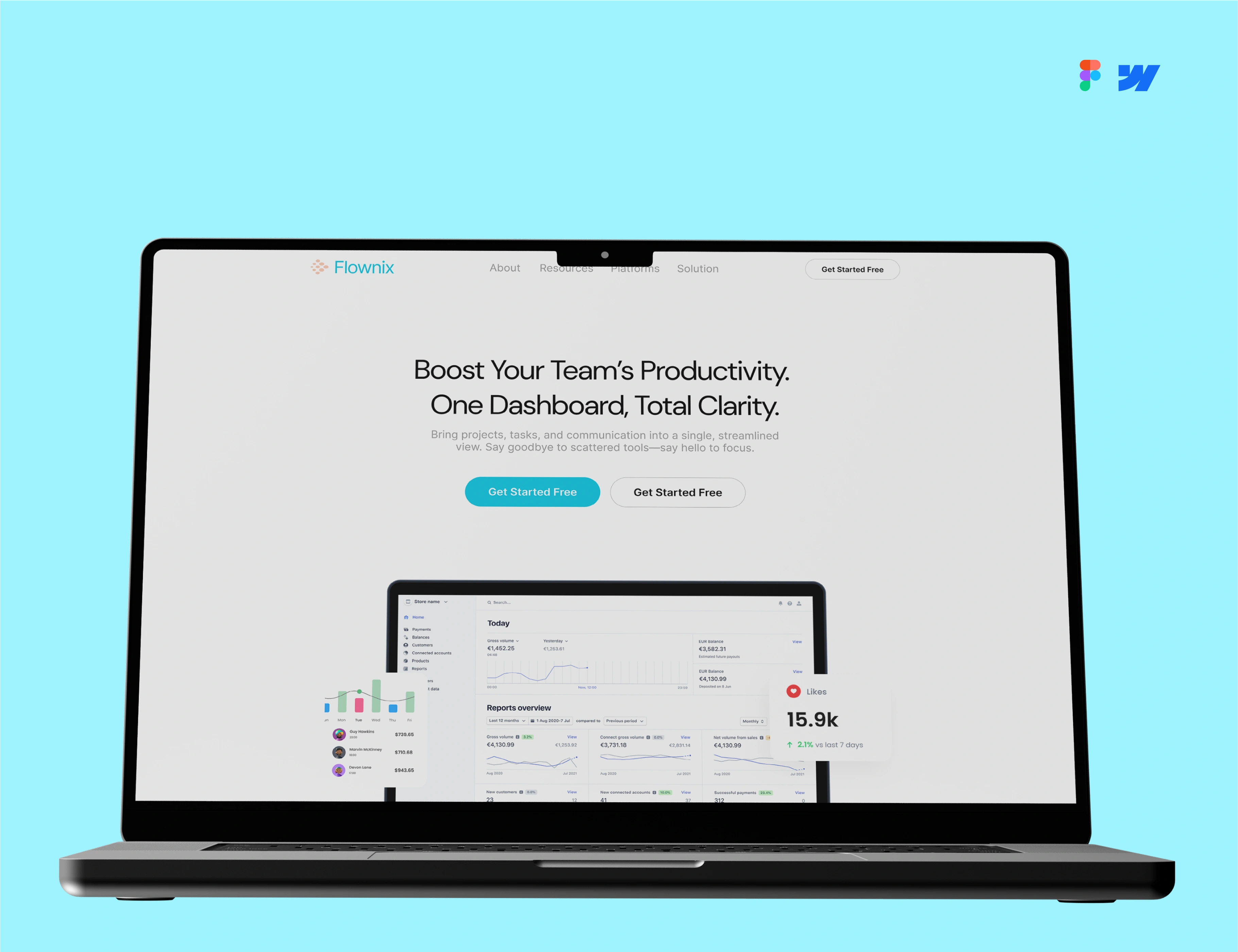 I started with the positioning: “Boost Your Team’s Productivity. One Dashboard, Total Clarity.” From there, the design system emphasized clean layouts, bright highlights, and smooth interactions to reflect focus and simplicity. In Webflow, I built a responsive, conversion-first site with subtle animations that guided users into the product story without distraction.