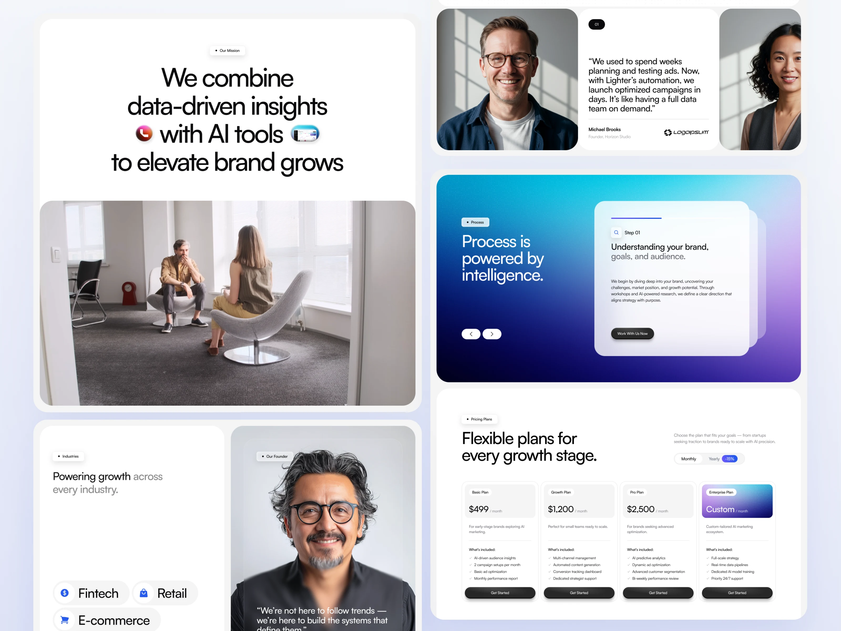 Many marketing agency templates feel cluttered with excessive data and generic stock photos. Our challenge at Kanvas was to design a template that feels light yet powerful, capable of showcasing complex AI services without overwhelming the user.