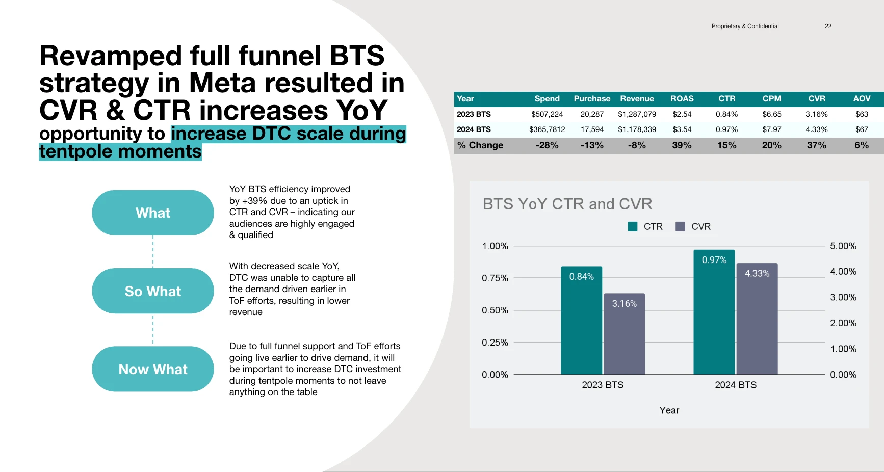 Compared to the previous year, the brand reduced the BTS investment by 28%, limiting the ability to capture peak seasonal demand. The goal was to improve paid efficiency despite reduced scale — and identify where incremental spend should have been deployed to avoid missed revenue opportunities.