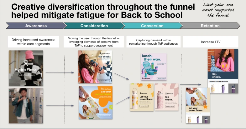 Creative testing focused on diversifying assets throughout the funnel to mitigate creative fatigue. Human elements supported awareness and consideration stages to grow trust and provoke emotion while product-forward assets and seasonal messaging were primarily placed within conversion and retention tactics. By diversifying throughout the funnel, CTR saw a 15% increase YoY.