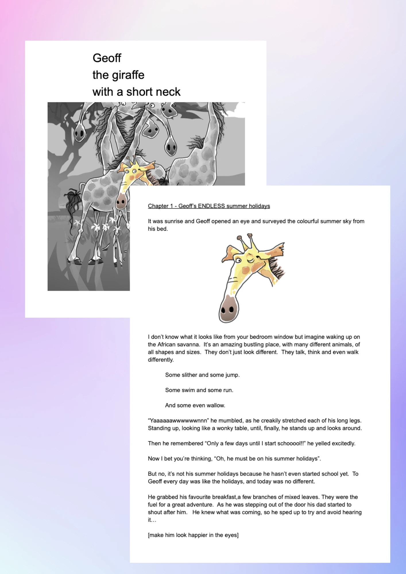 I ghostwrote the manuscript with a warm, playful tone, using Geoff’s short neck as an easy, child-friendly way to explore comparison, self doubt, and belonging. The goal was to keep it fun and readable for children, while letting the message land gently: you don’t have to change who you are to be worthy of friendship, joy, and confidence.