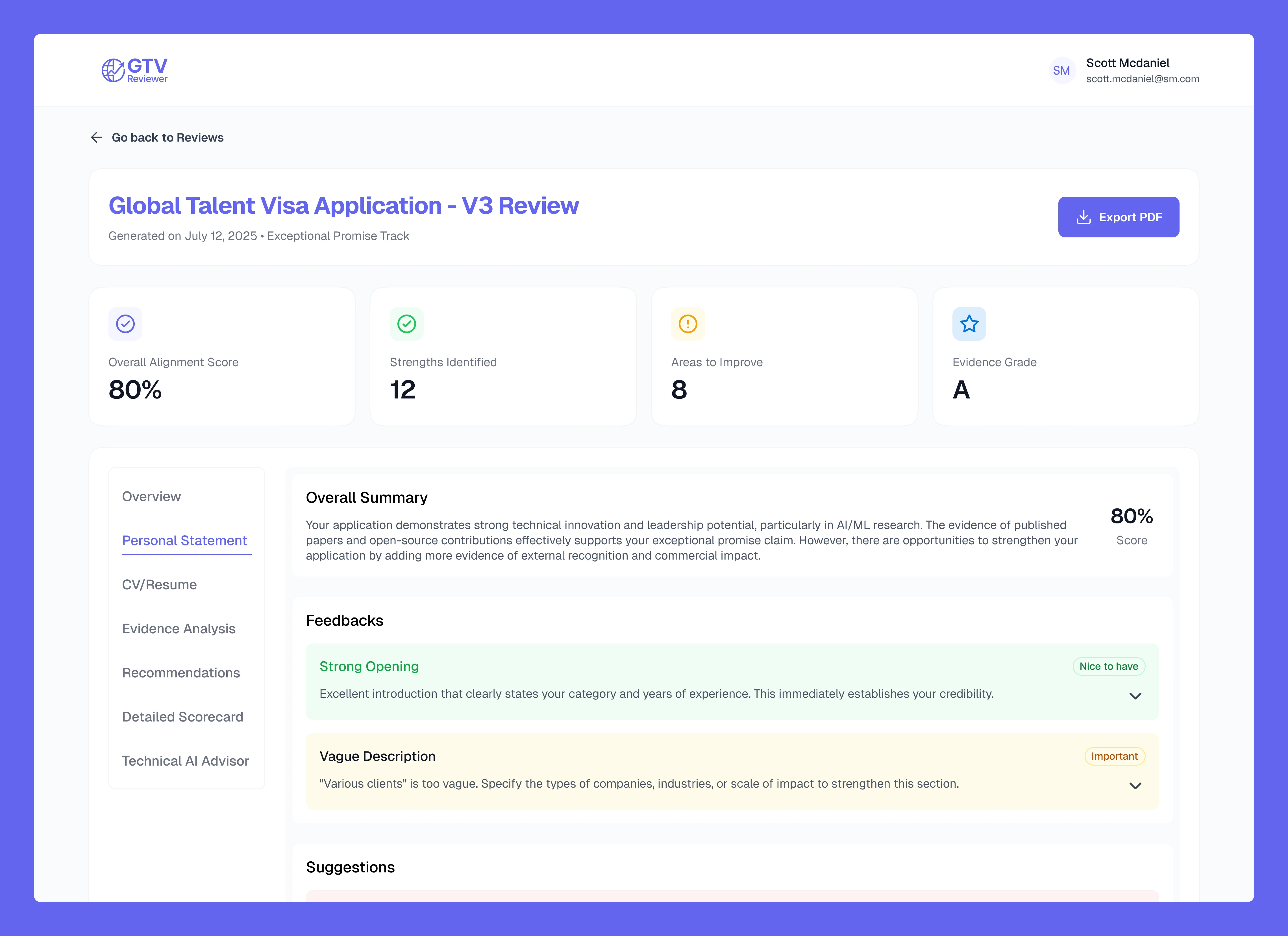 GTV Reviewer is a web application designed to help applicants preparing Global Talent Visa submissions get precise, AI-driven feedback on their materials. Users upload their personal statements, portfolios, and supporting documents and receive structured insights, expert-style analysis, and actionable recommendations aimed at improving their chances of endorsement.
