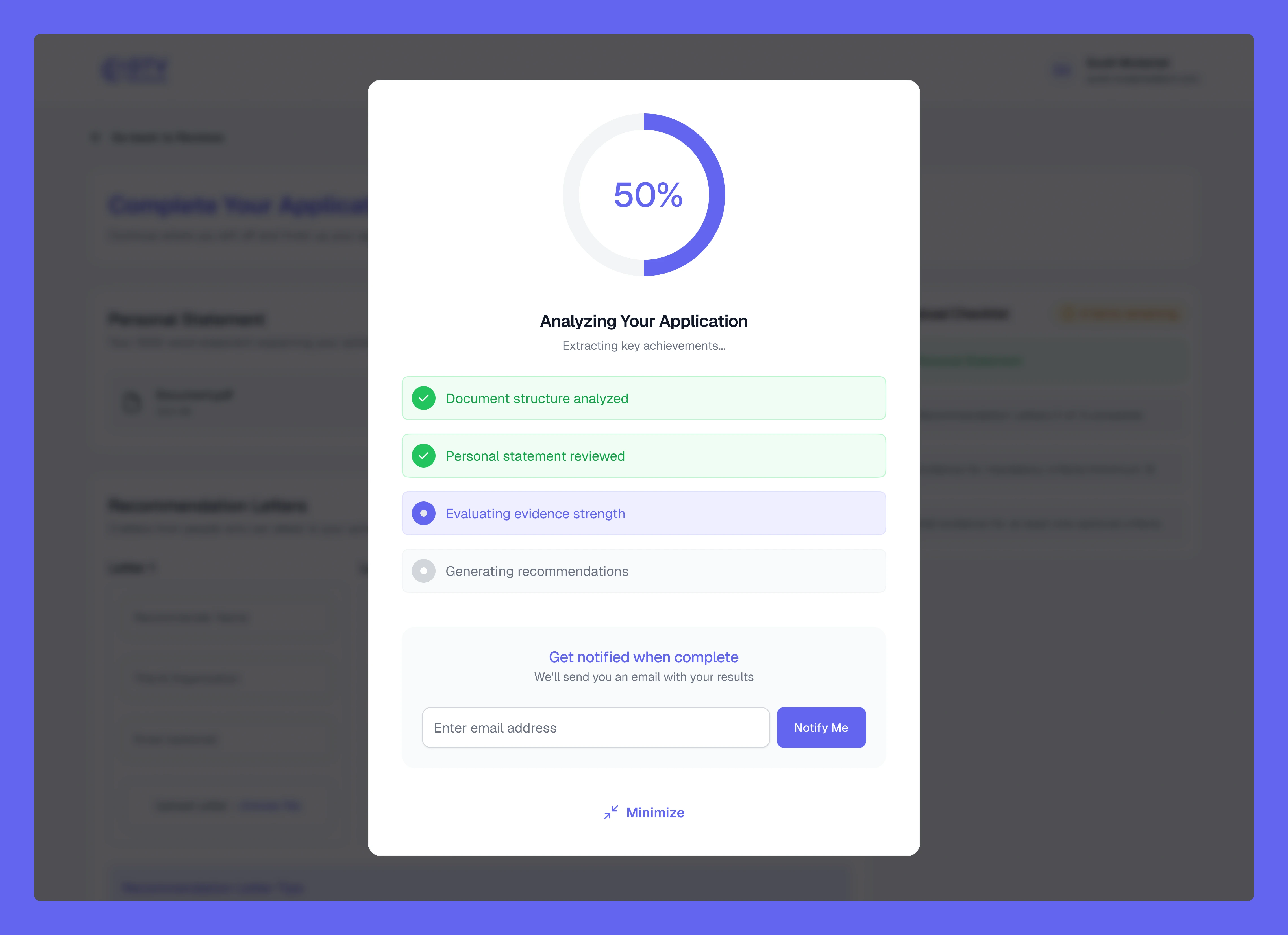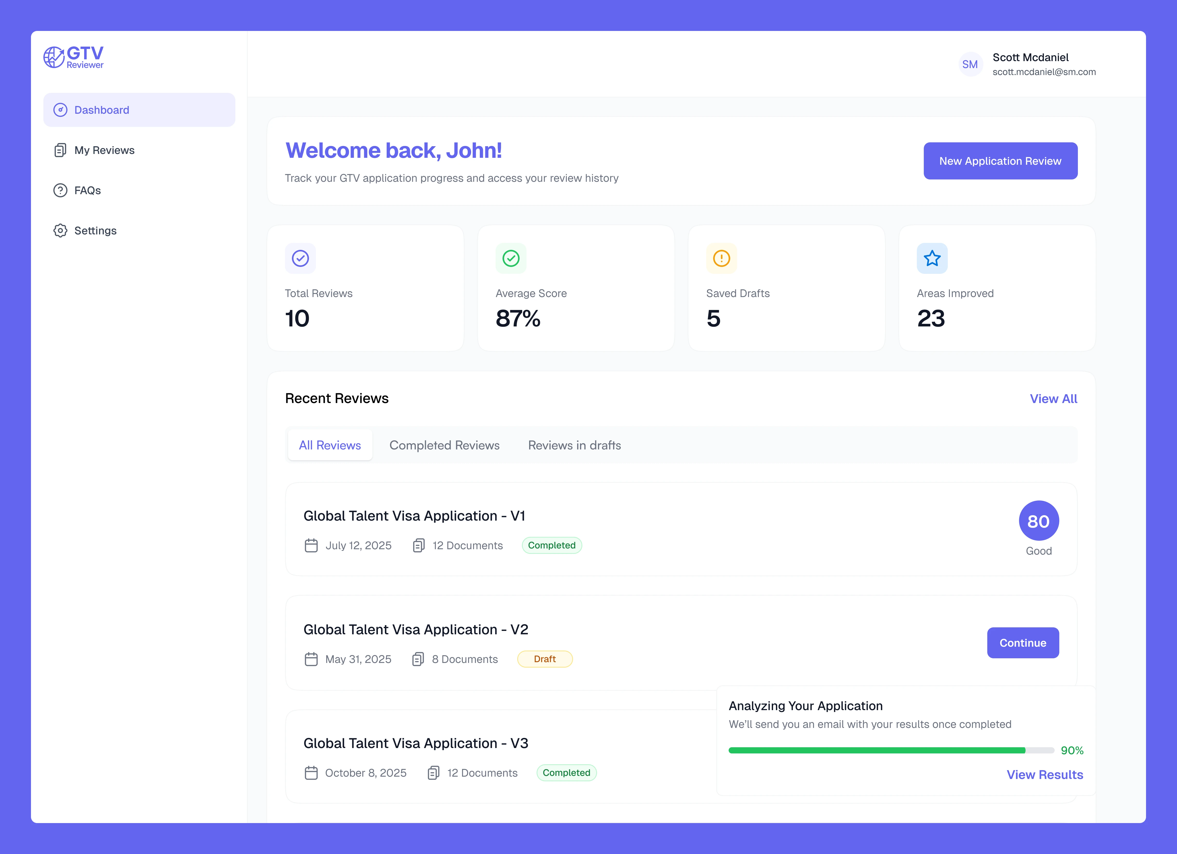 Visa applications—especially for competitive programs like the UK Global Talent Visa—require clear articulation of impact, innovation, and professional strengths. Many applicants struggle to assess their own submissions objectively and lack easy access to high-quality feedback before submission. The goal was to design an intuitive web experience that demystifies the review process and empowers users with AI-generated insights that feel both trustworthy and practical.
