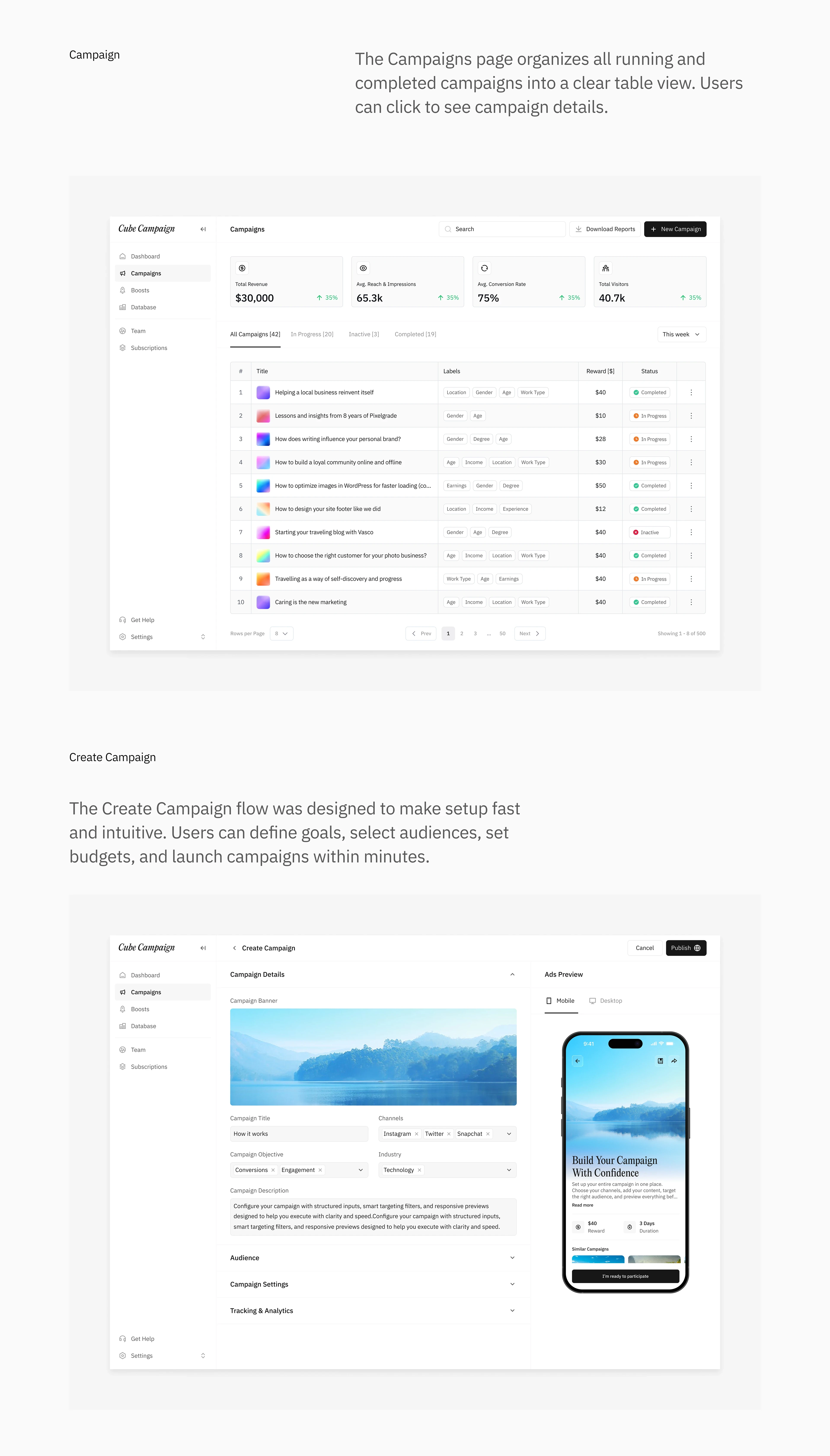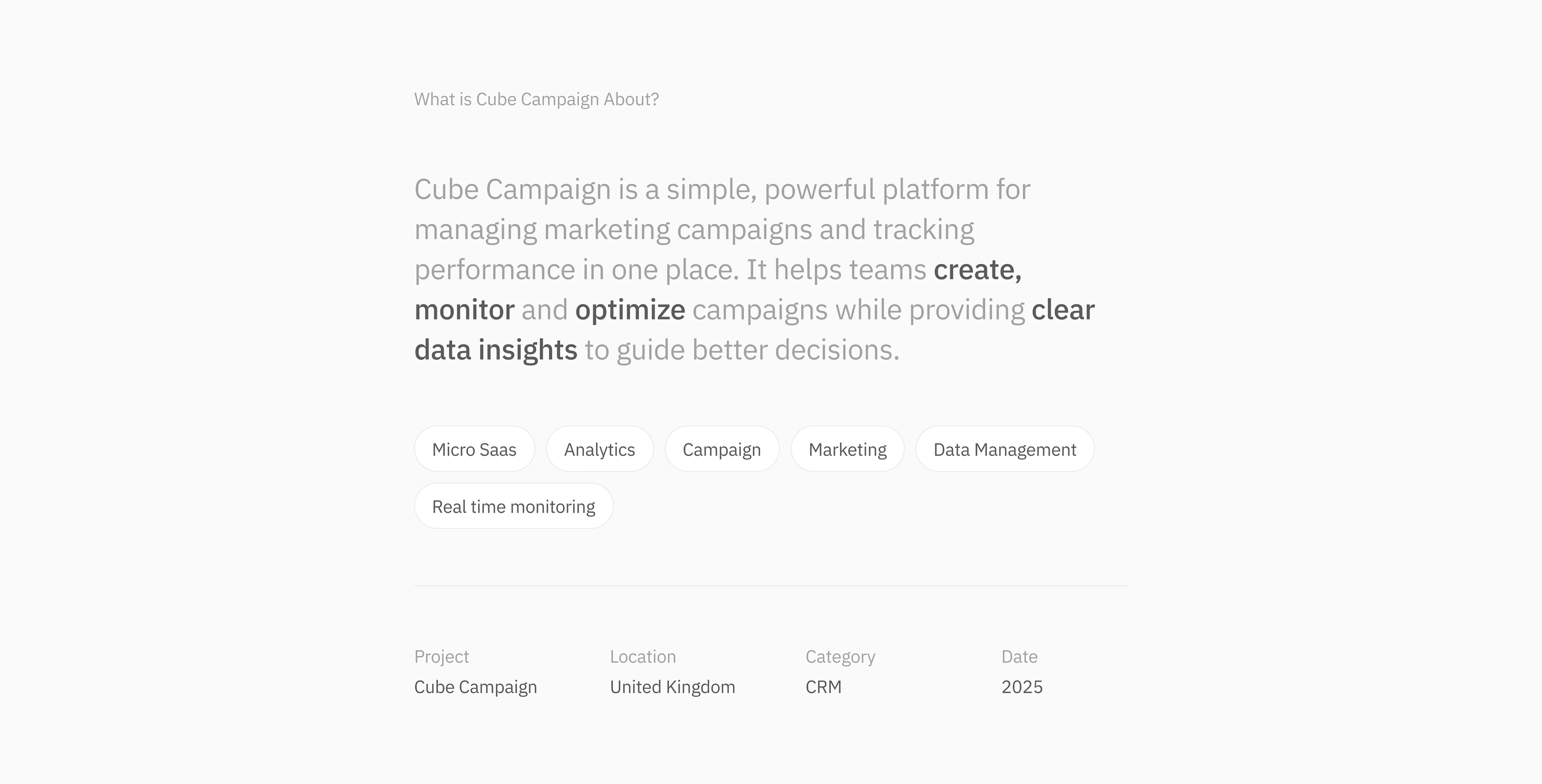Cube Campaign is a simple, powerful platform to manage campaigns and track performance. It helps teams create, monitor and optimize work with clear insights.