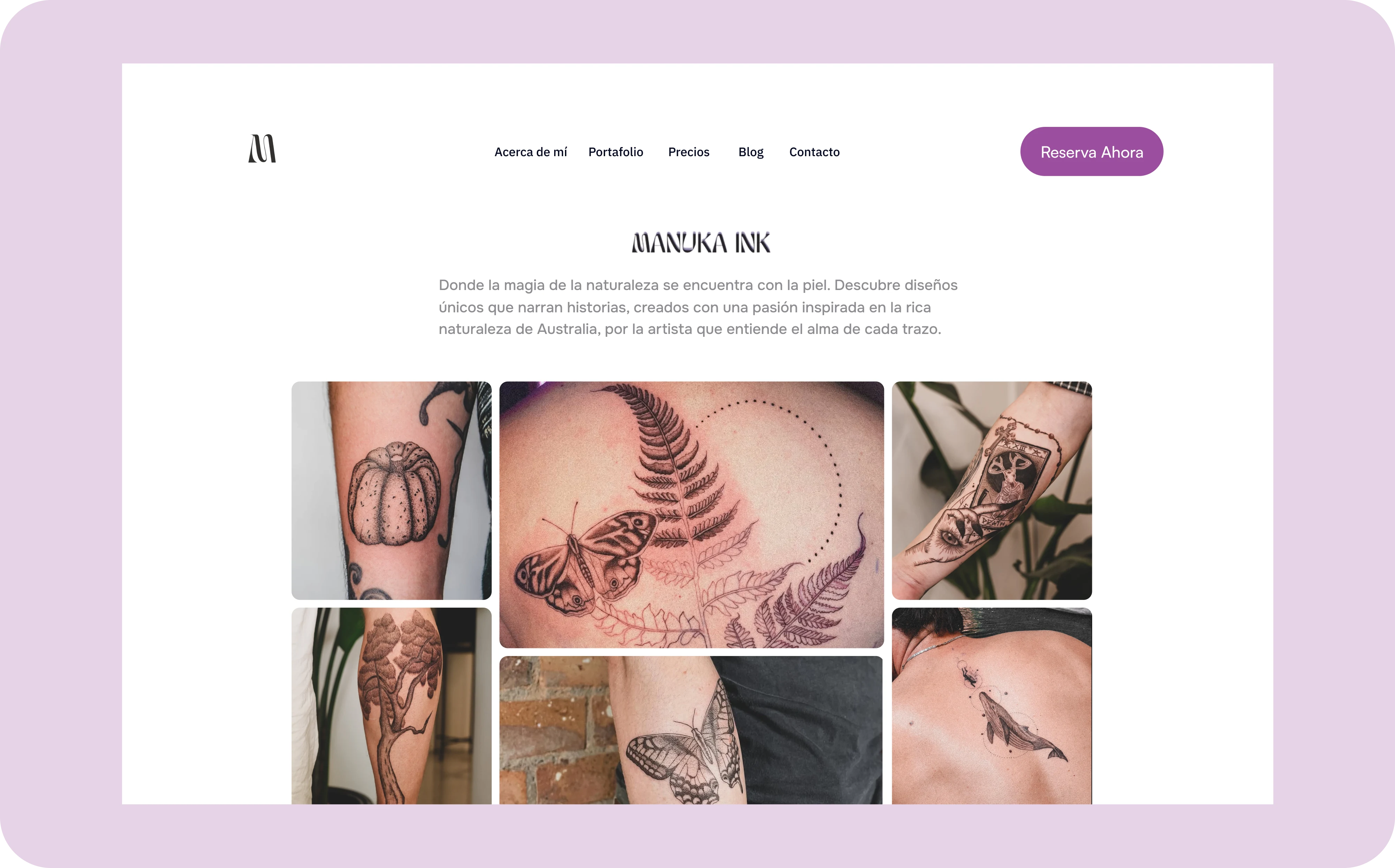 In Figma, I built the site visuals: curated tattoo photography, chosen typography, white space, image grids, gallery views. Focused on organic elements, rounded corners, subtle textures, breathing space, to echo the natural approach in Manu’s work.