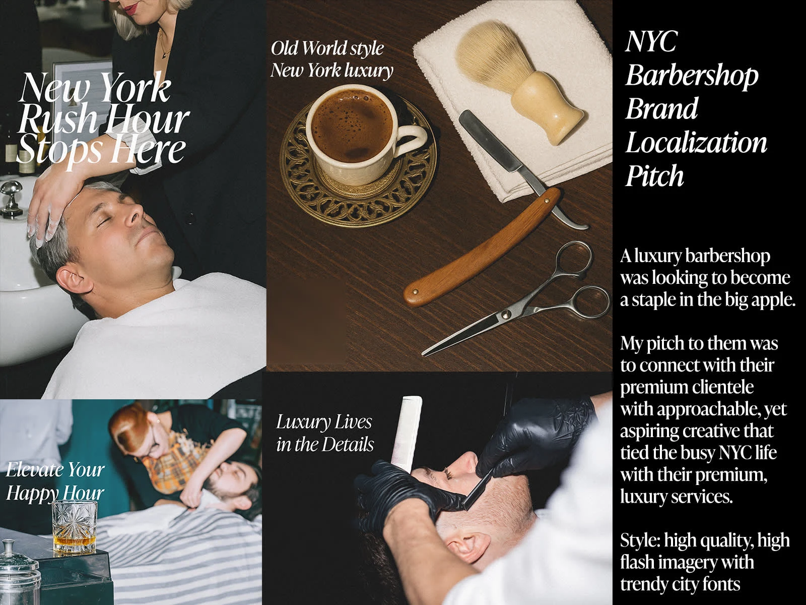 The following are creatives from a pitch deck to help a premium NYC barbershop who is looking to build brand awareness and a connected tie to the city.
