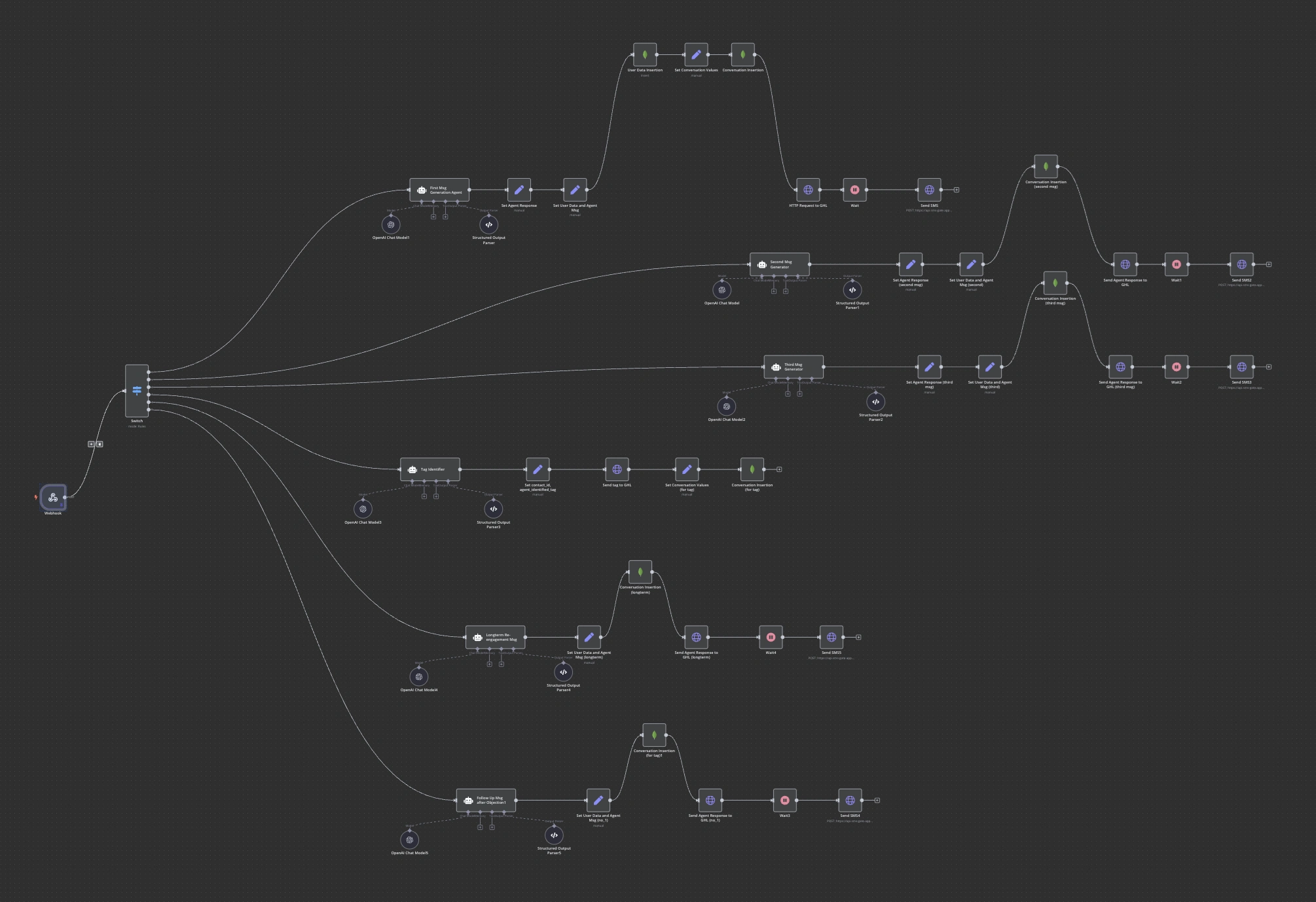 I designed and implemented a multi-agent automation system using n8n to handle complex workflows across multiple services, including Slack, OpenAI, HTTP APIs, and more. I built the system to route different triggers to specialized agents that perform tasks such as data enrichment, report generation, and notifications.