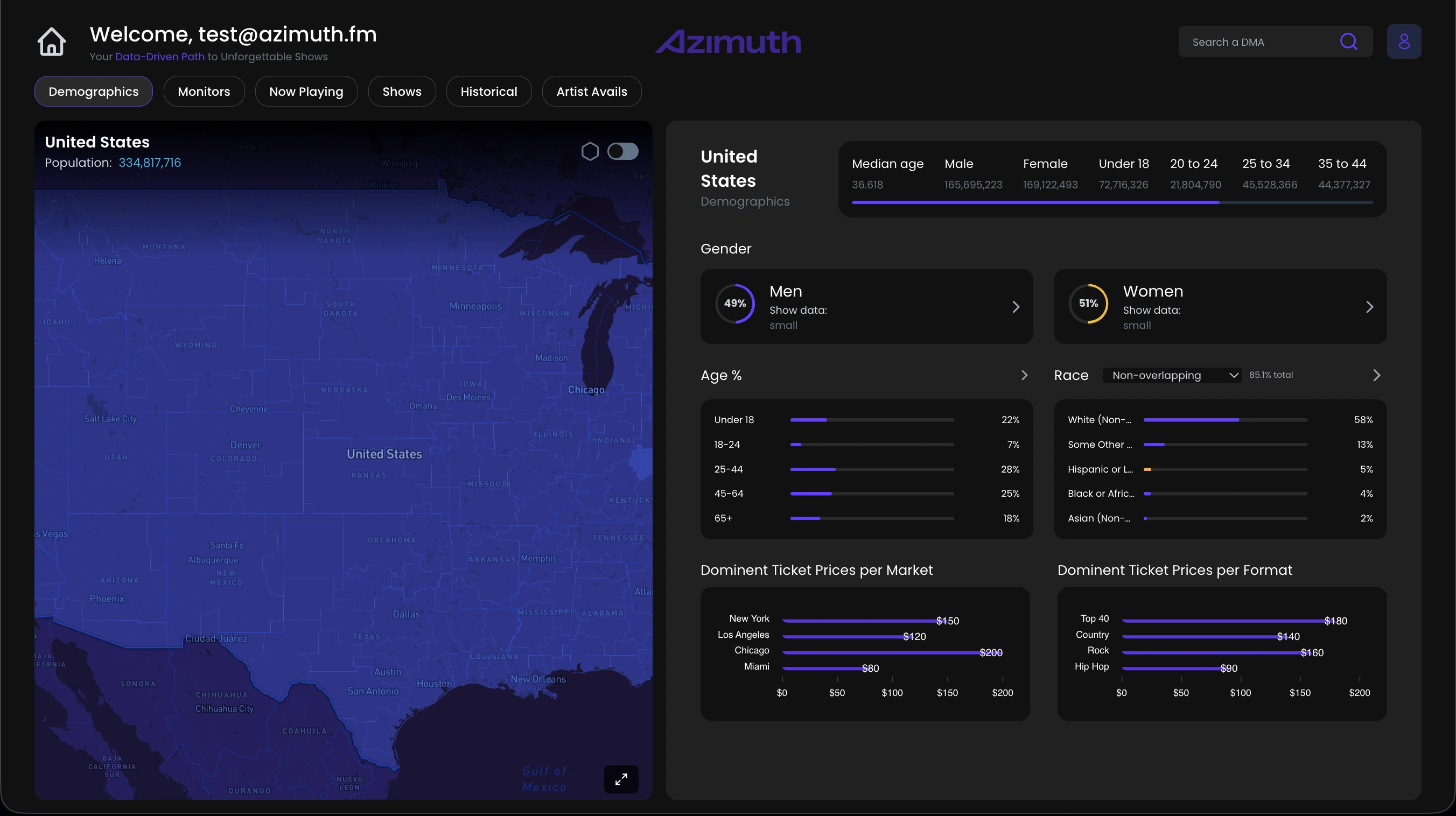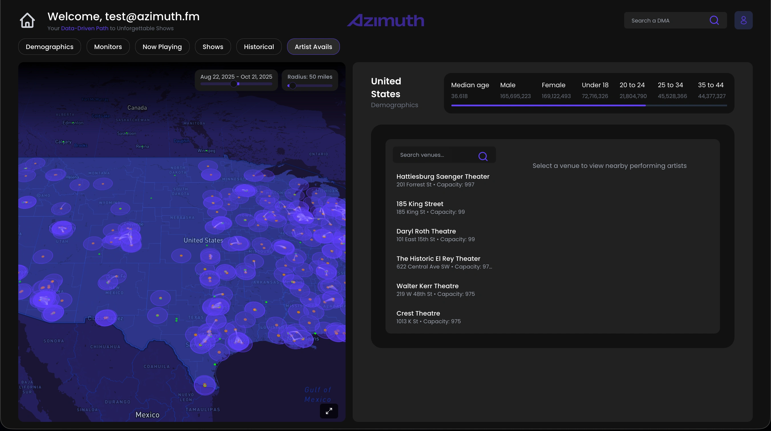 AzimuthLive is a cutting-edge platform developed for a US-based startup to transform how artists, managers, and venues plan concert tours. Built to inject intelligence and precision into the live entertainment industry, it seamlessly blends a robust data infrastructure with an interactive interface to optimize touring routes across the United States.