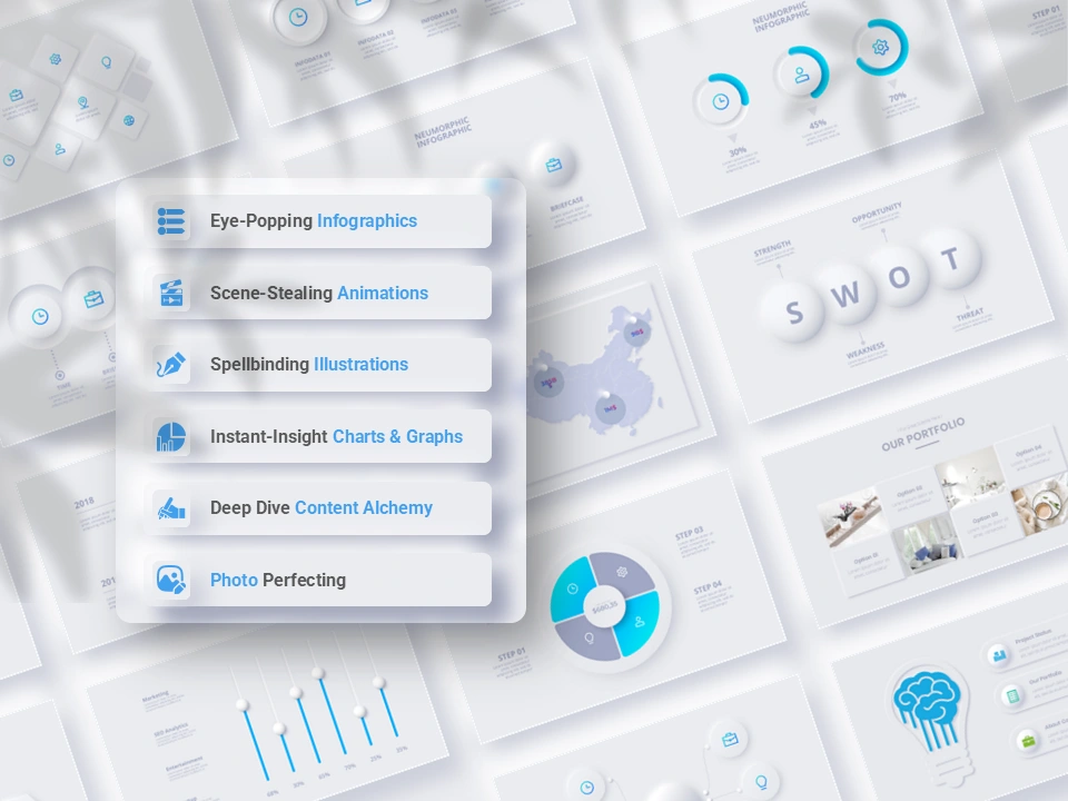 Step into a world where presentations aren't just slides—they're experiences. Right from the first glance, you're greeted with a smooth, soft, almost tangible elegance. The shadows, the layers, the subtle depth—it all whispers one thing: