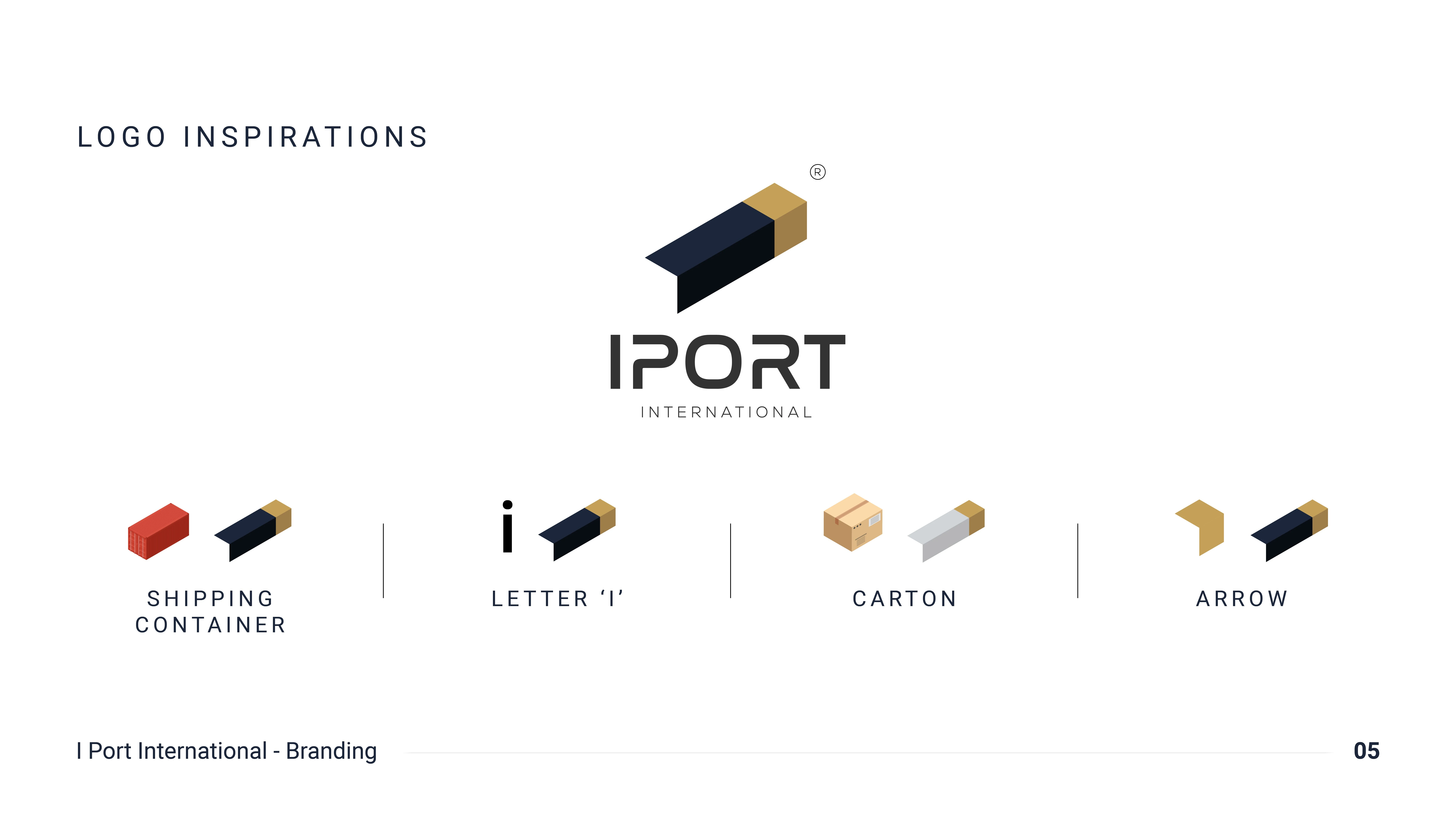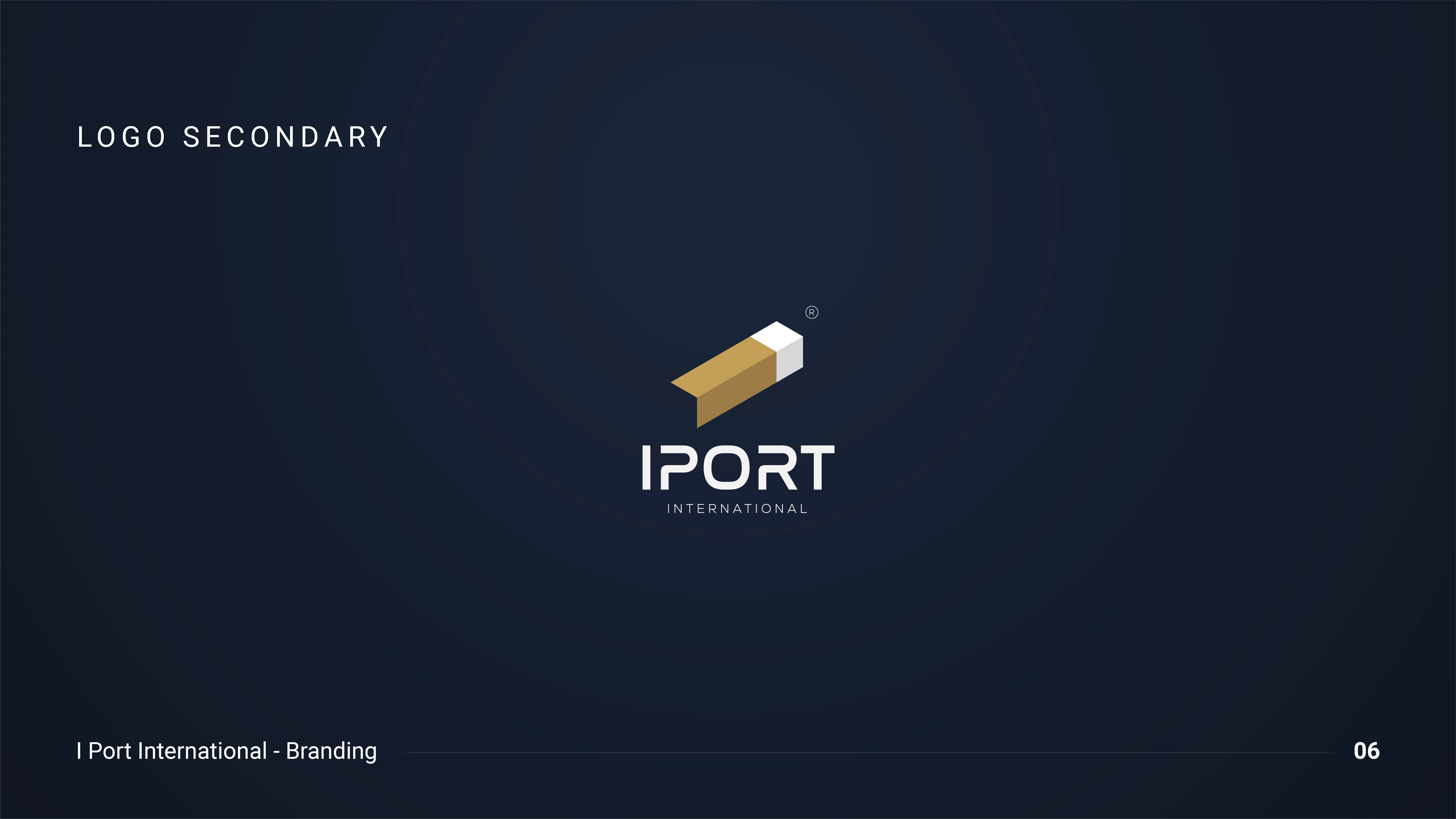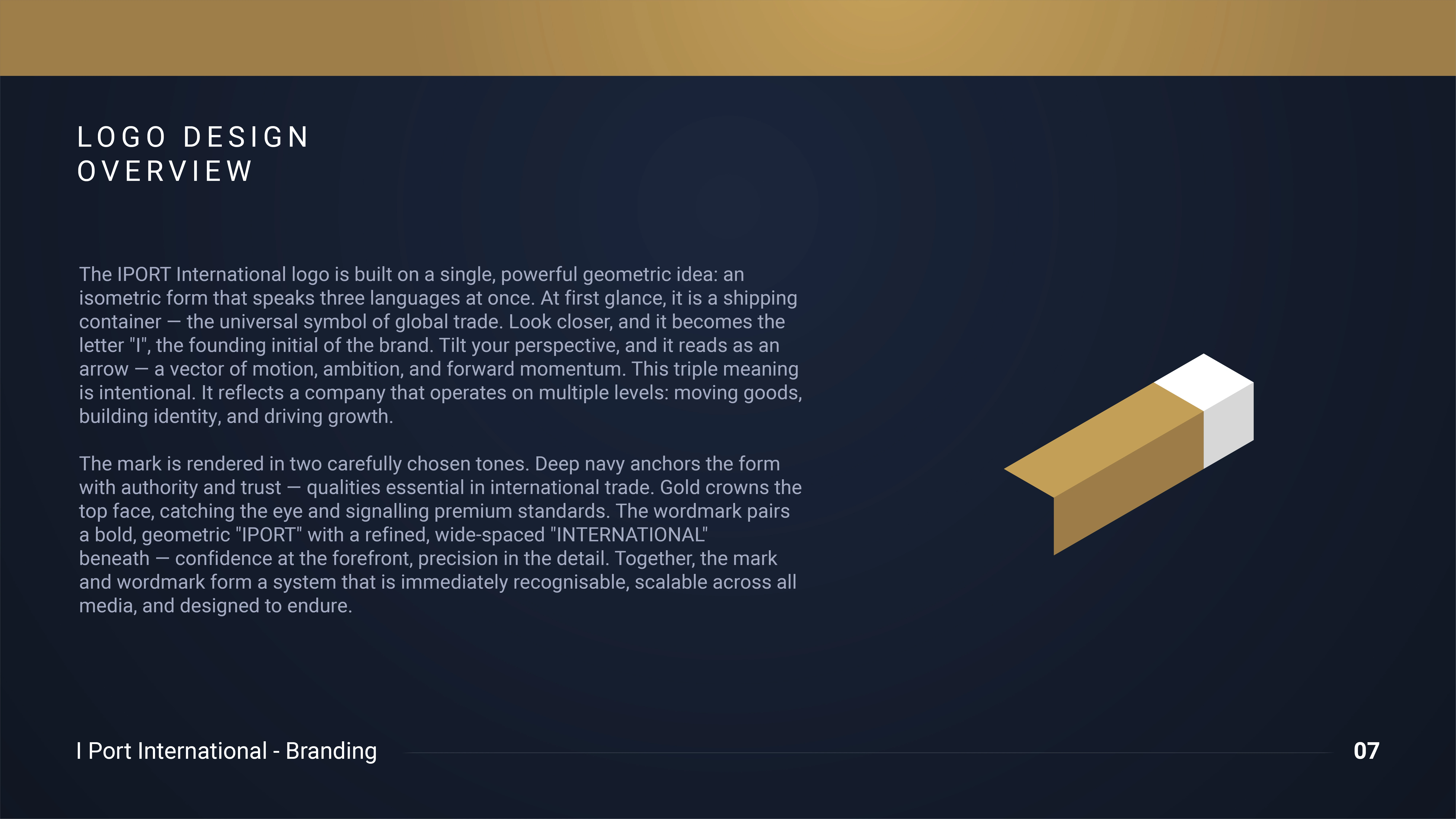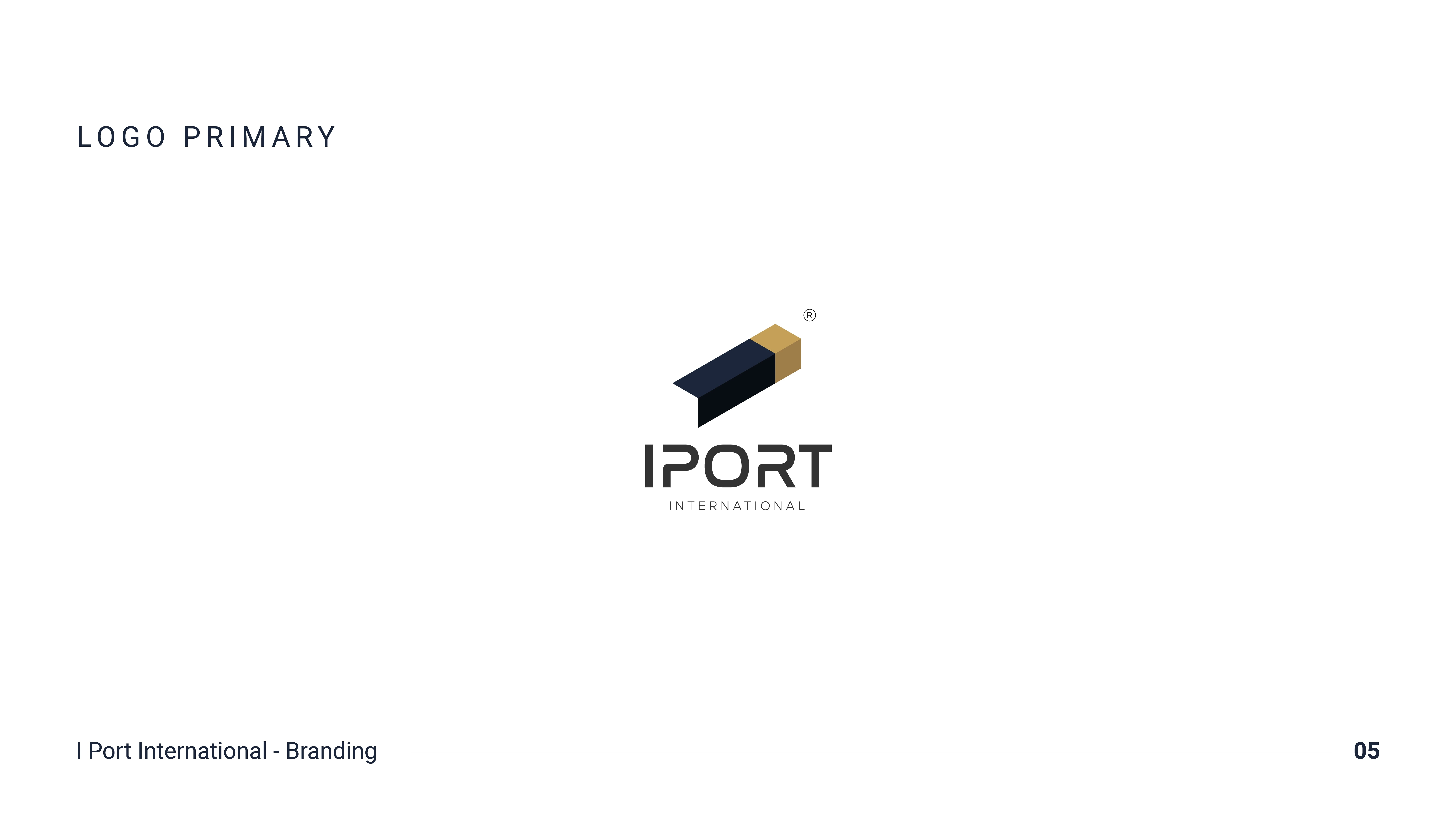 Branding for IPORT International — an import company. Isometric mark reading as a container, letter I, arrow & carton. Navy & gold identity system.