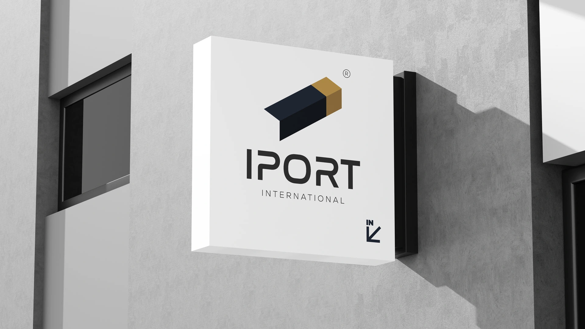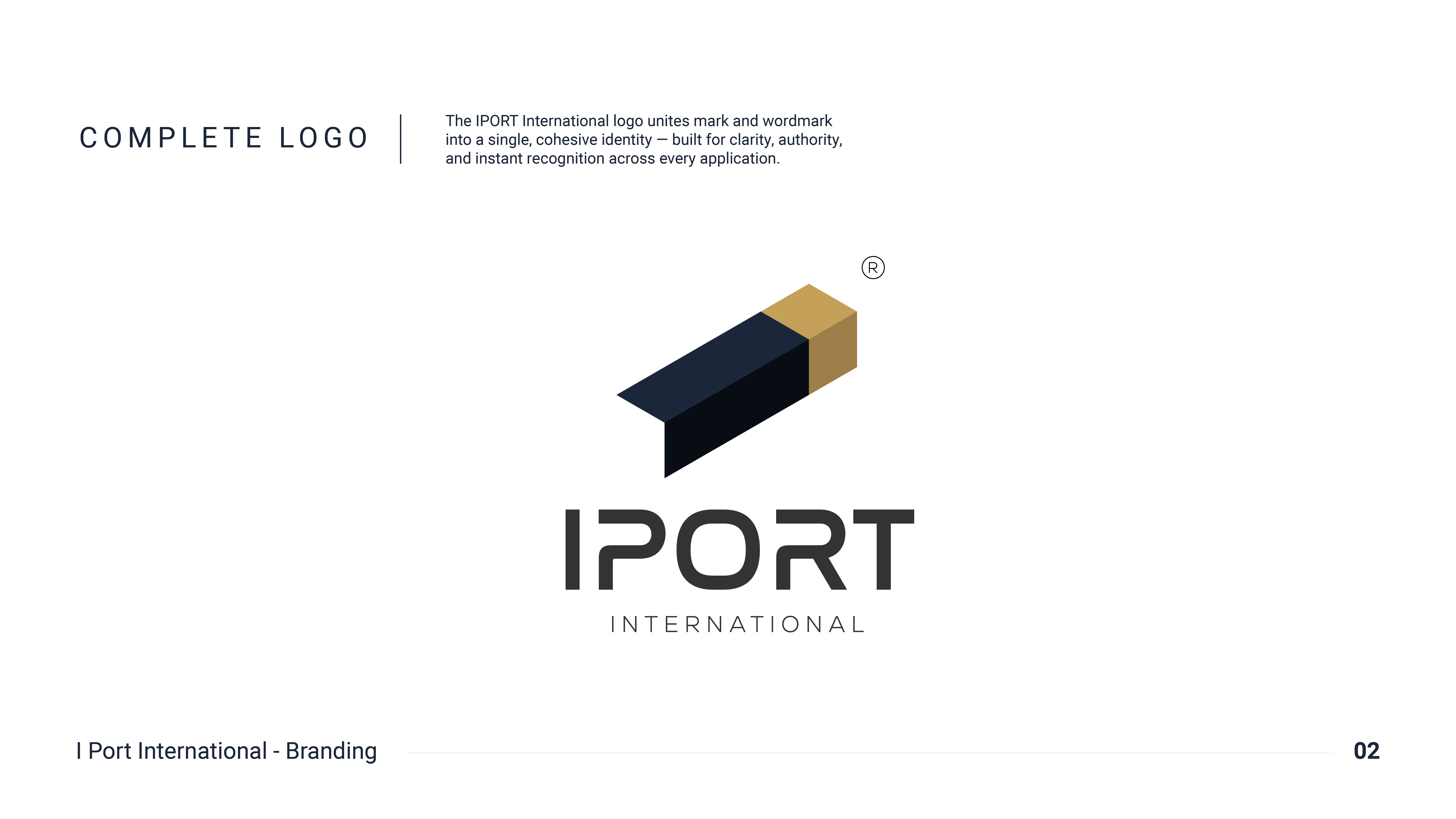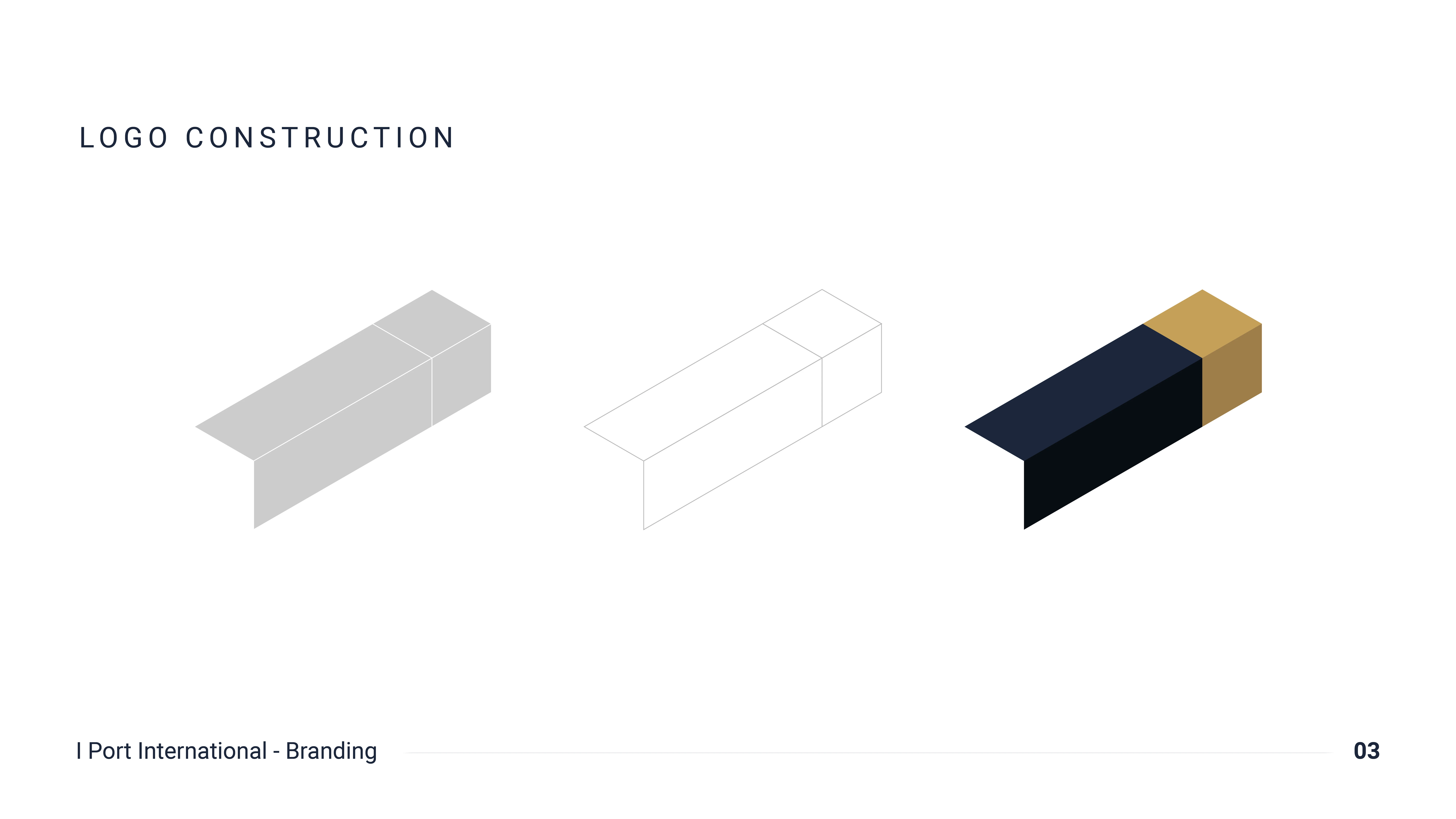 Branding for IPORT International — an import company. Isometric mark reading as a container, letter I, arrow & carton. Navy & gold identity system.