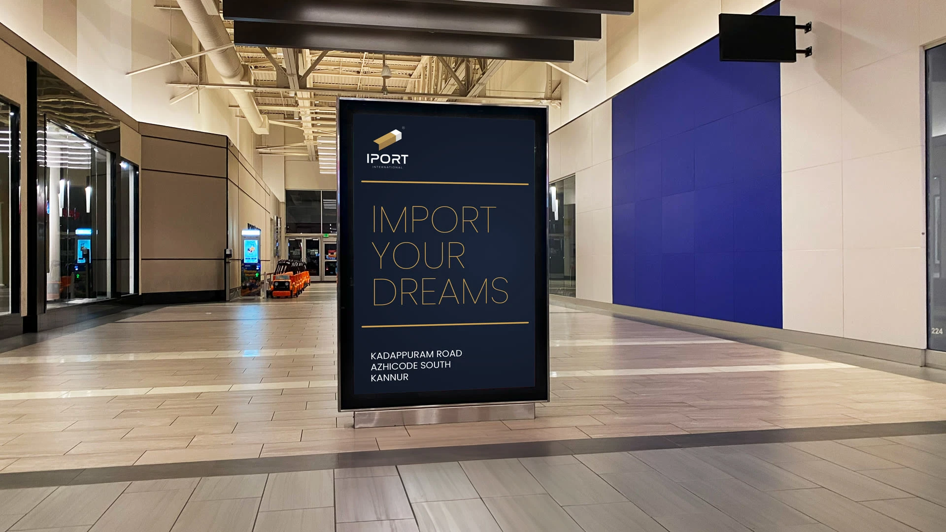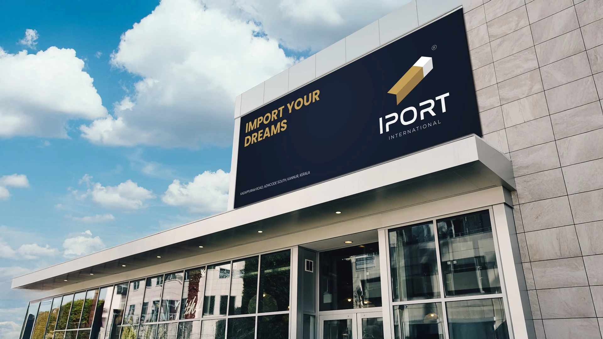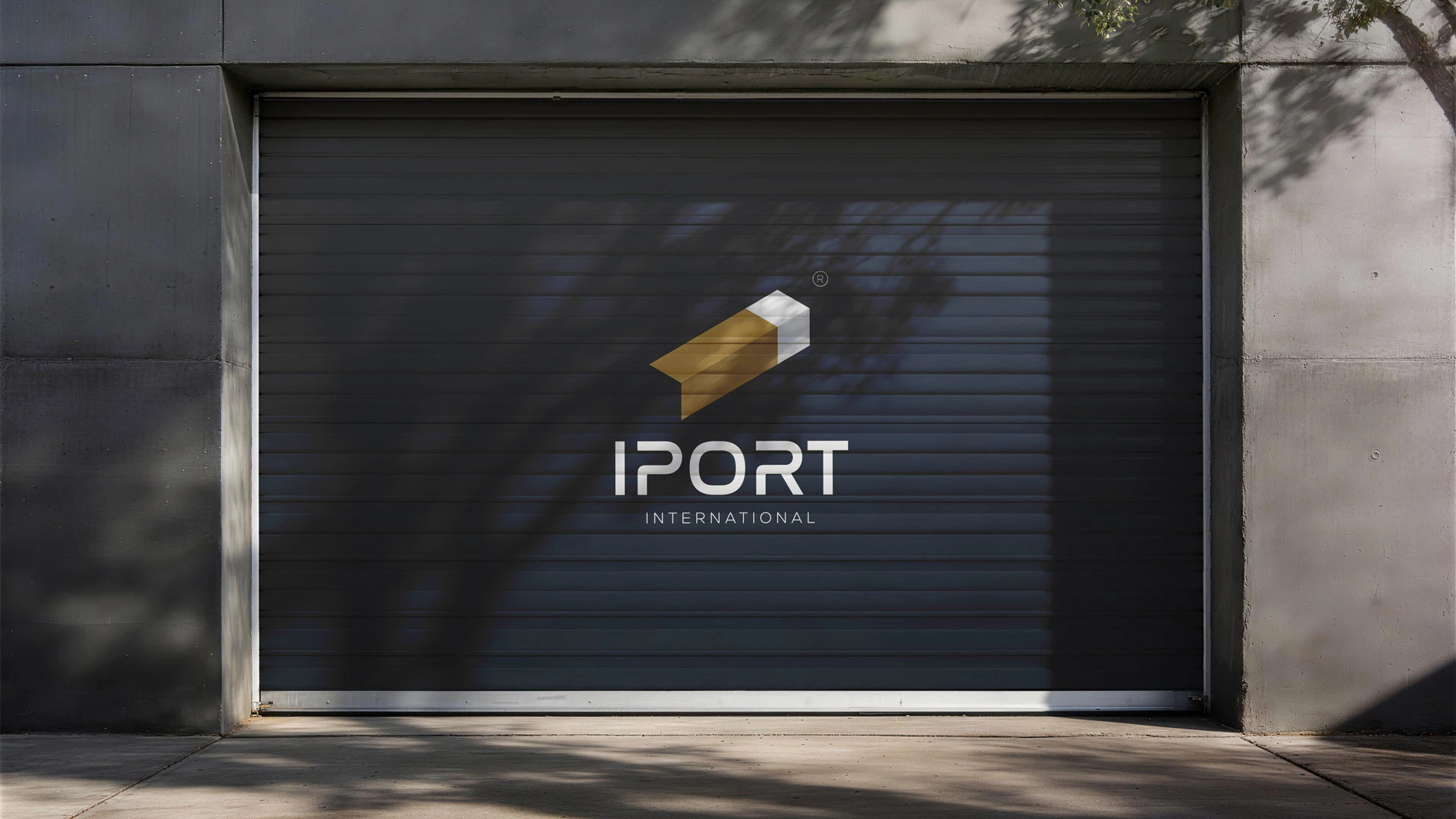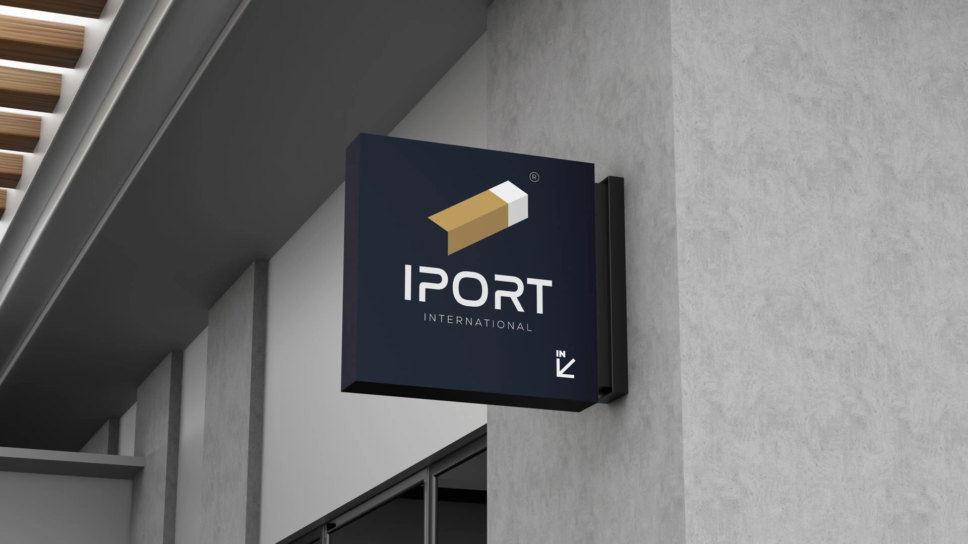 Branding for IPORT International — an import company. Isometric mark reading as a container, letter I, arrow & carton. Navy & gold identity system.