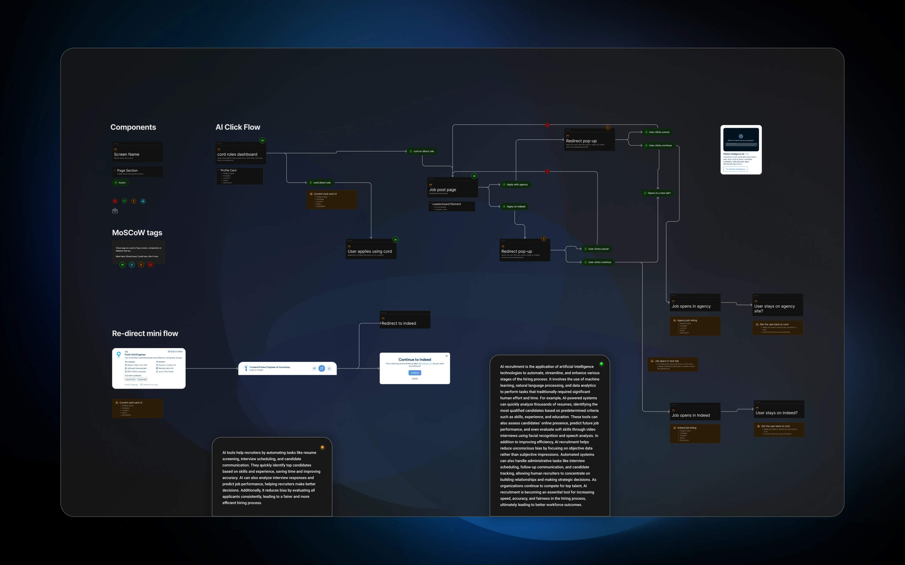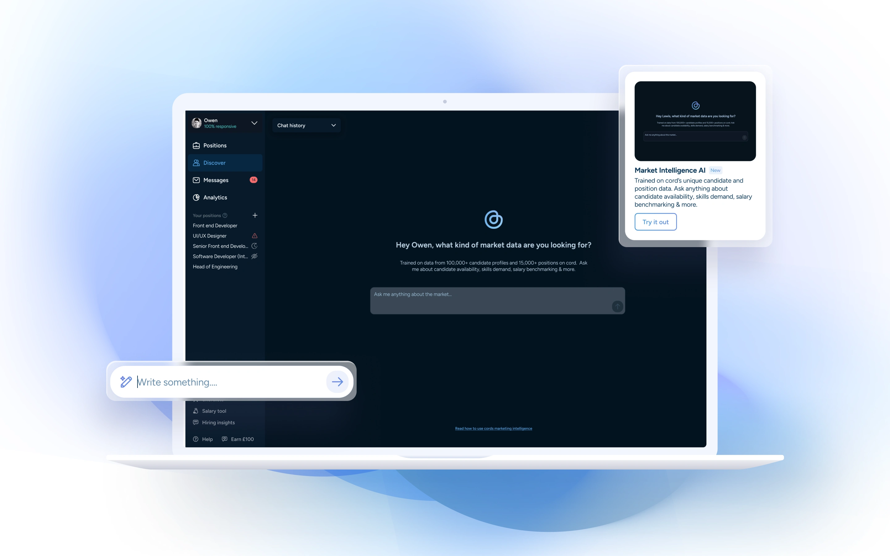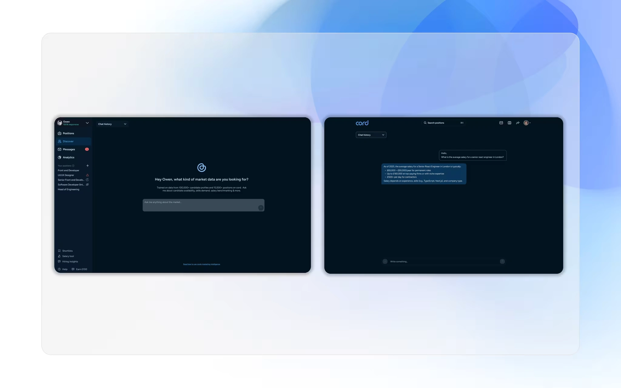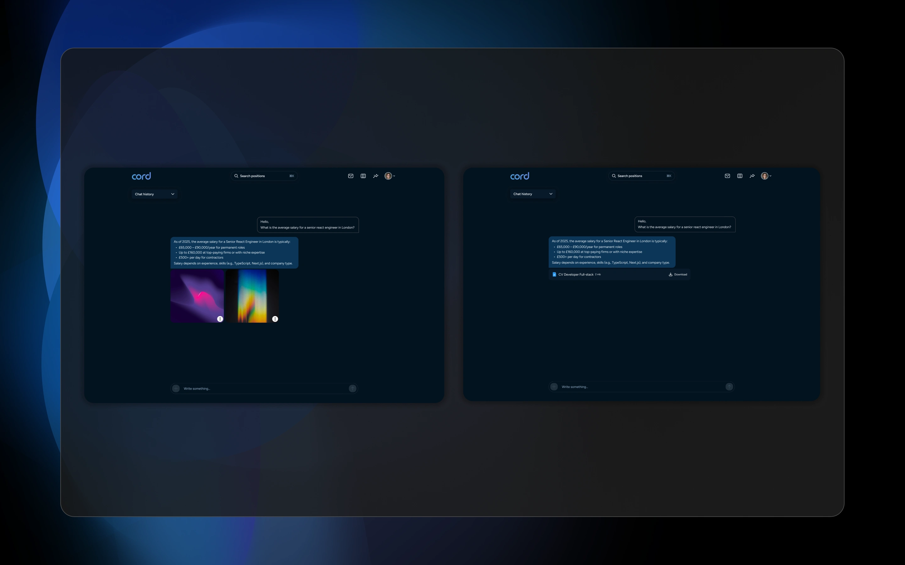 As the sole product designer on Cord’s Market Intelligence tool, I designed an AI-powered interface that helps recruiters access real-time insights - like salary benchmarks and market trends - through natural language queries. The goal was to streamline decision-making while ensuring the experience was intuitive, transparent, and trustworthy. I tackled challenges such as vague user input, trust in AI-generated data, and information overload by introducing guided prompts, modular response components, and source transparency. Through close collaboration with users and engineers, I created a scalable, conversational tool that blends the power of AI with clear, human-centered design - ultimately improving how recruiters gather and act on market data.