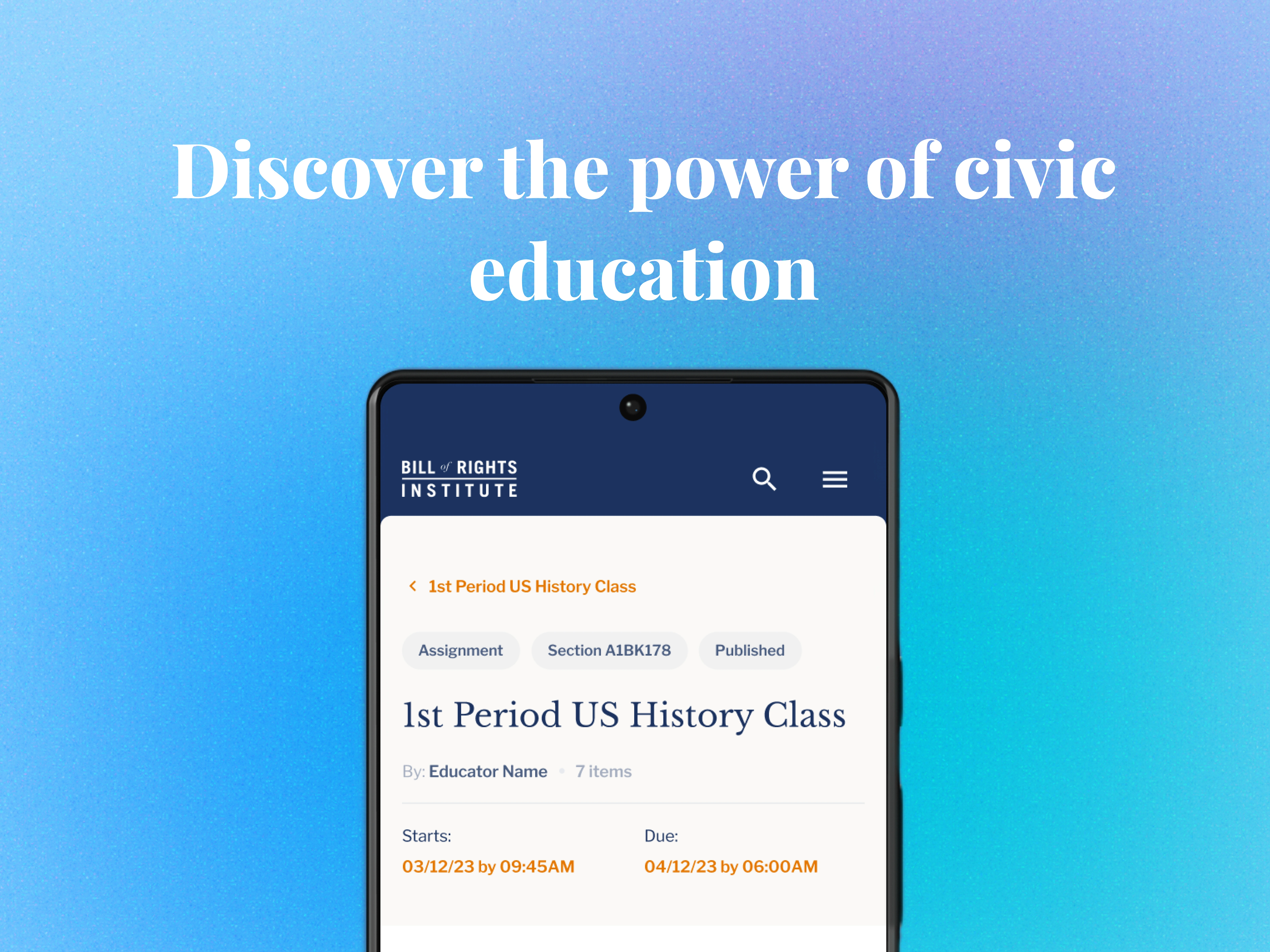 The app serves as a platform for delivering civic education to students through the Bill of Rights Institute mobile app, embodying the following features: