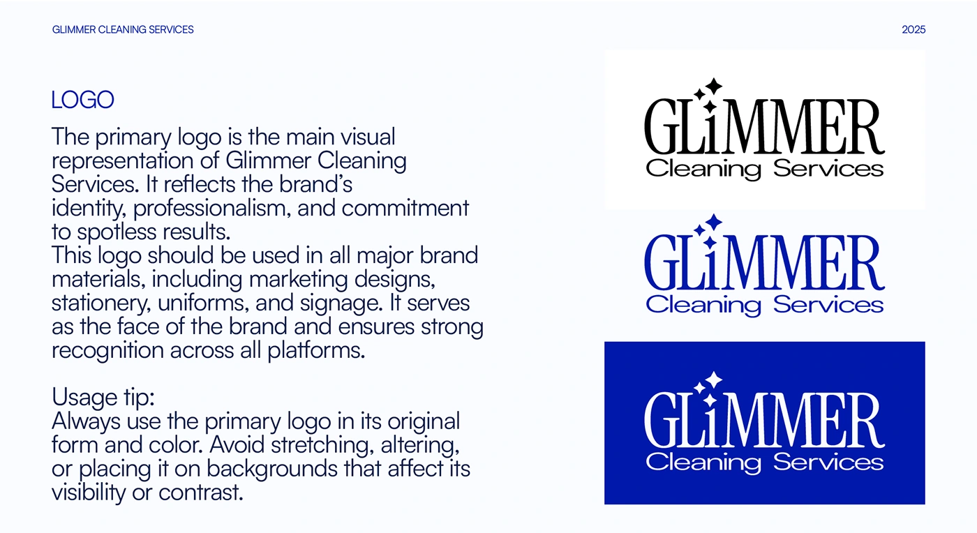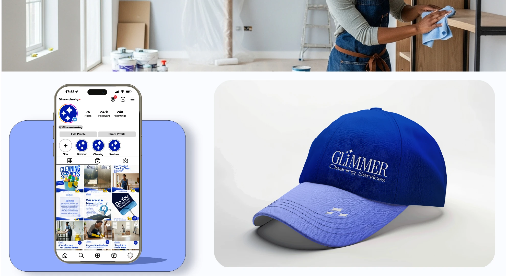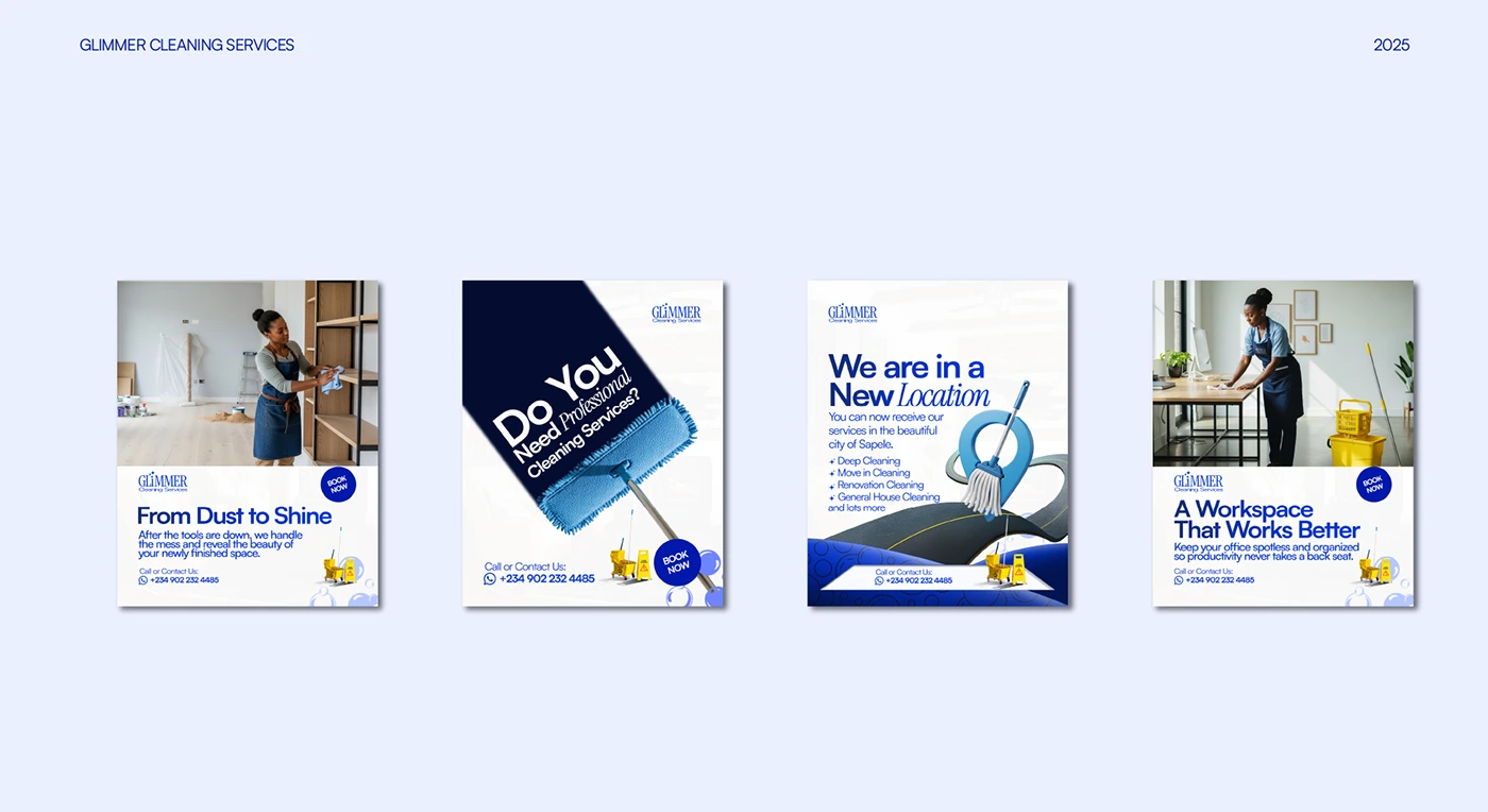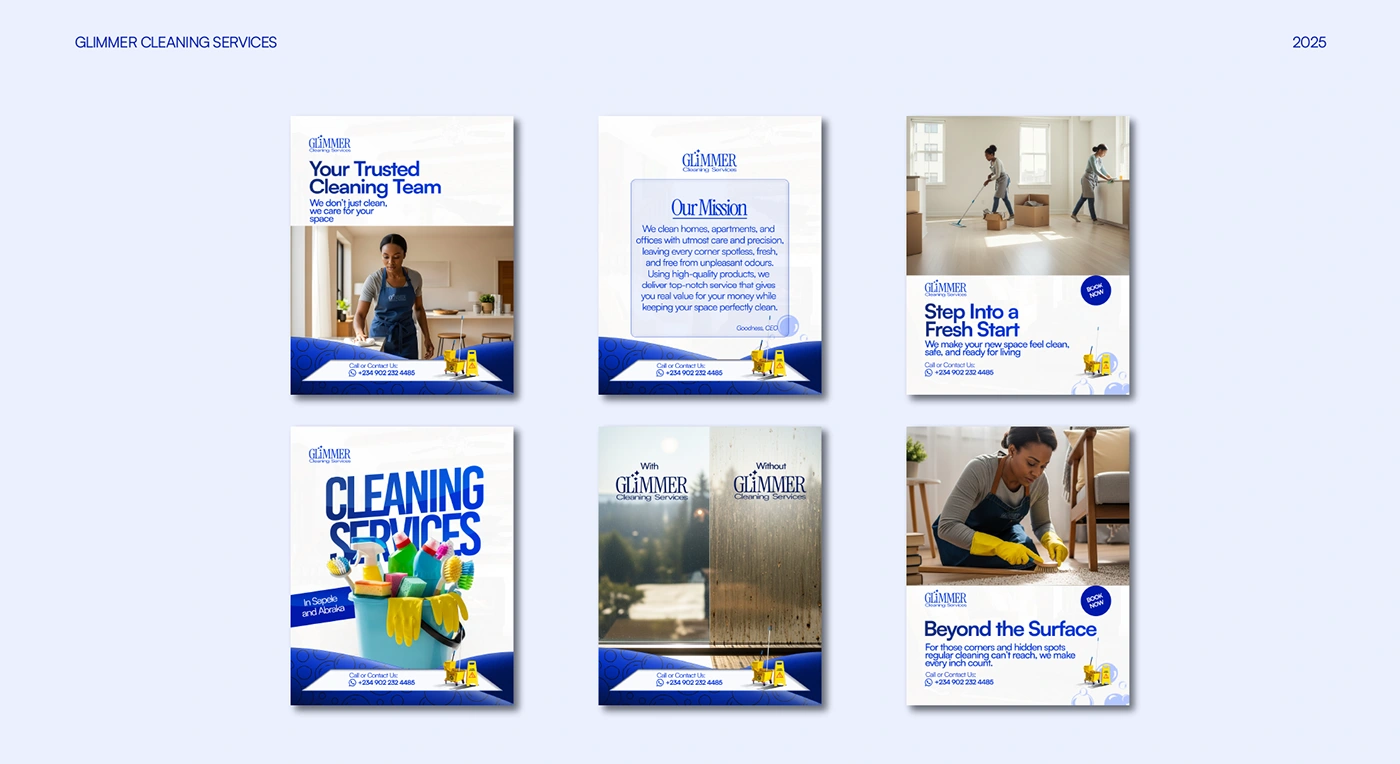 I designed the brand identity for Glimmer cleaning services: Logo design, social media marketing flyers for print and web, as well as brand guidelines pdf that…