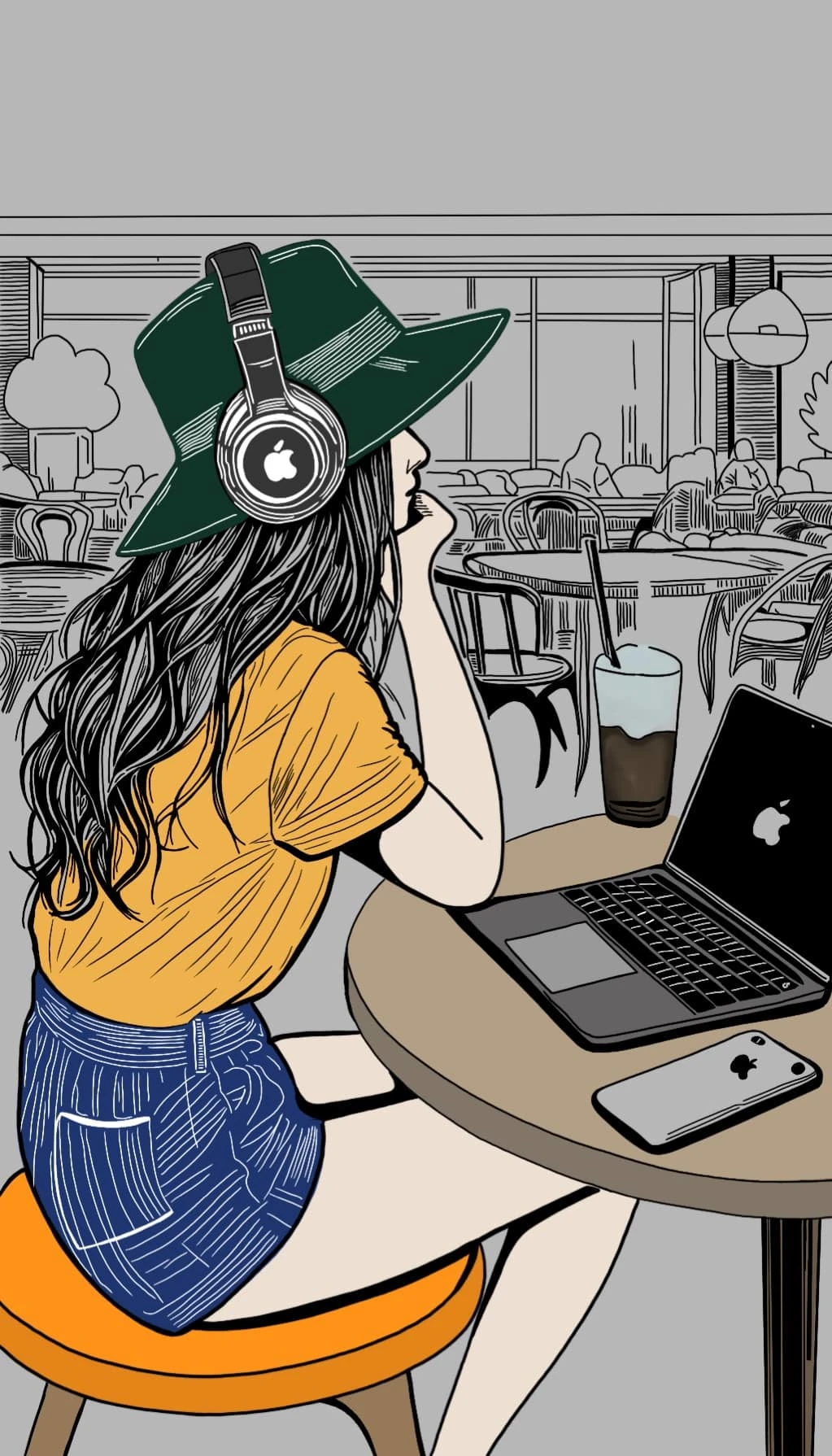 Illustration capturing a relaxed cafe scene with Apple branding. Detailed hair texture, casual styling, and calm background evoke modern digital life.