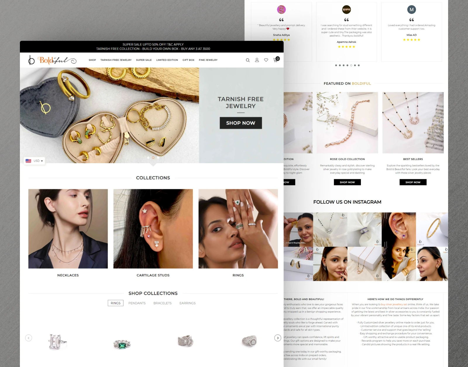 Boldiful is a modern Shopify jewelry store focused on tarnish-free designs and effortless shopping. The goal was to create a smooth, elegant experience that lets products shine and converts visitors into buyers.