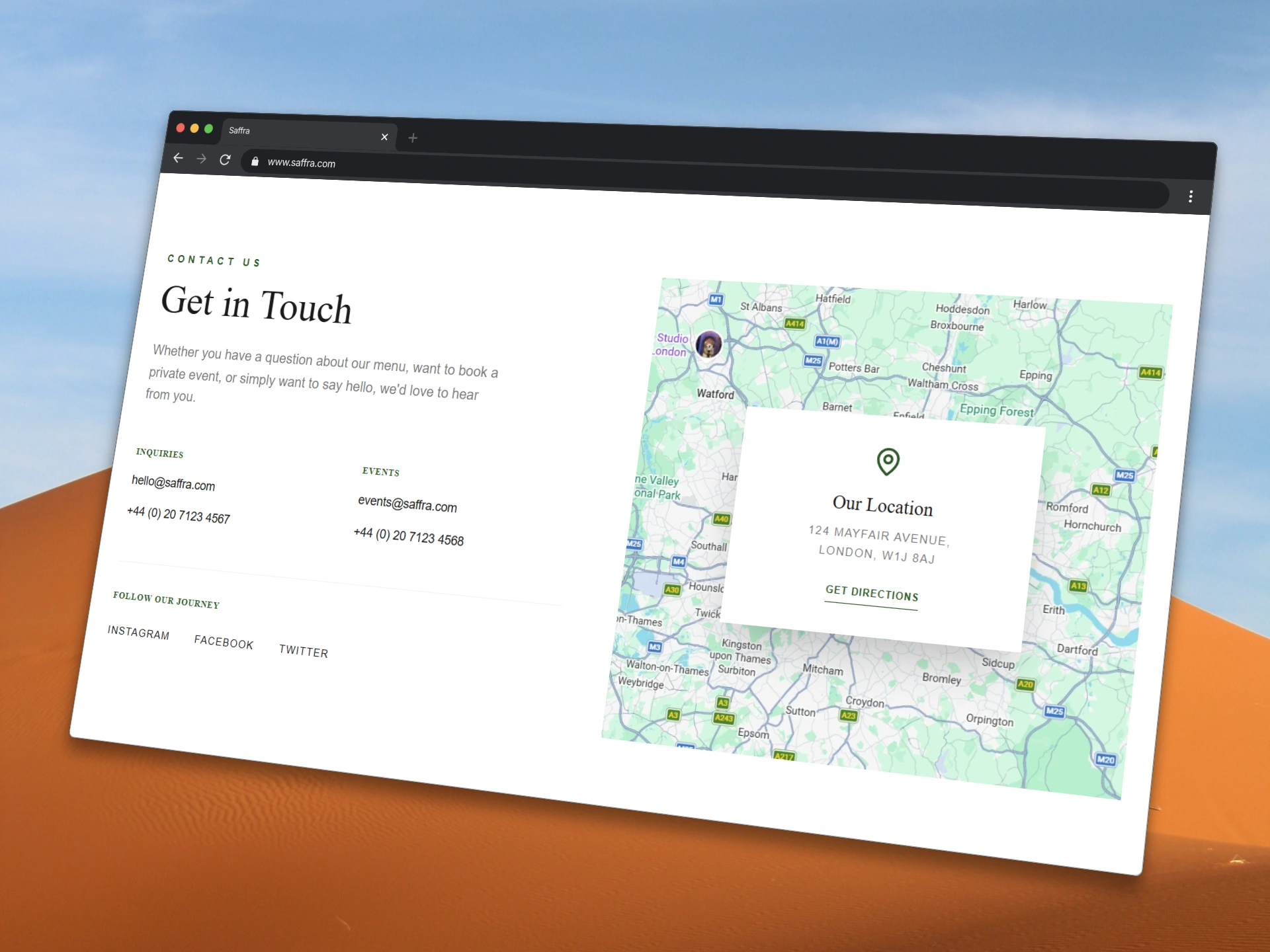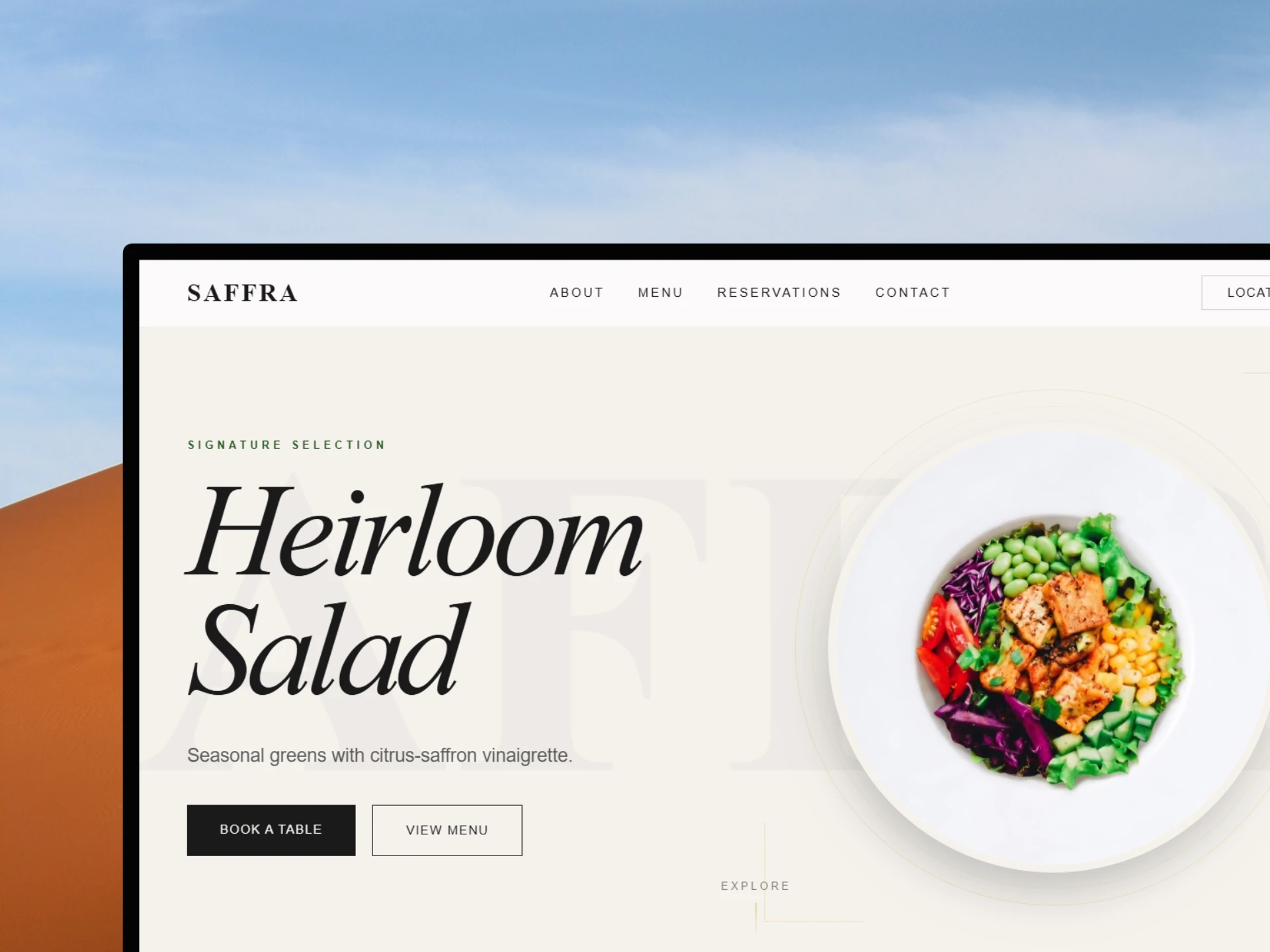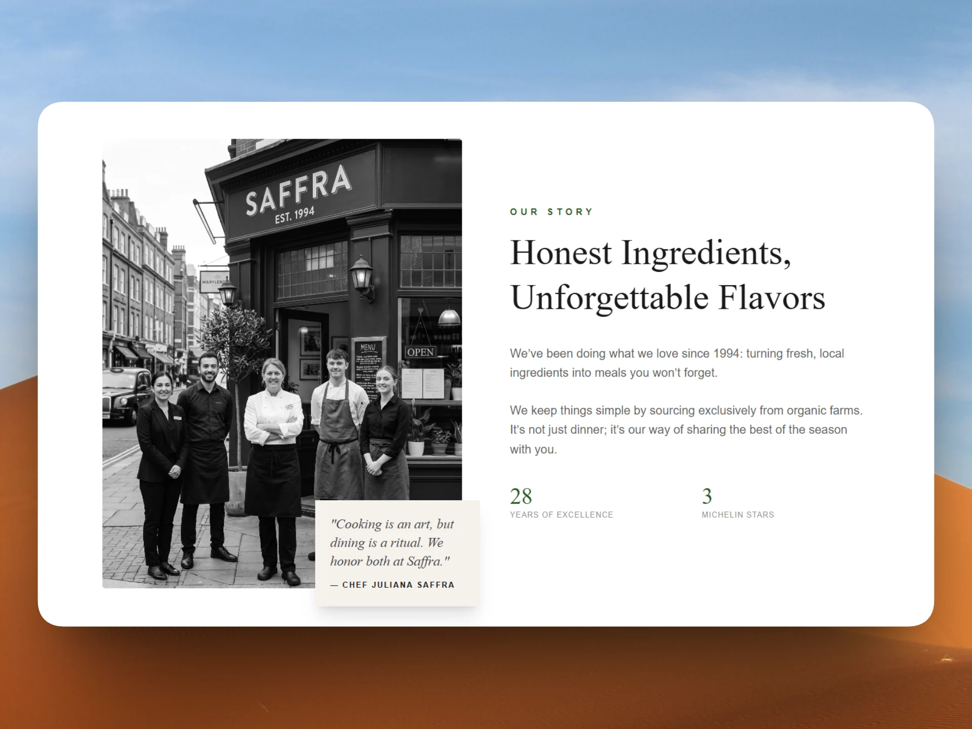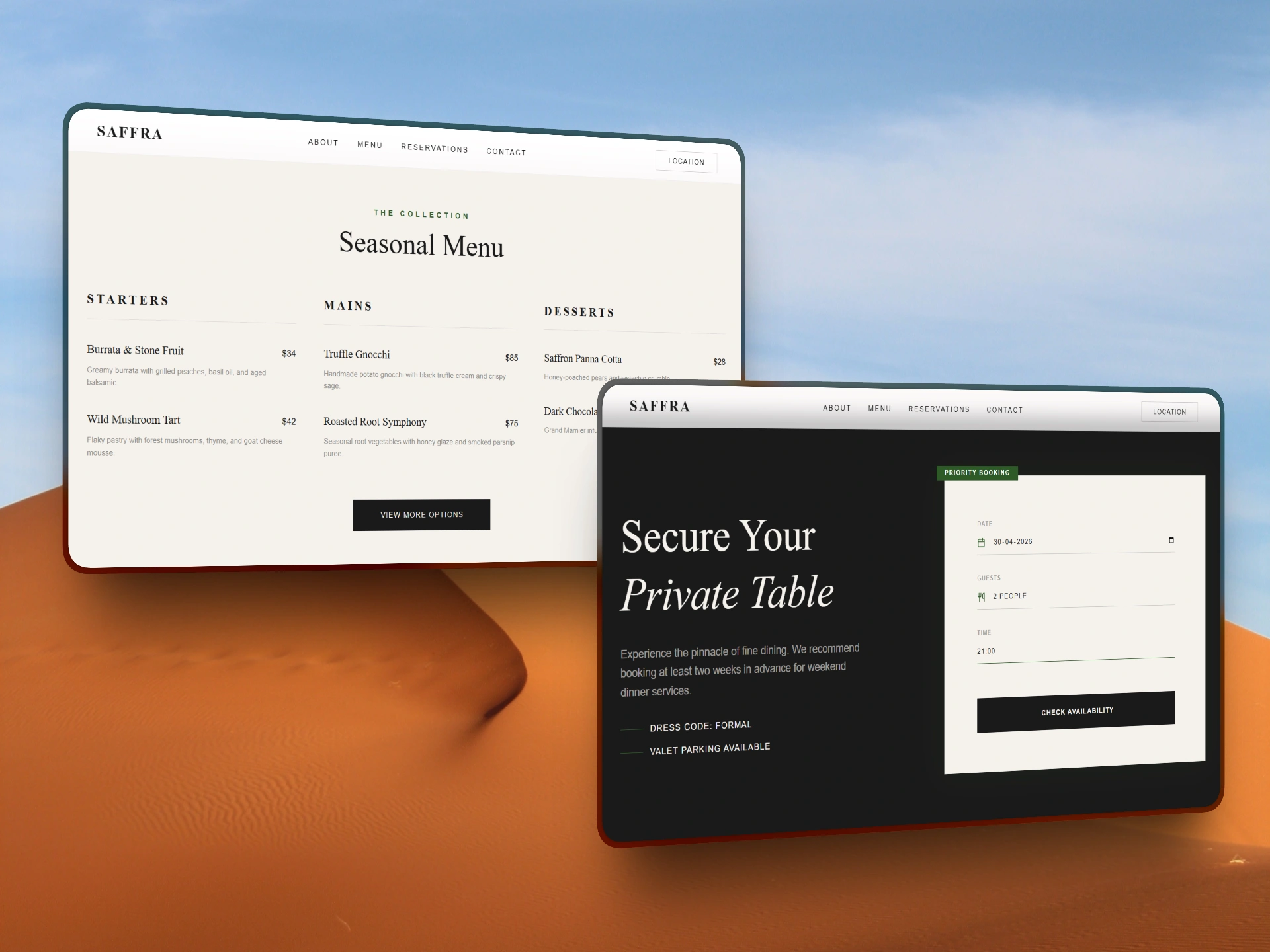 Saffra is a modern restaurant website designed to deliver a clean, elegant, and high-end dining experience online. The focus was on creating a visually refined interface that builds trust and encourages reservations.