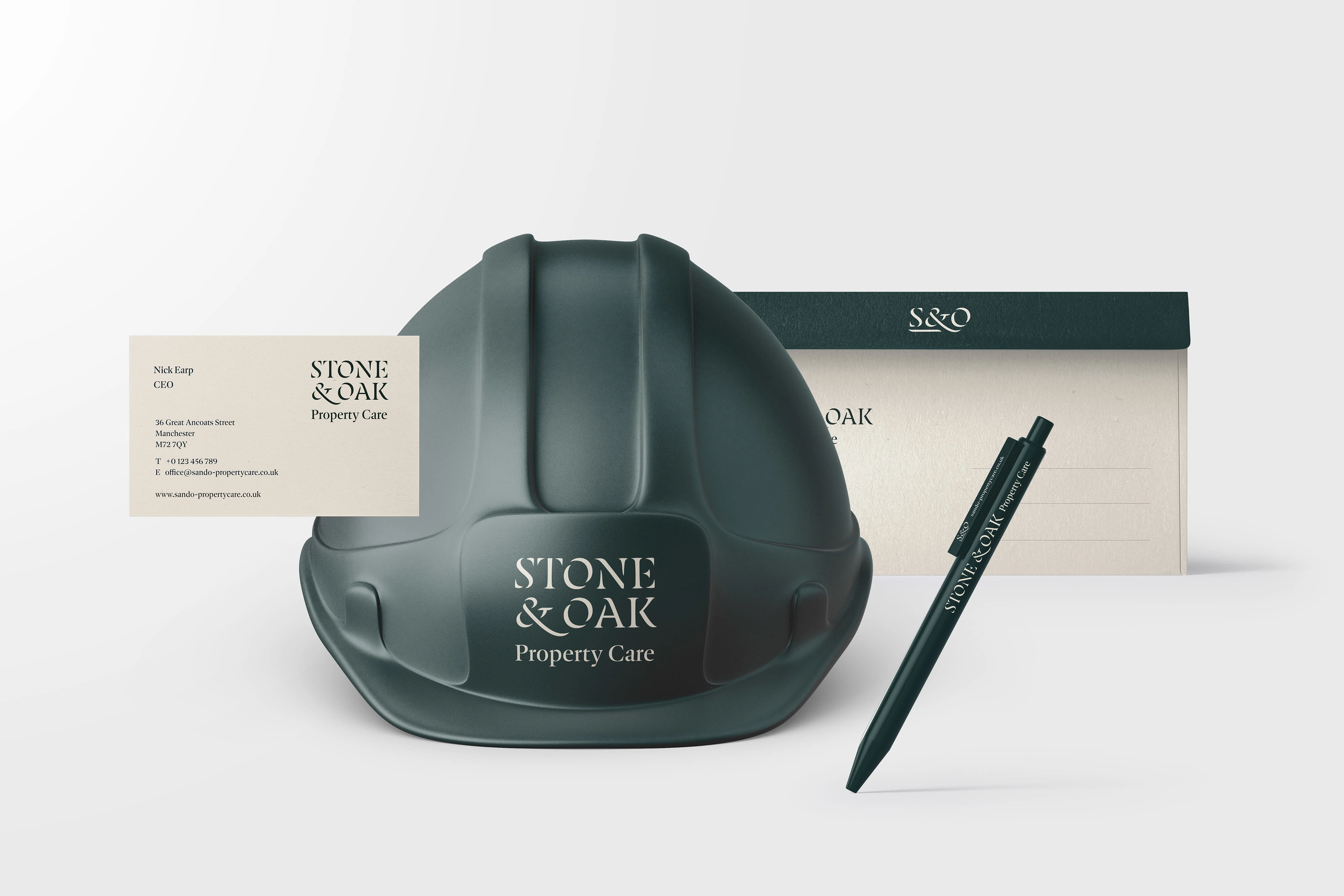 I created a brand identity for Stone & Oak, a professional property care and home maintenance company serving affluent homeowners.