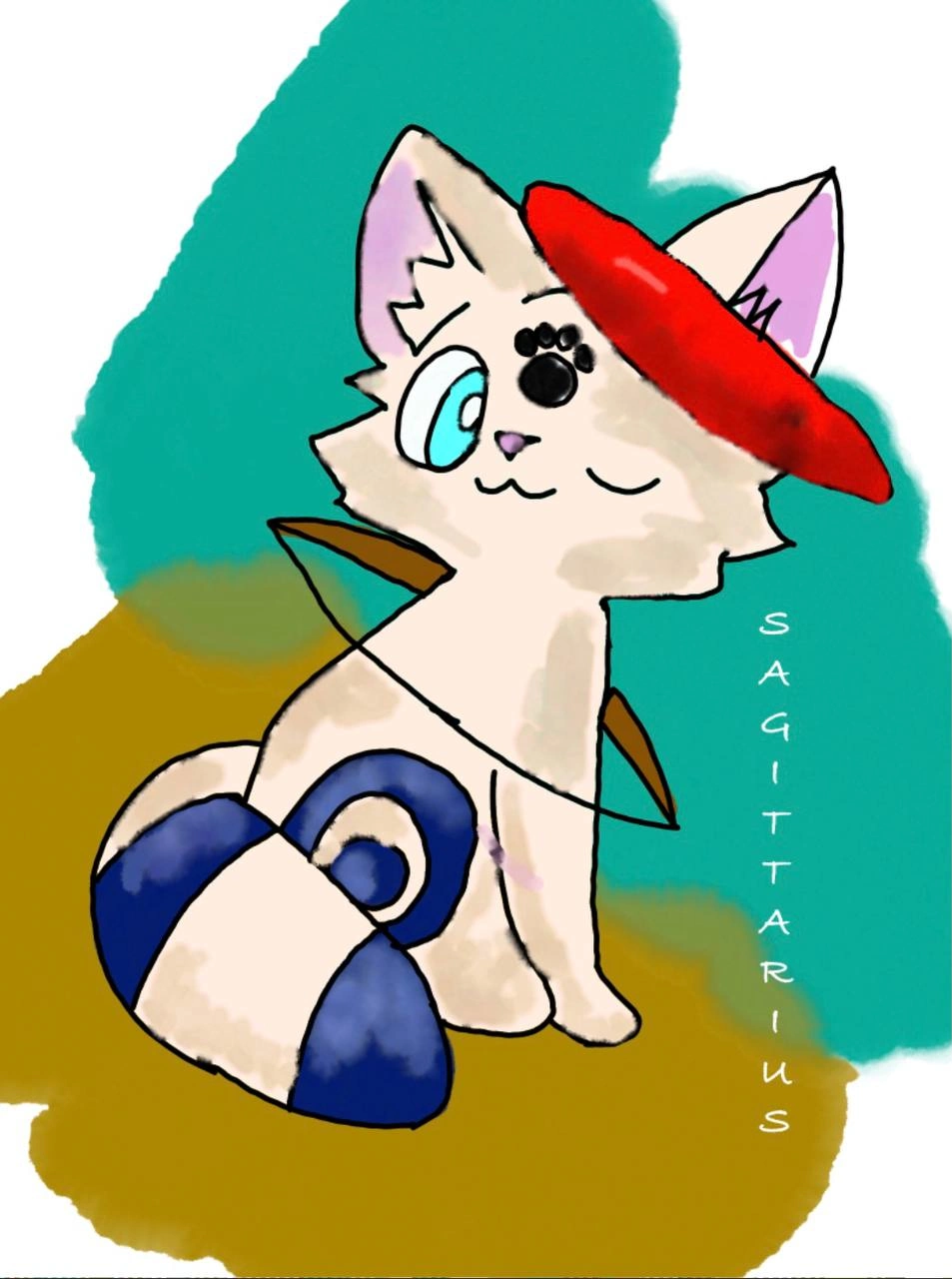 A playful, imaginative take on the Sagittarius zodiac — reimagined as a charming cartoon cat with symbolic elements