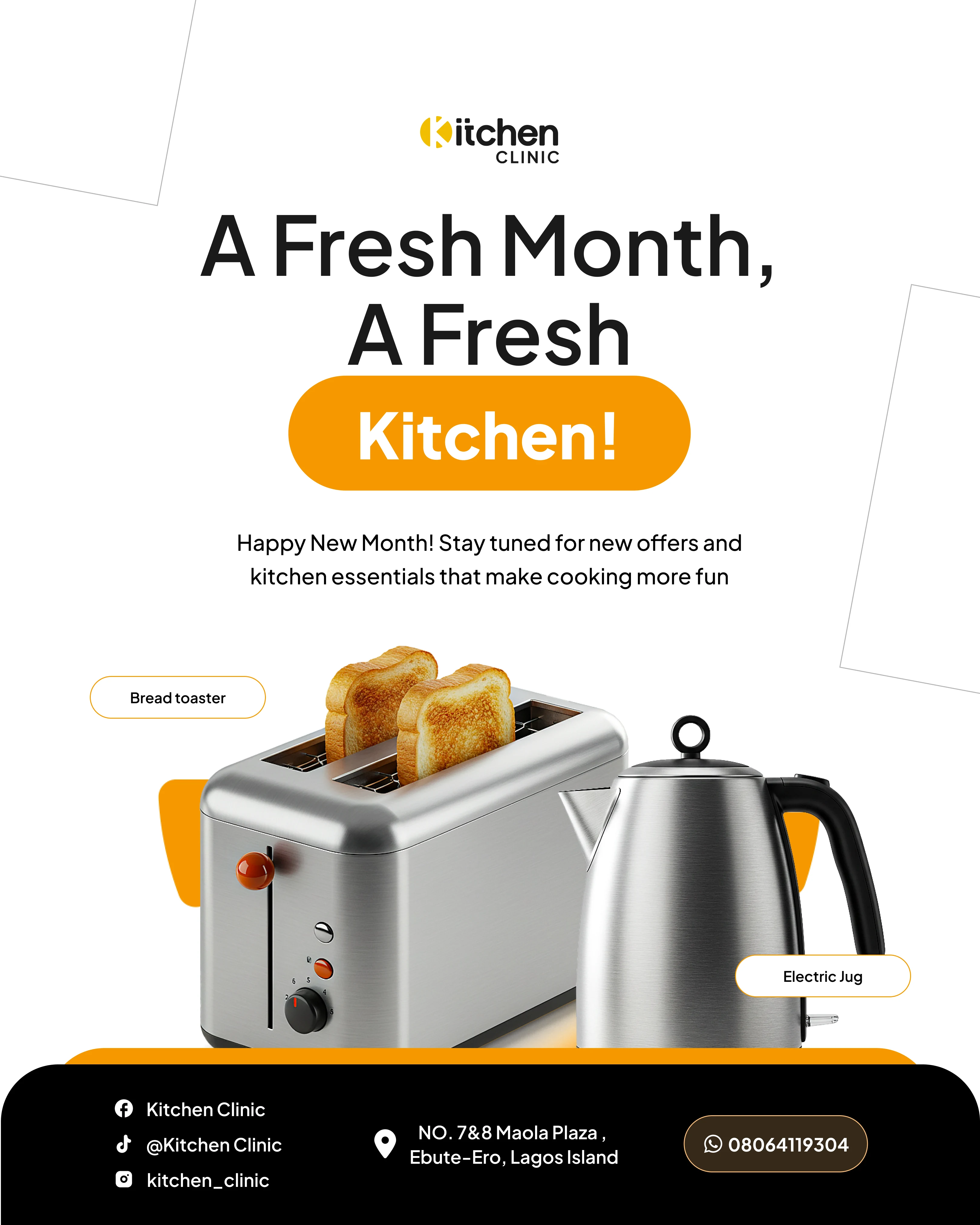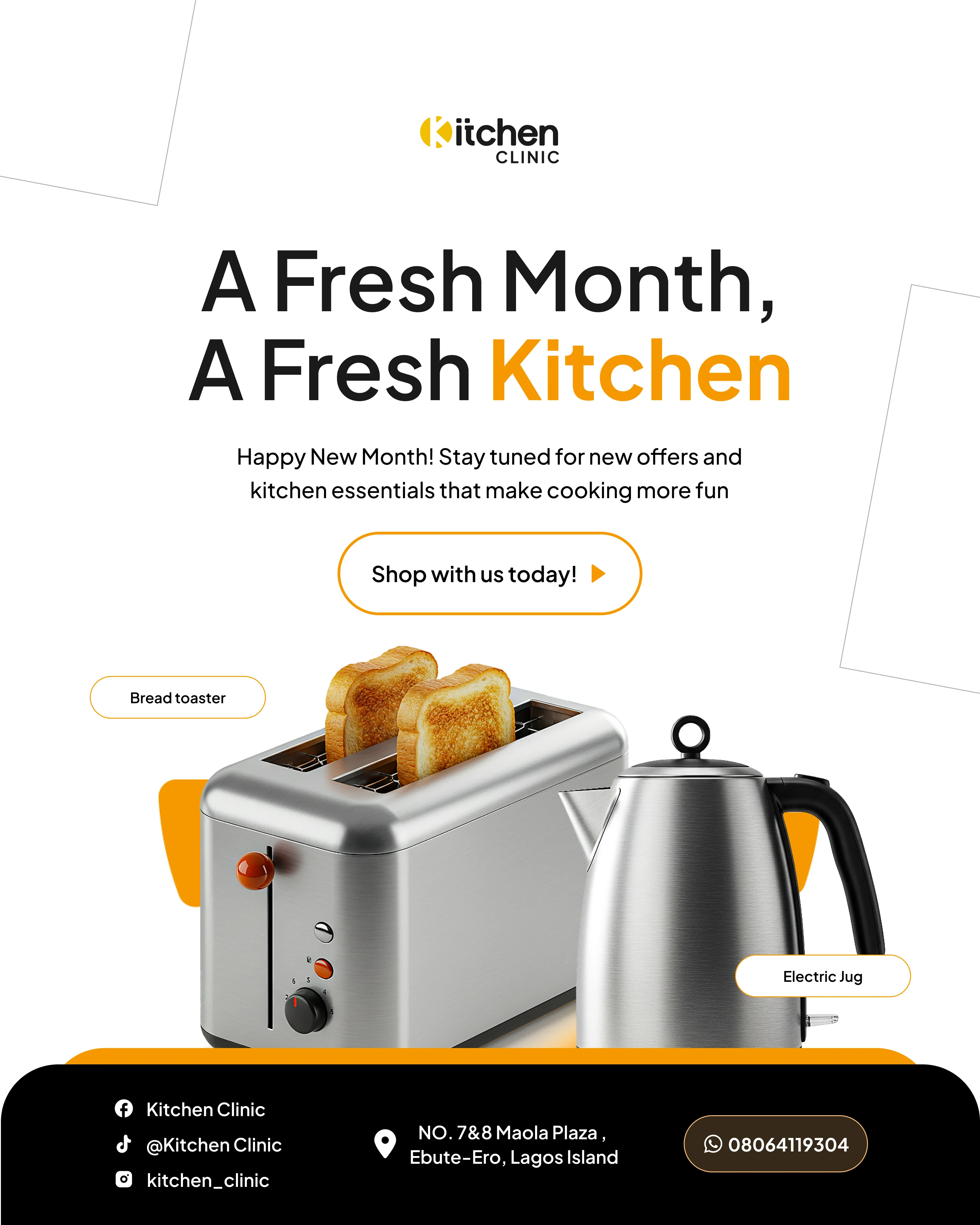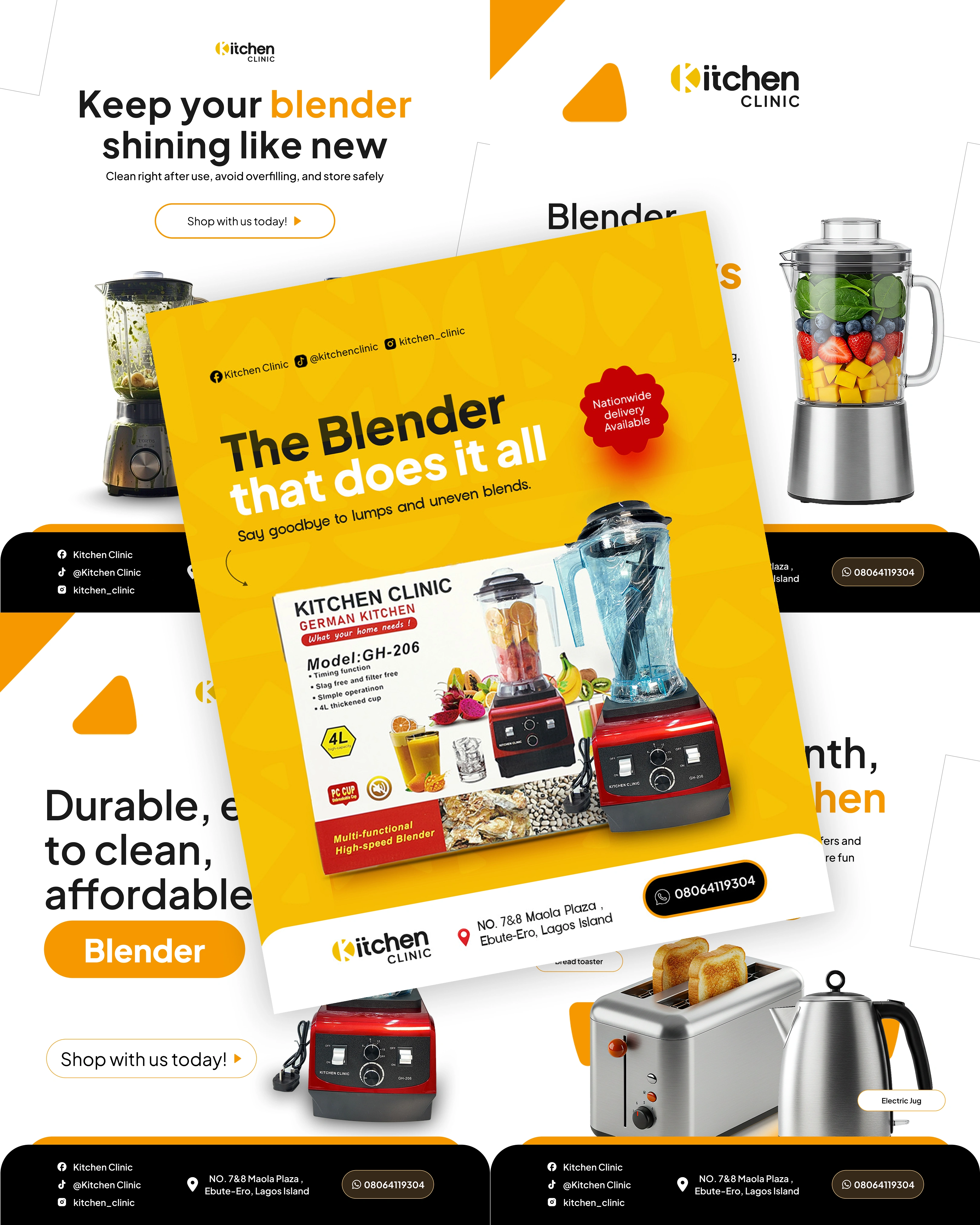 Project Description: Kitchen Clinic - Multi-Product Ad Campaign The Client: Kitchen Clinic, a retailer specializing in high-quality kitchen appliances (blenders, toasters, kettles). The Goal: To design a cohesive and engaging set of digital flyers and social media assets to drive immediate sales and improve brand perception of quality and reliability. My Solution (Creative Strategy): Brand Consistency: Maintained a clean, modern aesthetic with a consistent orange/white/black color palette across all assets (blender, toaster, kettle ads). Highlighting Benefits: Used clear, benefit-driven headlines (e.g., "Keep your blender shining like new," "Durable, easy to clean, affordable"). Visual Hierarchy: Used dynamic layout angles and bold product placement to draw the eye to the hero product (the blender) and key information (contact, address, CTAs). Clear CTAs: Incorporated immediate "Shop with us today!" and phone number placement for conversion tracking.